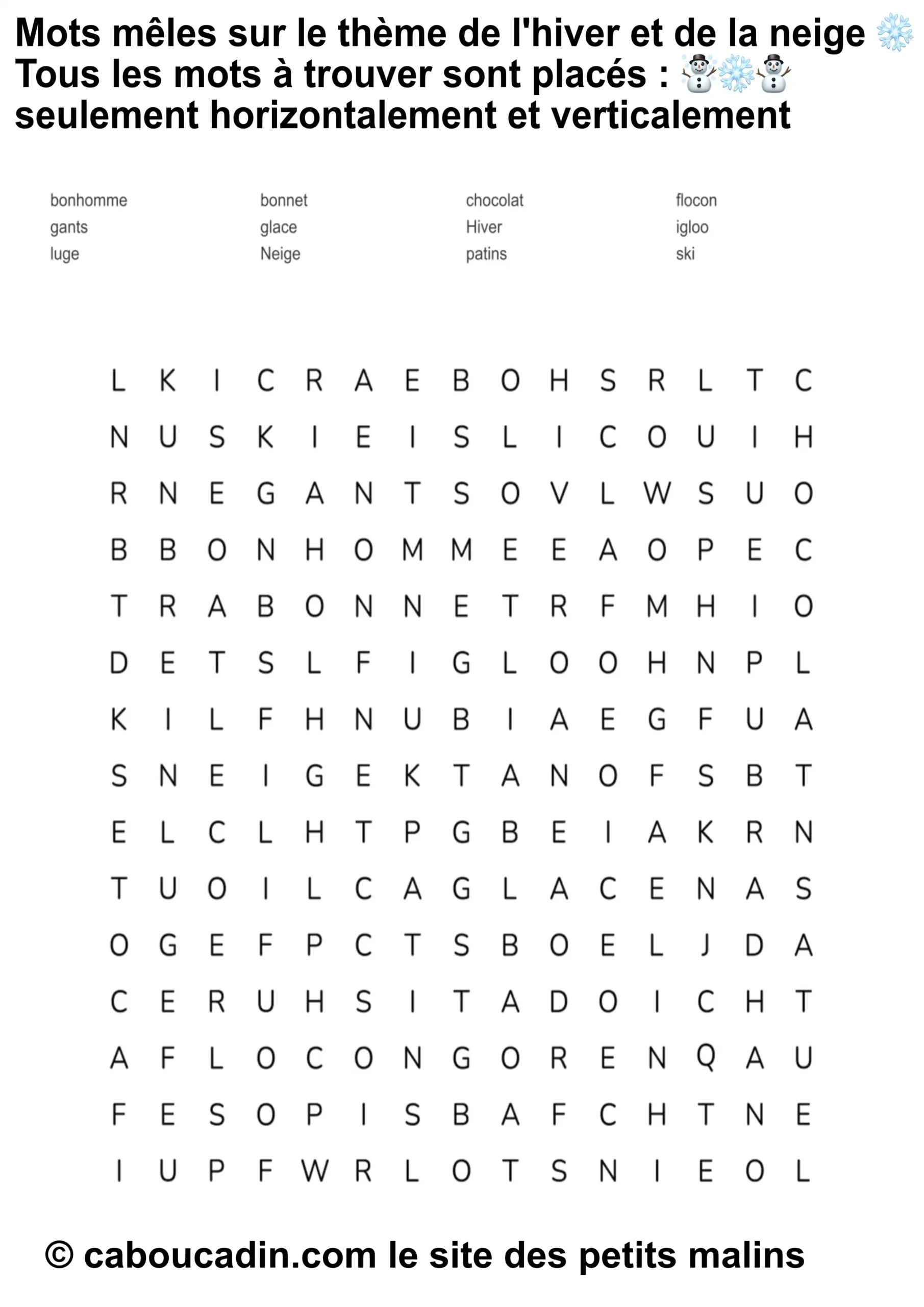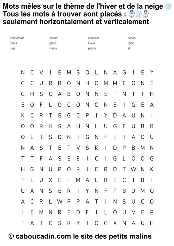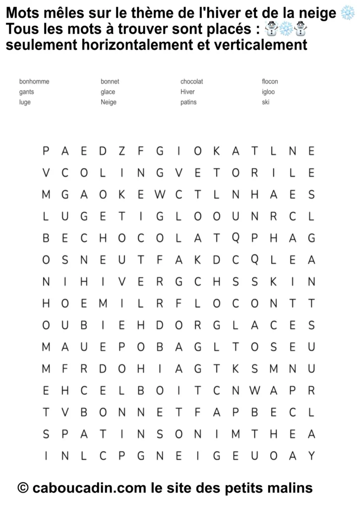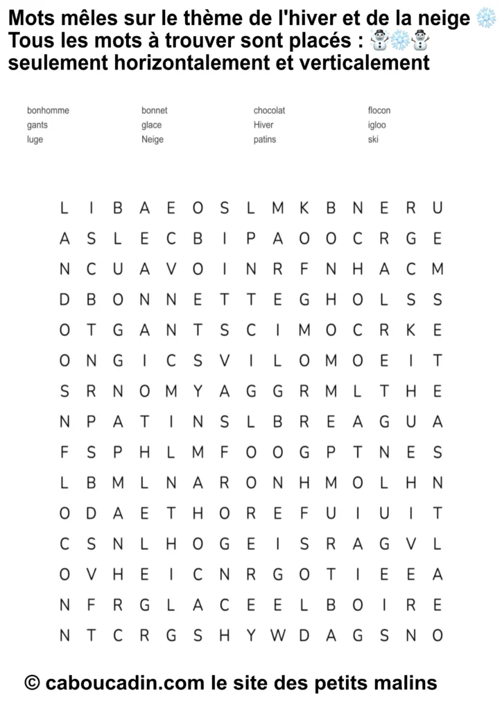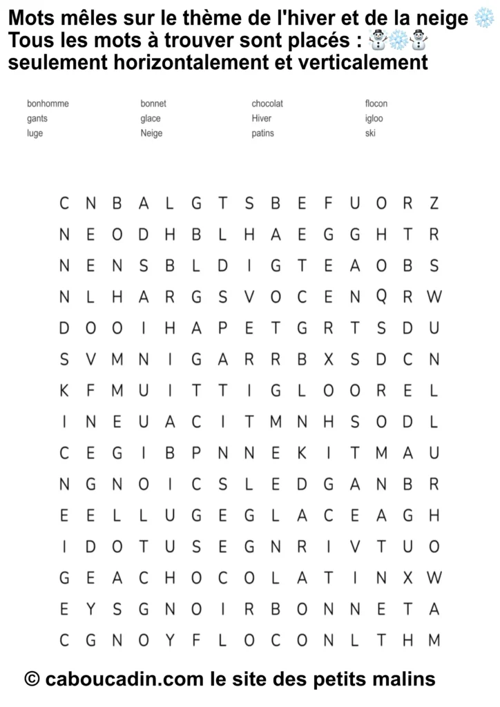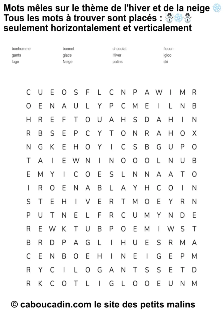On dirait un tapis de neige, tout blanc, tout propre, comme si personne n’avait encore marché dessus. Et pourtant… oh là là ! Quand on regarde de plus près, on découvre que chaque lettre est comme un petit flocon tombé du ciel. Et certains flocons ont décidé de se déguiser en mots ! Oui oui, de vrais mots d’hiver, cachés comme des trésors gelés.