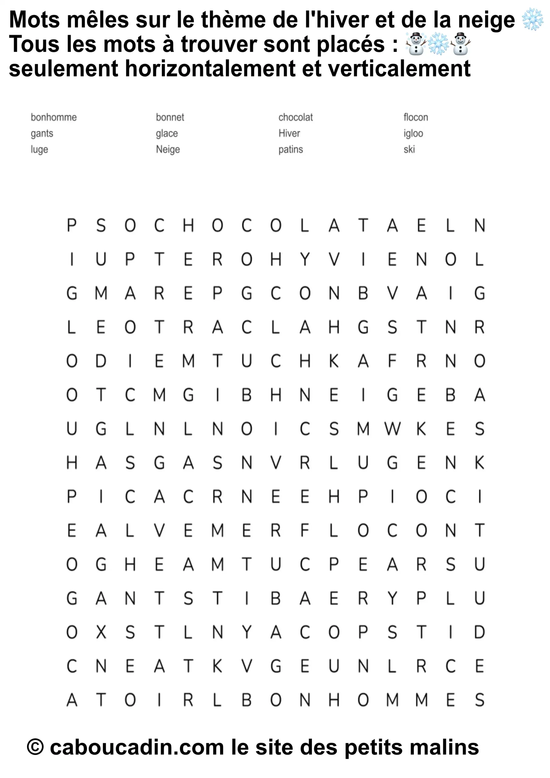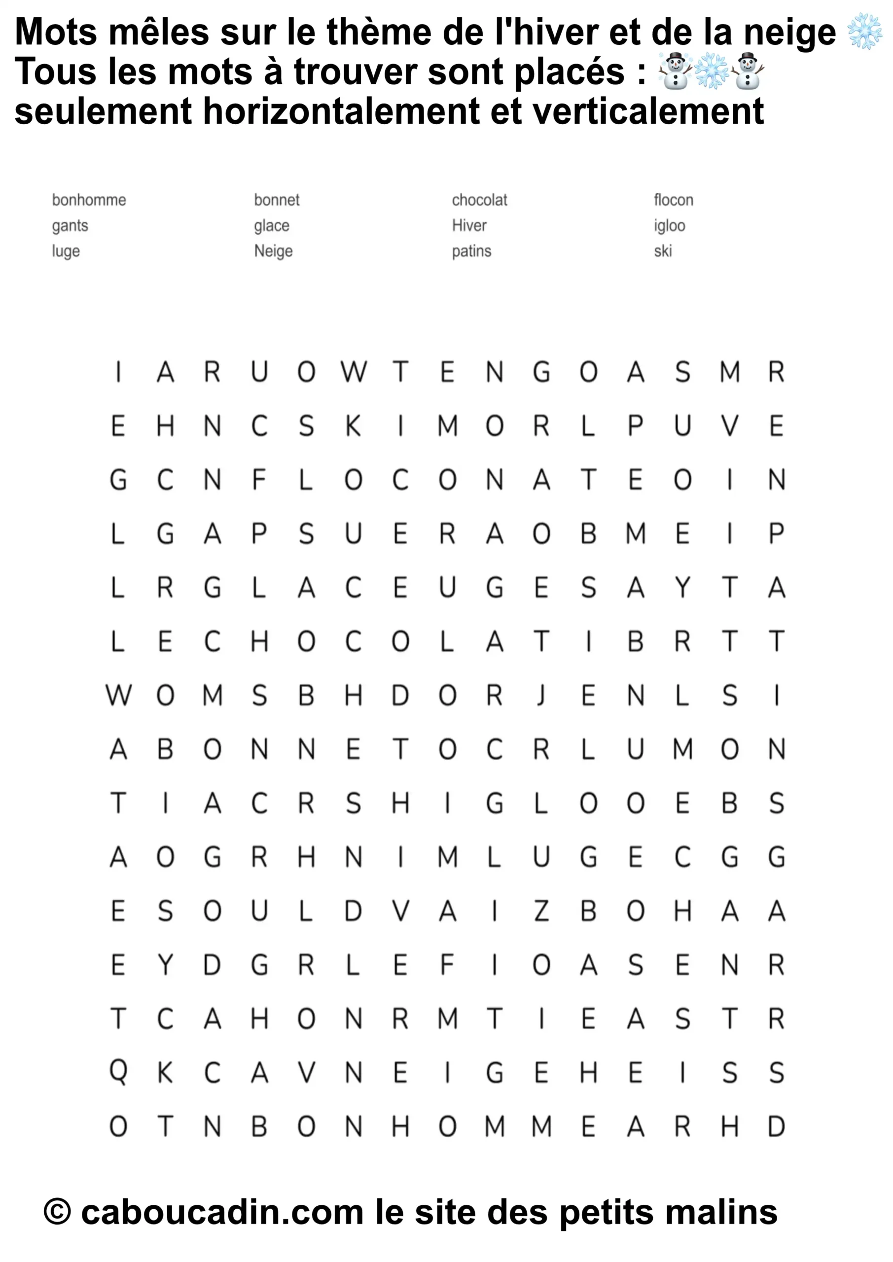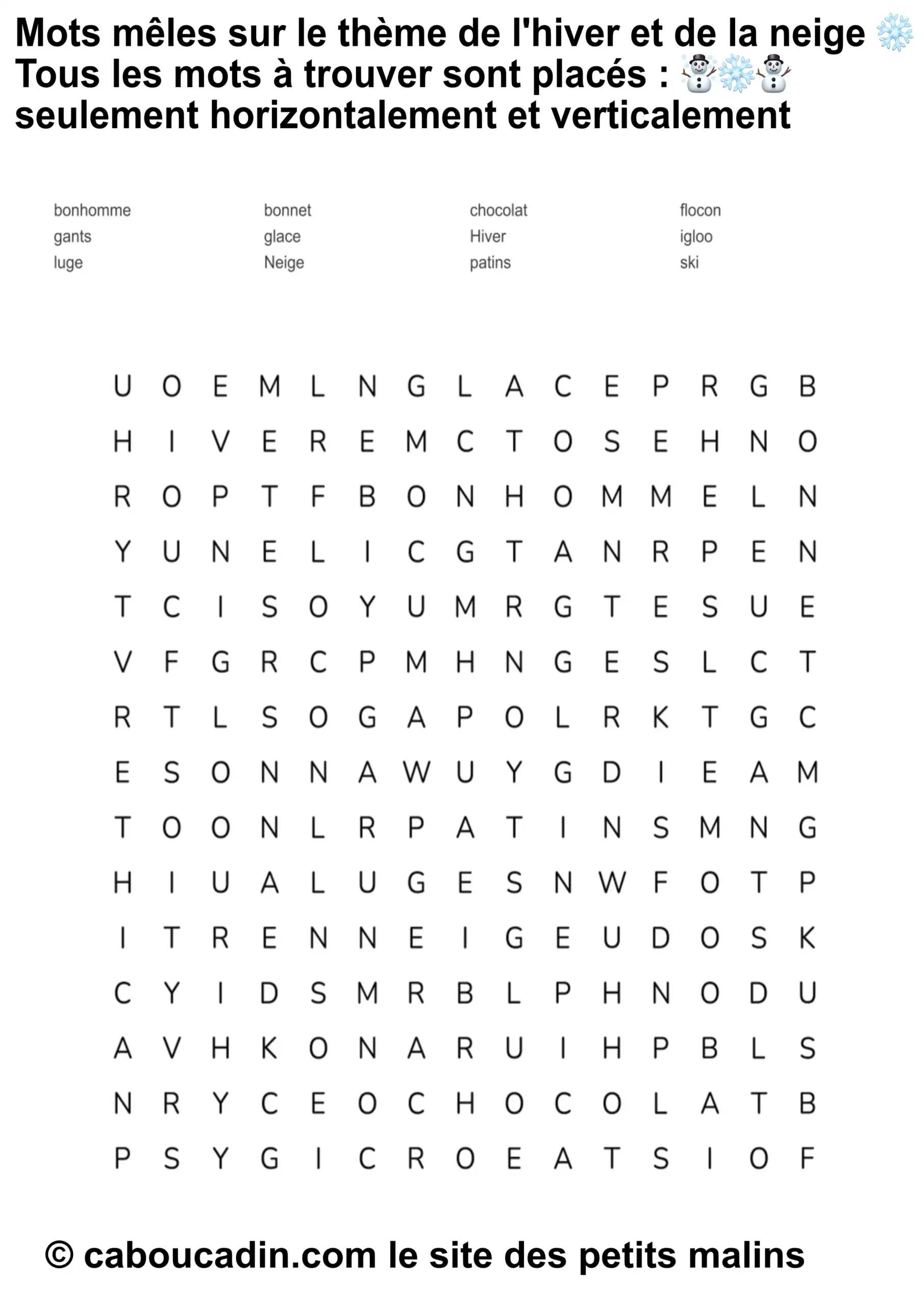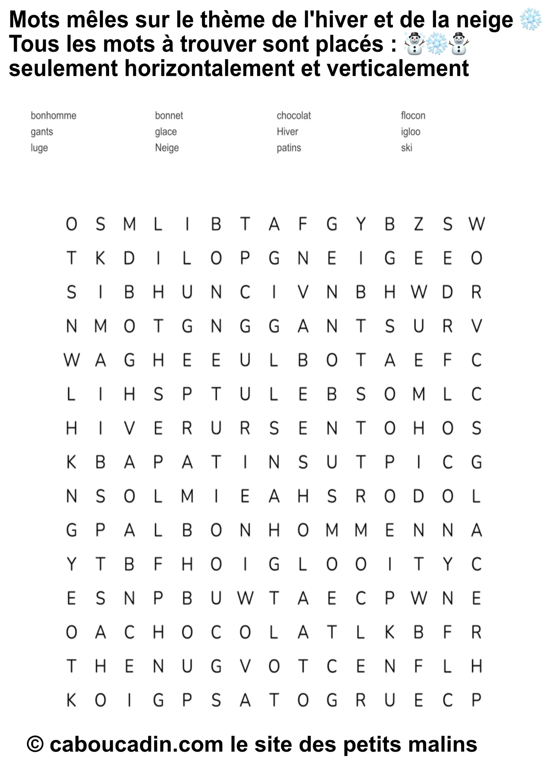 On dirait un tapis de neige, tout blanc, tout propre, comme si personne n’avait encore marché dessus. Et pourtant… oh là là ! Quand on regarde de plus près, on découvre que chaque lettre est comme un petit flocon tombé du ciel. Et certains flocons ont décidé de se déguiser en mots ! Oui oui, de vrais mots d’hiver, cachés comme des trésors gelés.