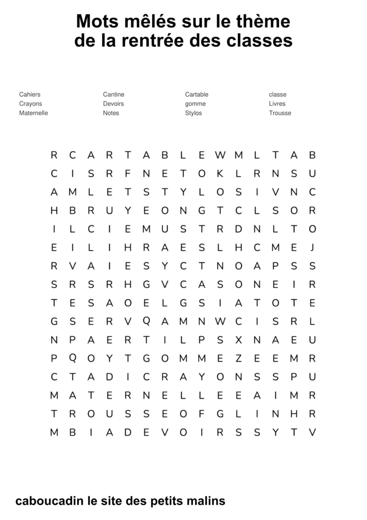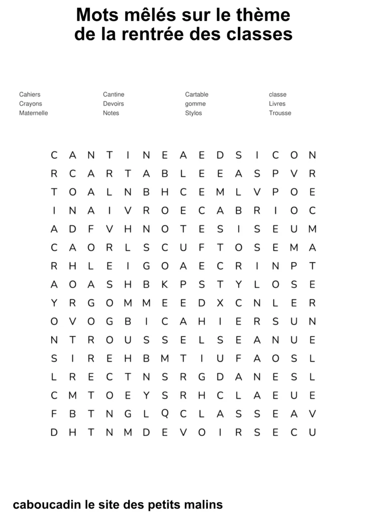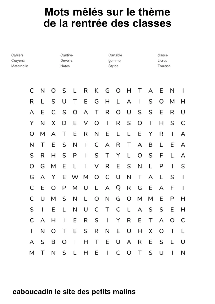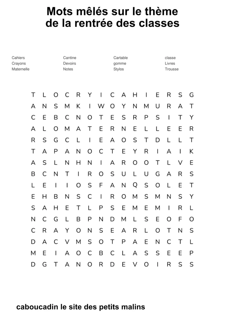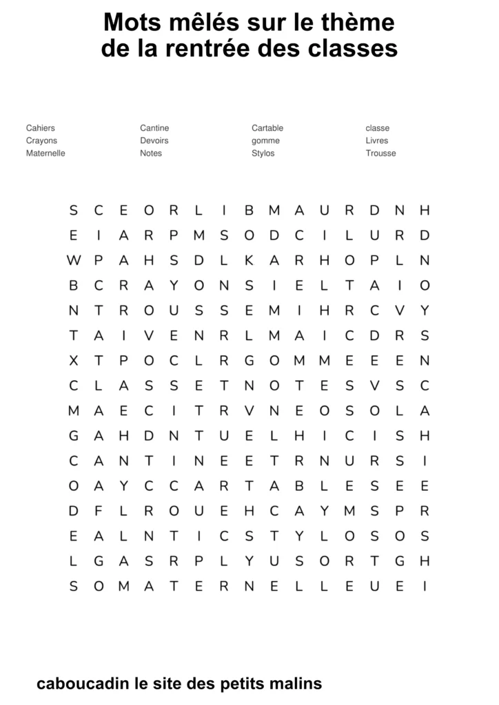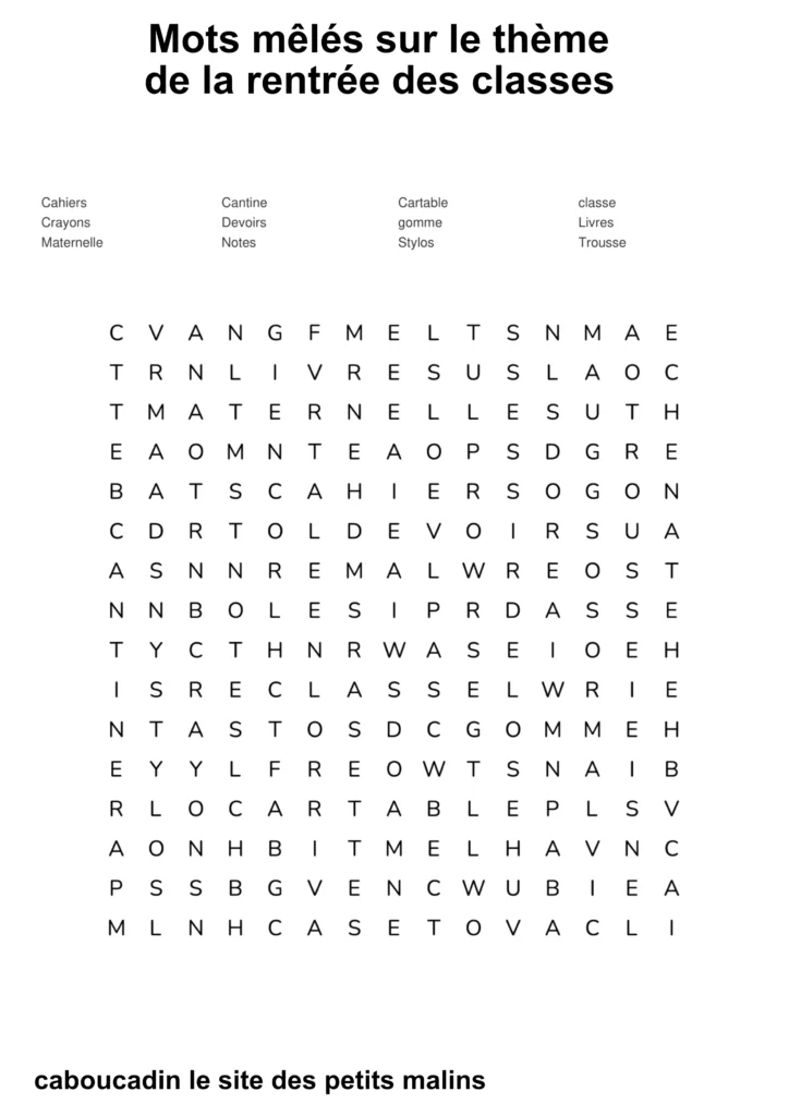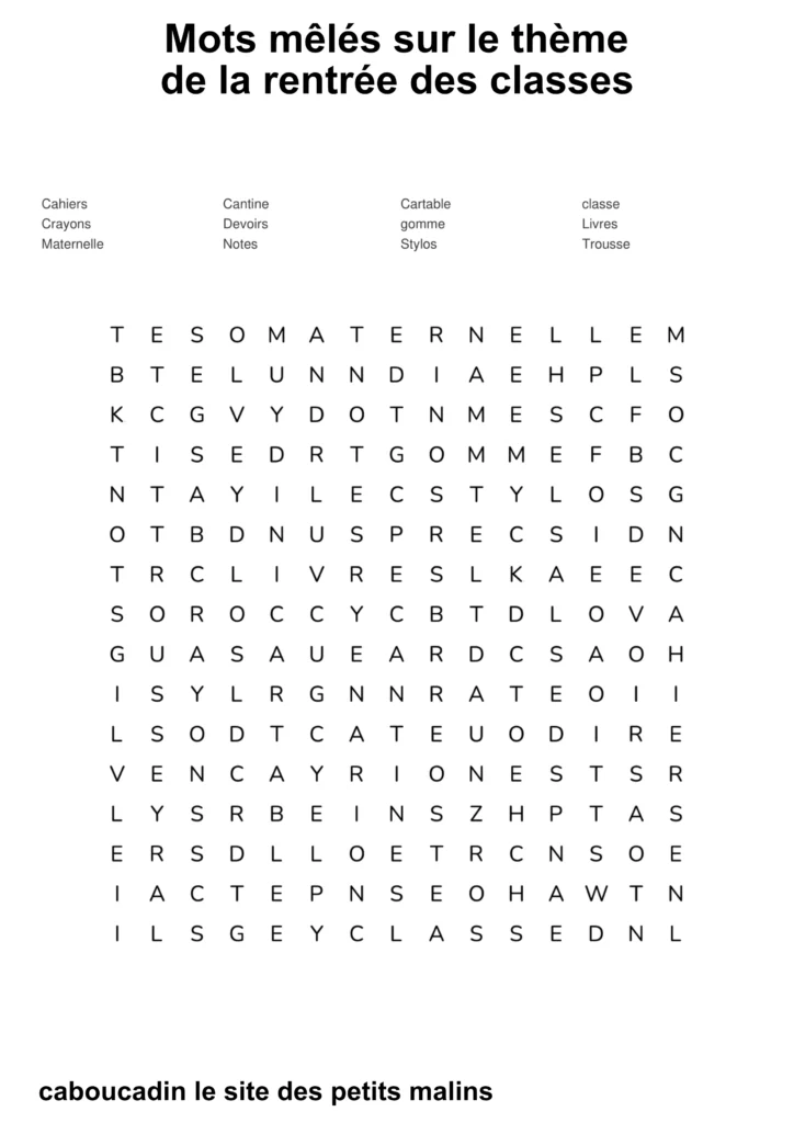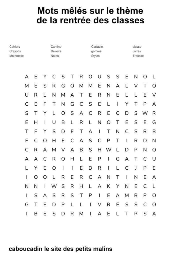 10 mots mêlés : la rentrée des classes. C’est la rentrée des classes ! Les cartables sont prêts, les crayons de couleur aiguisés, et les cahiers ne demandent qu’à être remplis de belles histoires. Pour fêter ce grand jour, nous t’avons préparé de super grilles de mots mêlés sur le thème de l’école !