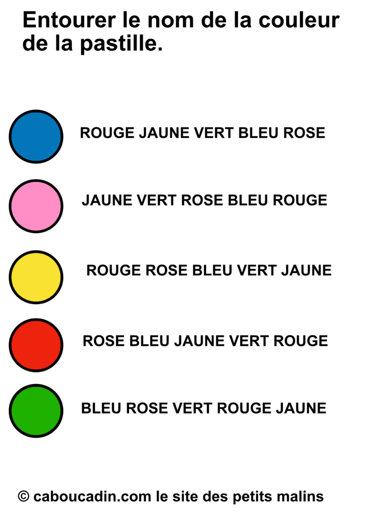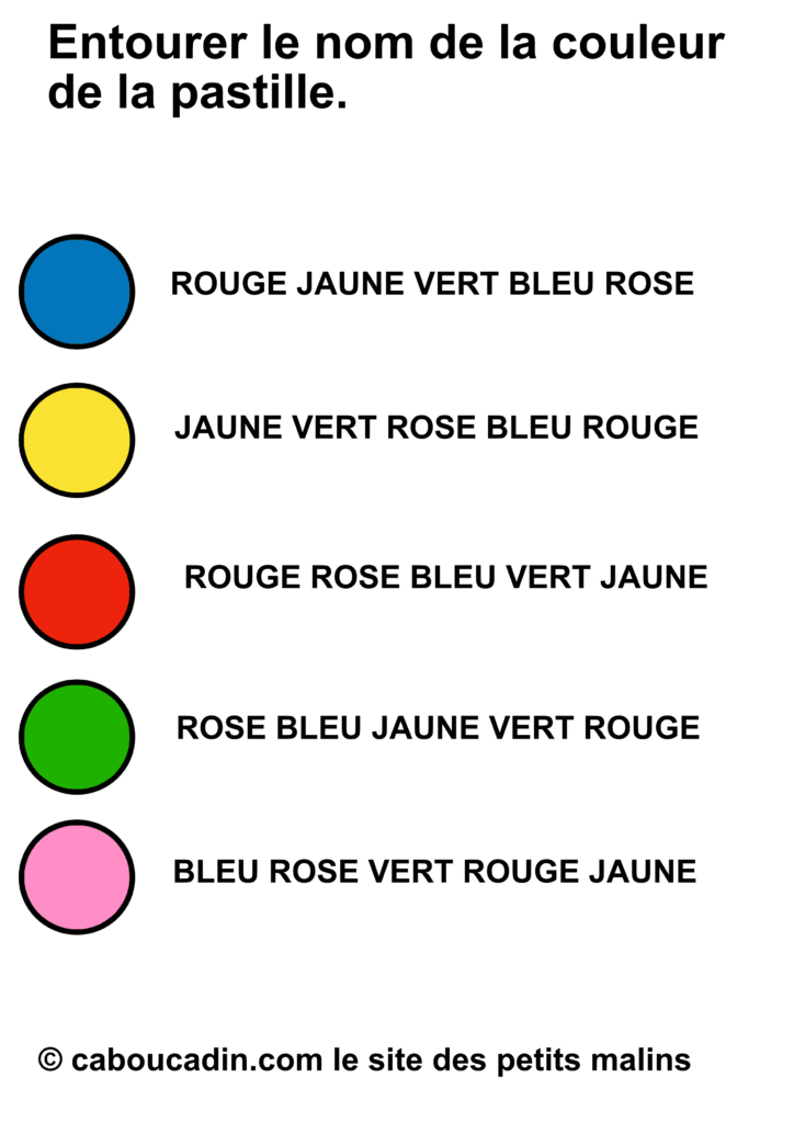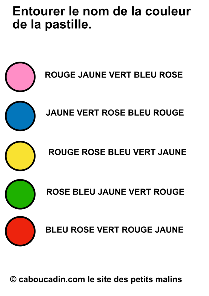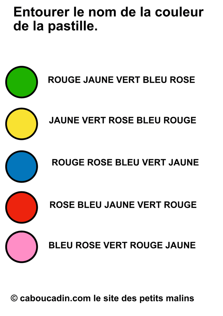 Et justement, juste à côté de chaque rond, on trouve une petite série de mots. Cinq mots écrits en lettres majuscules, bien grosses, pour qu’ils soient bien lisibles : ROUGE, JAUNE, VERT, BLEU, ROSE. Mais attention, ils ne sont pas toujours placés dans le même ordre ! Et ça, c’est fait exprès. Comme ça, l’enfant ne peut pas juste suivre la place, il doit vraiment chercher le bon mot.