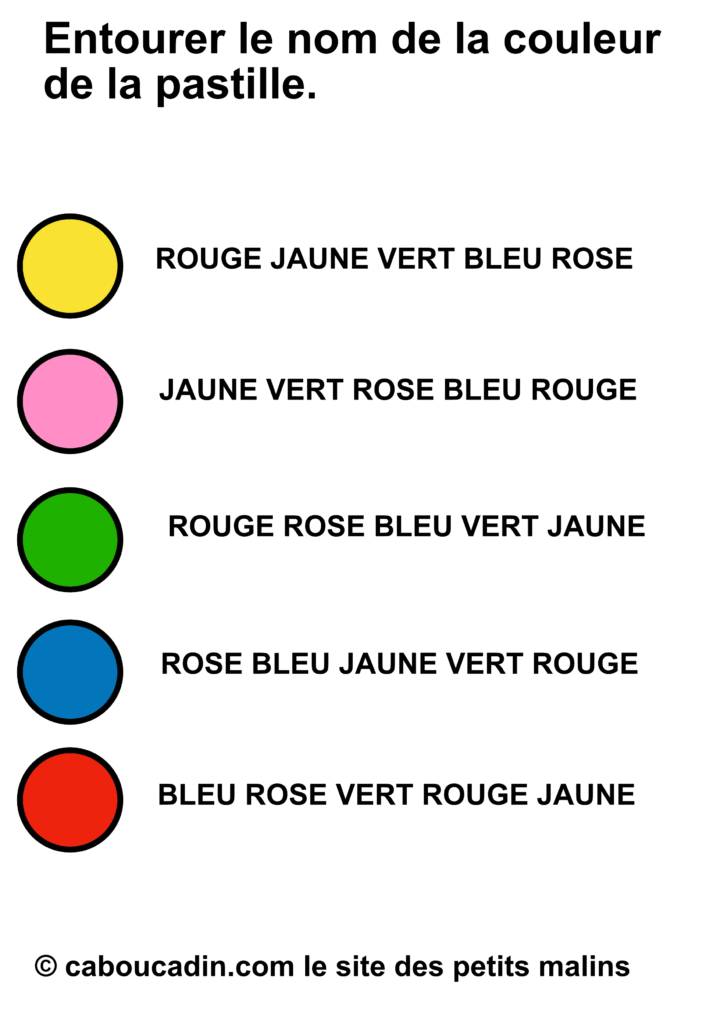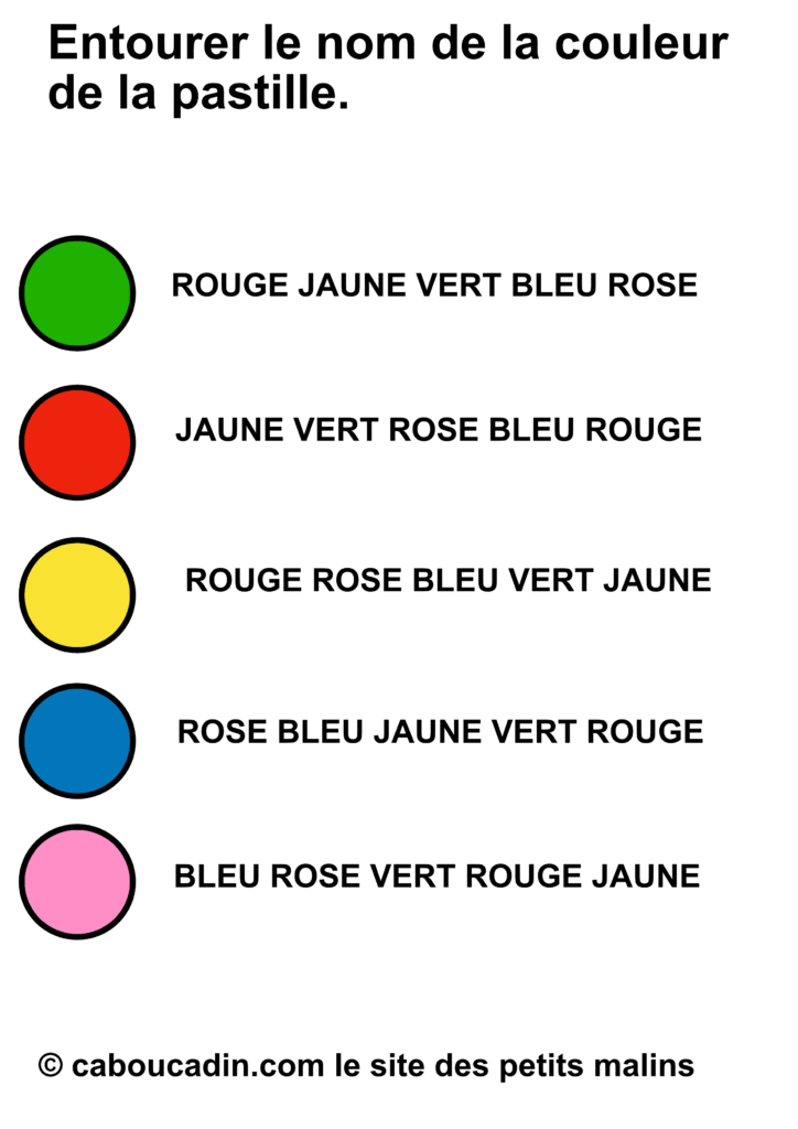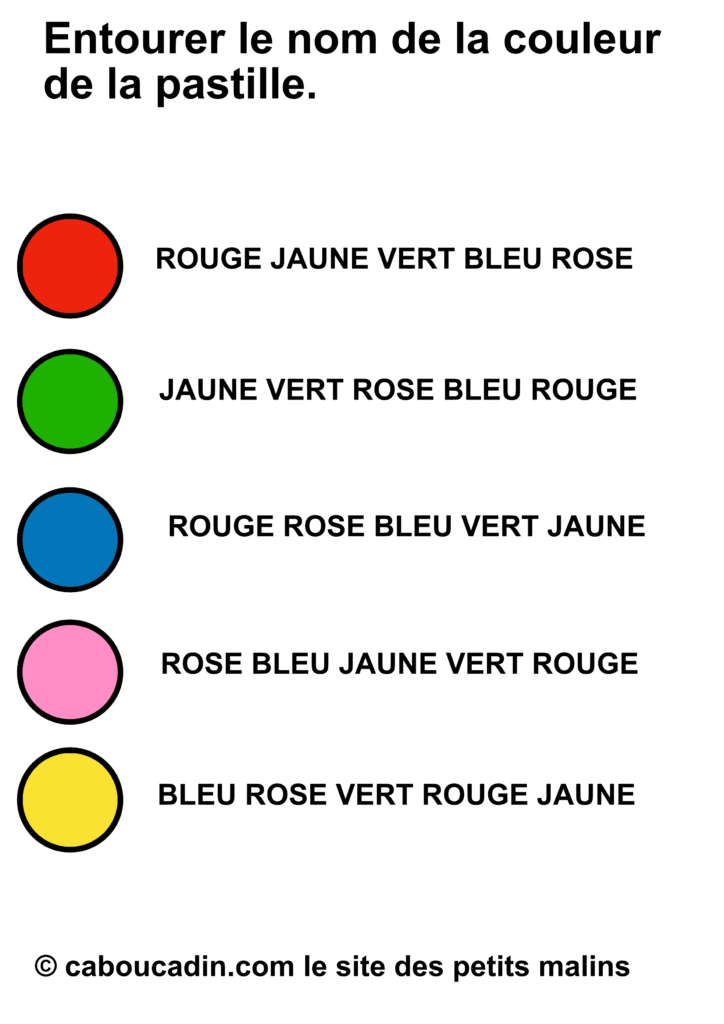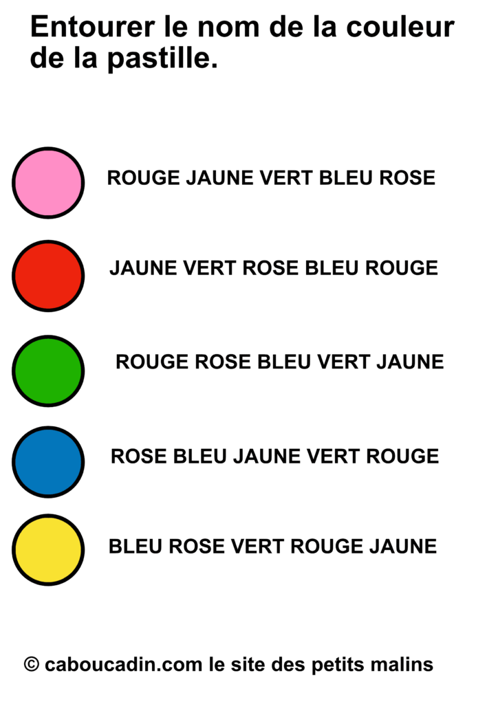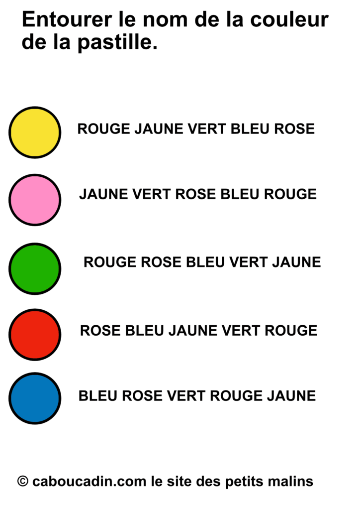 Et justement, juste à côté de chaque rond, on trouve une petite série de mots. Cinq mots écrits en lettres majuscules, bien grosses, pour qu’ils soient bien lisibles : ROUGE, JAUNE, VERT, BLEU, ROSE. Mais attention, ils ne sont pas toujours placés dans le même ordre ! Et ça, c’est fait exprès. Comme ça, l’enfant ne peut pas juste suivre la place, il doit vraiment chercher le bon mot.