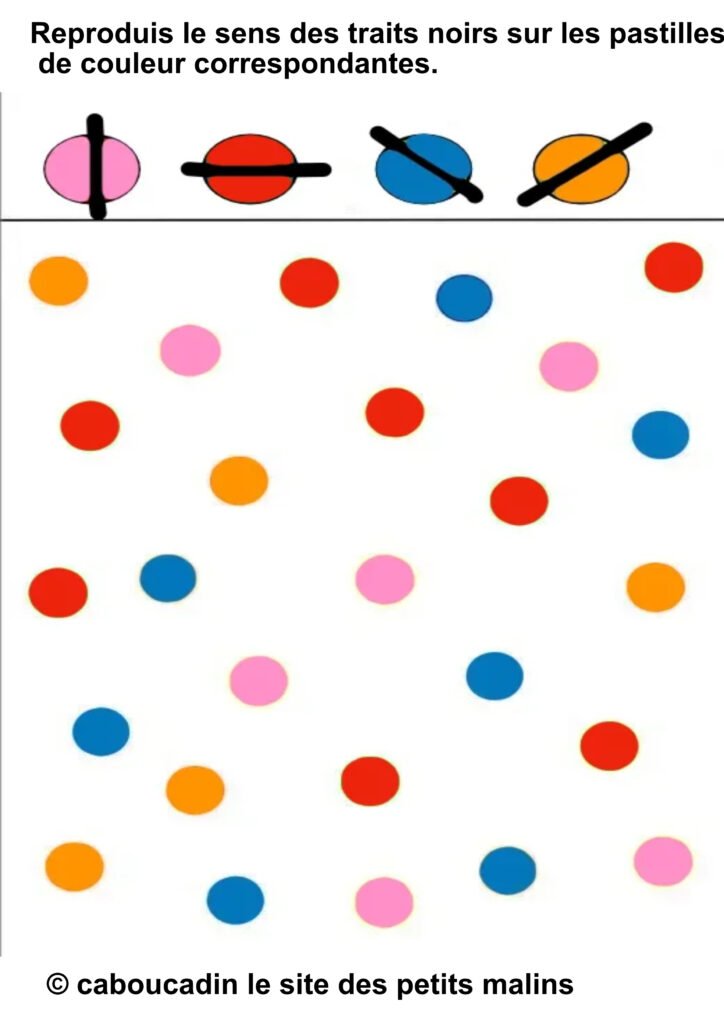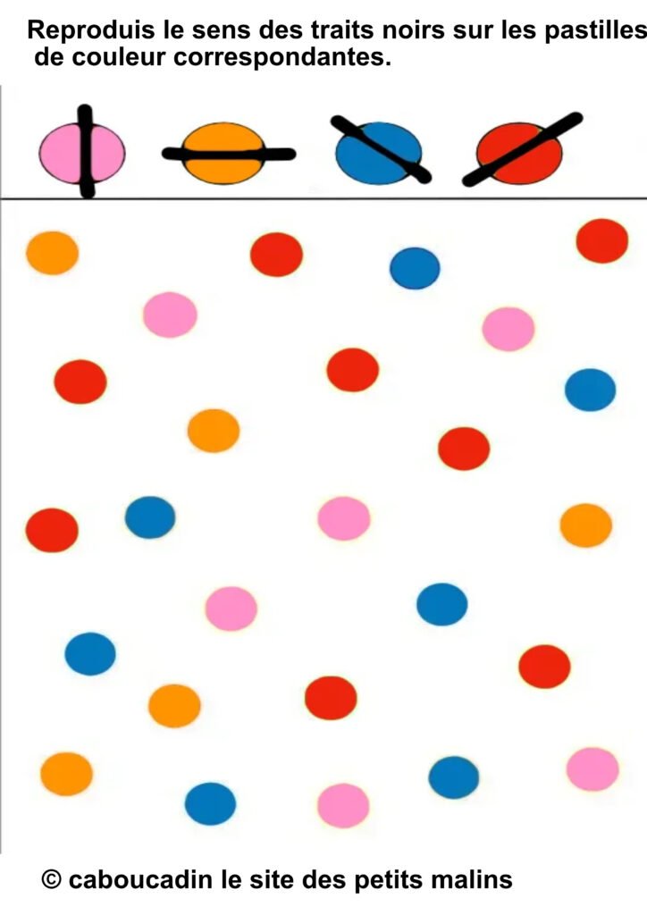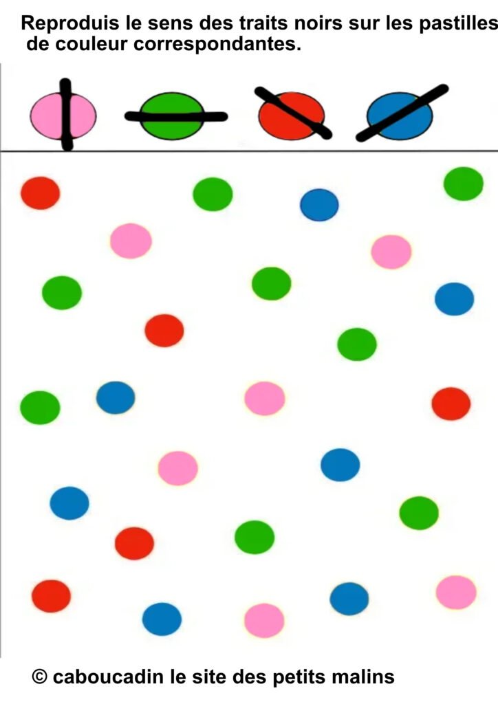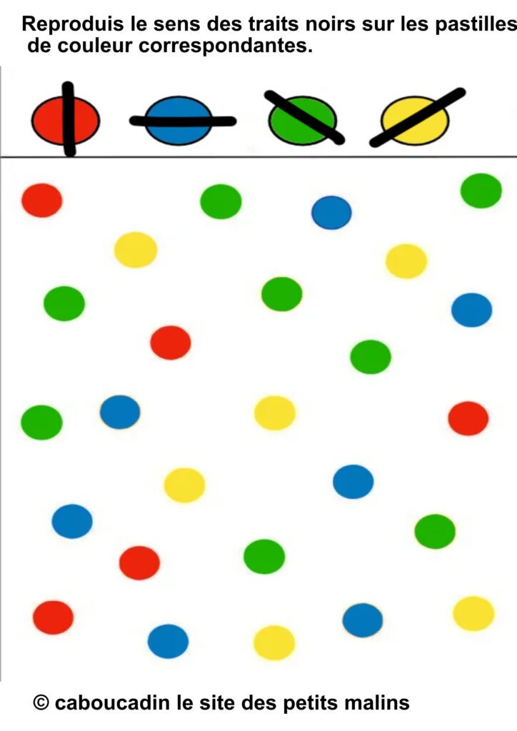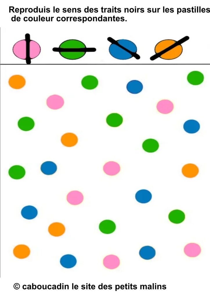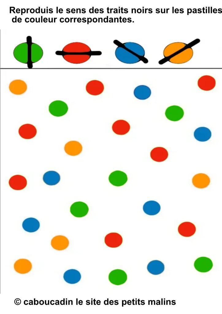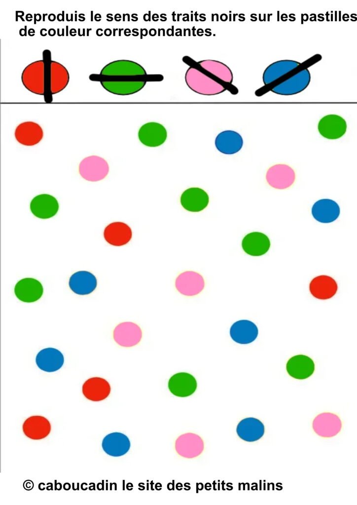 âïž Â«Â Reproduis le sens des traits noirs sur les pastilles de couleur correspondantes. »