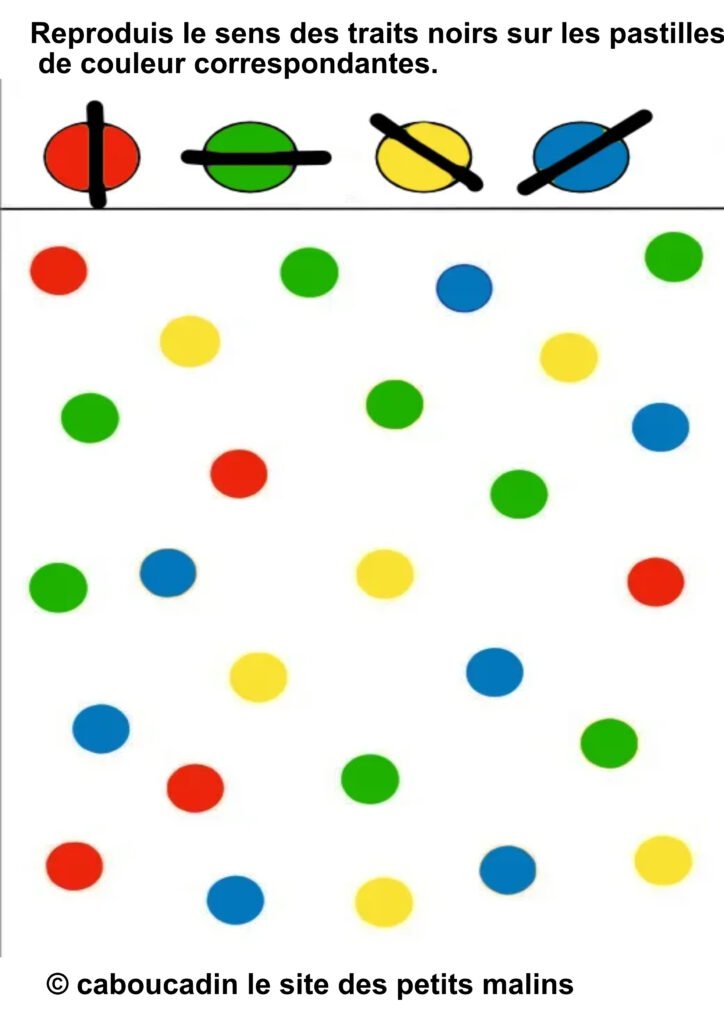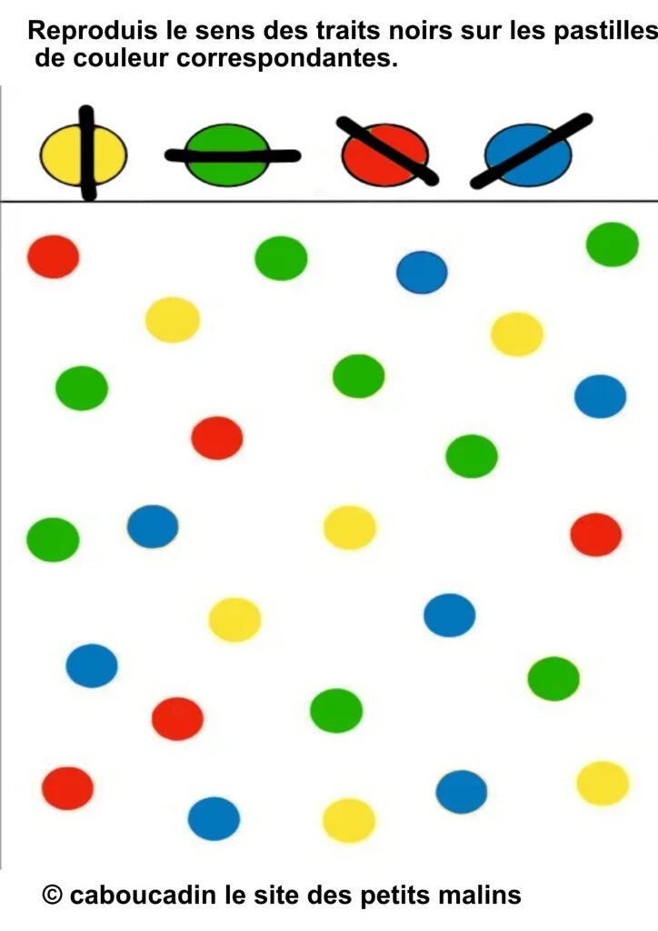 Un jeu de couleurs et de traits : amuse-toi Ă reproduire les motifs ! đš 10 fiches maternelles avec des pastilles de couleurs . Aujourdâhui, on te propose un super exercice qui va faire travailler tes yeux et ta mĂ©moire tout en tâamusant ! Lâobjectif ? Observer, comparer et reproduire des petits traits noirs sur des points colorĂ©s. Un vrai jeu de dĂ©tective des formes et des couleurs ! đ”ïžââïžđ