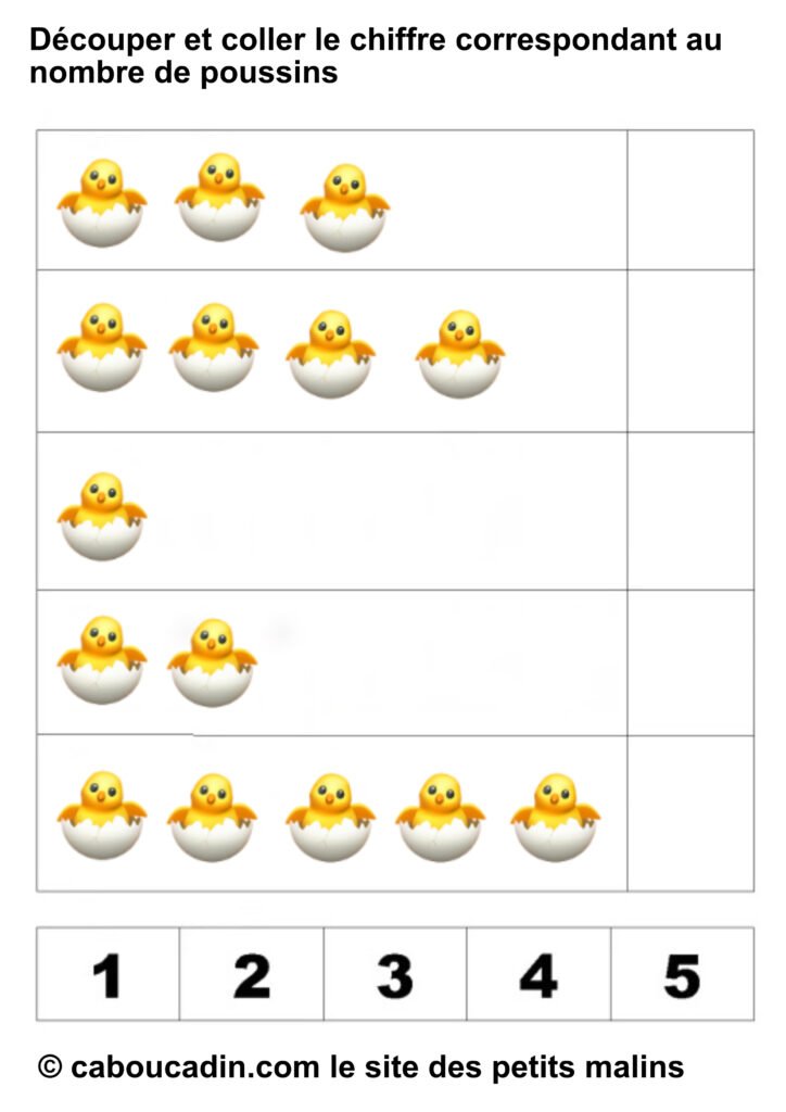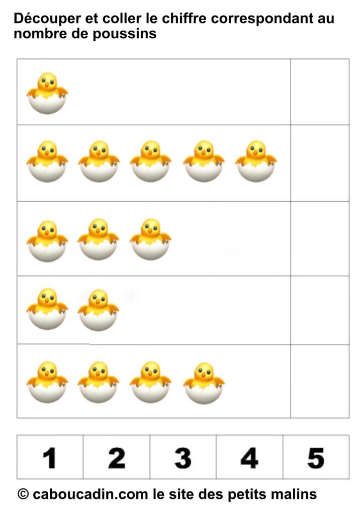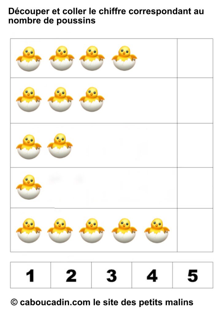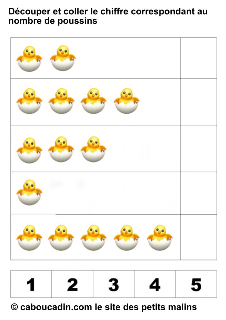 Par exemple, si tu vois quatre poussins sur une ligne, tu dois chercher le chiffre 4 tout en bas, le découper, et le coller dans la case vide qui est à côté de ce groupe.