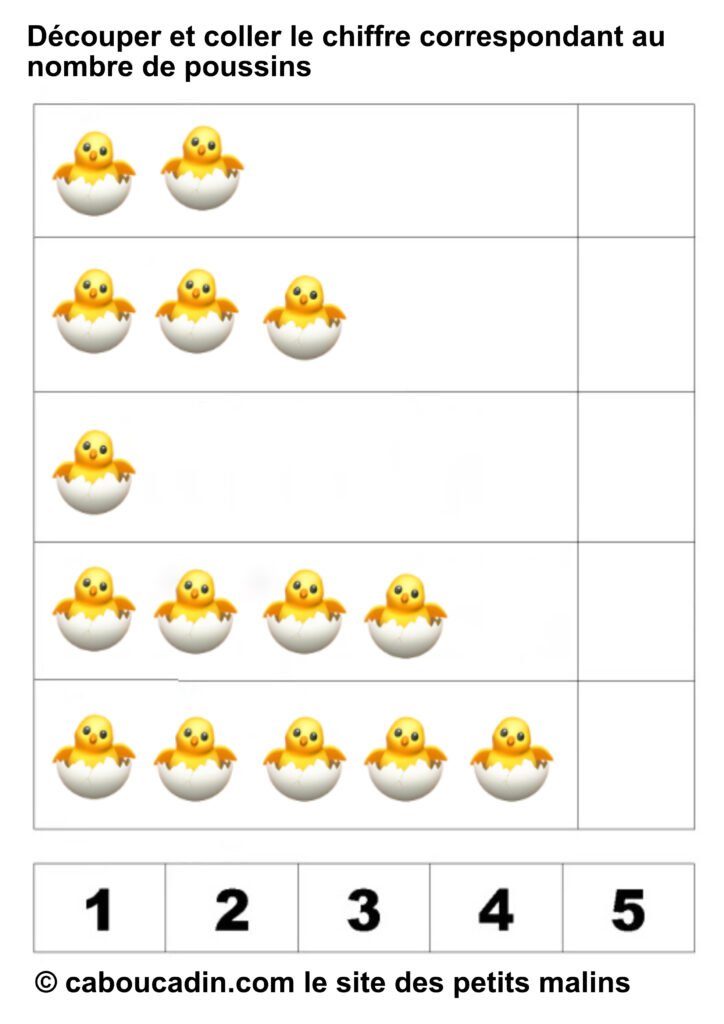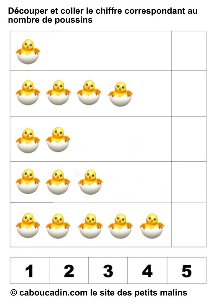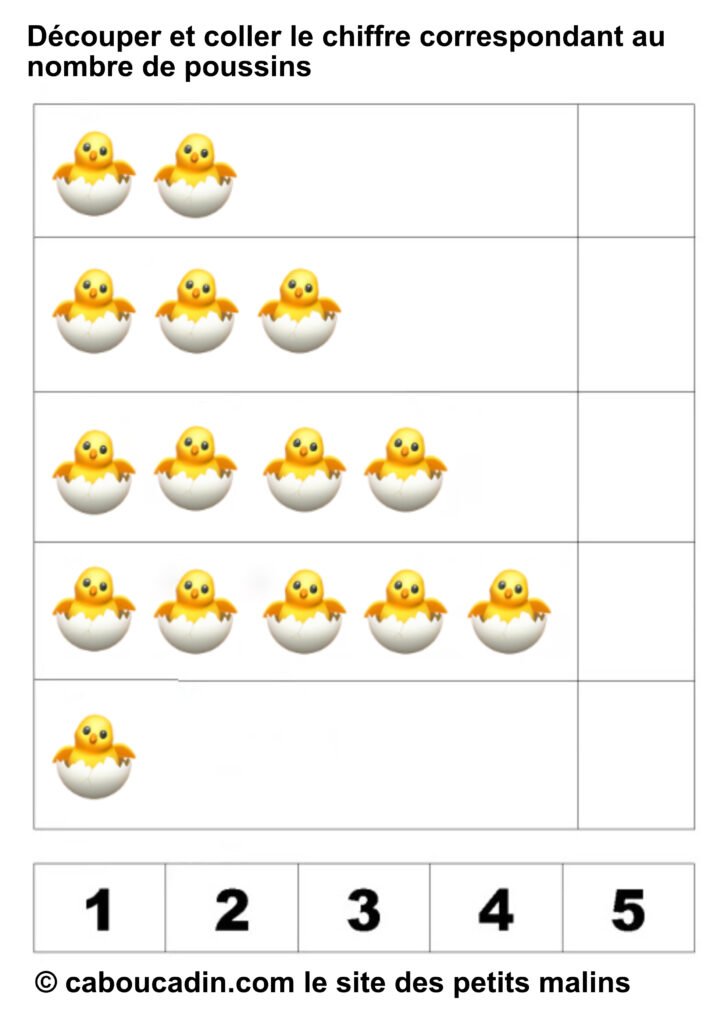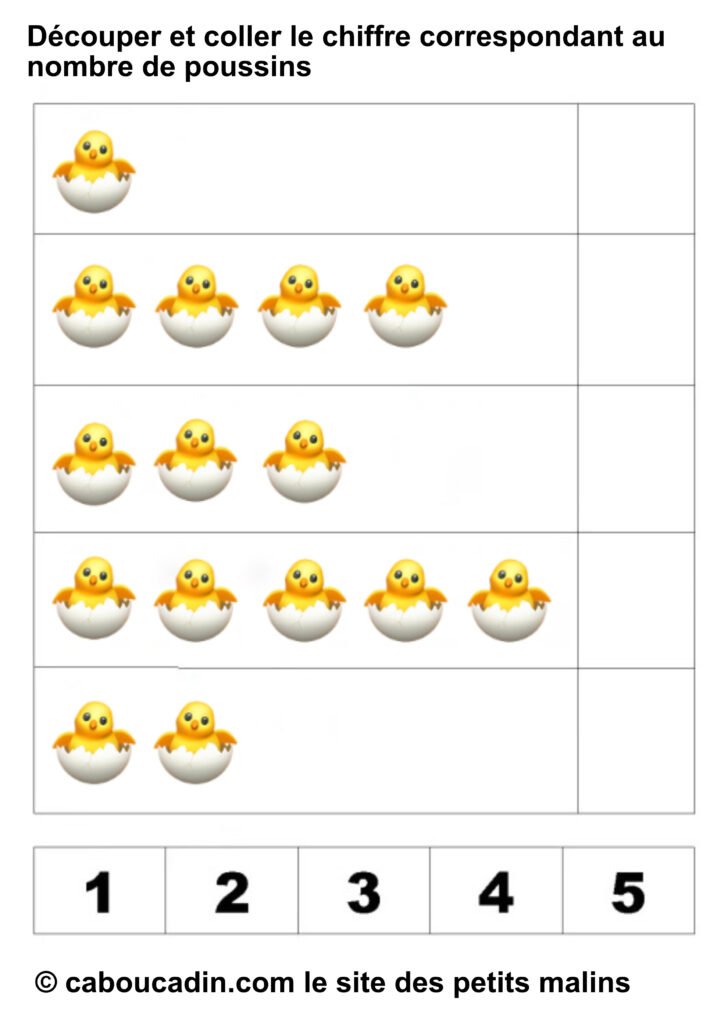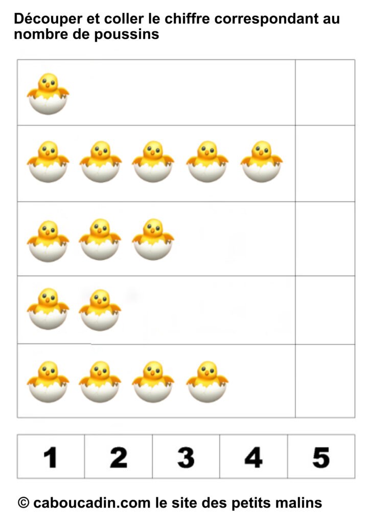 Par exemple, si tu vois quatre poussins sur une ligne, tu dois chercher le chiffre 4 tout en bas, le découper, et le coller dans la case vide qui est à côté de ce groupe.