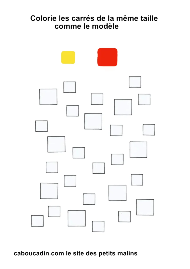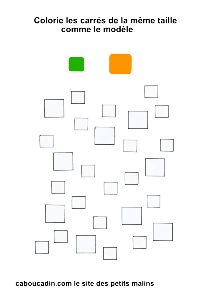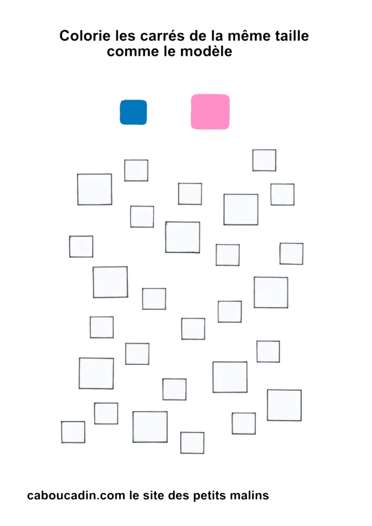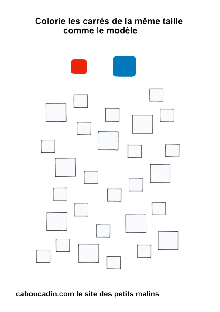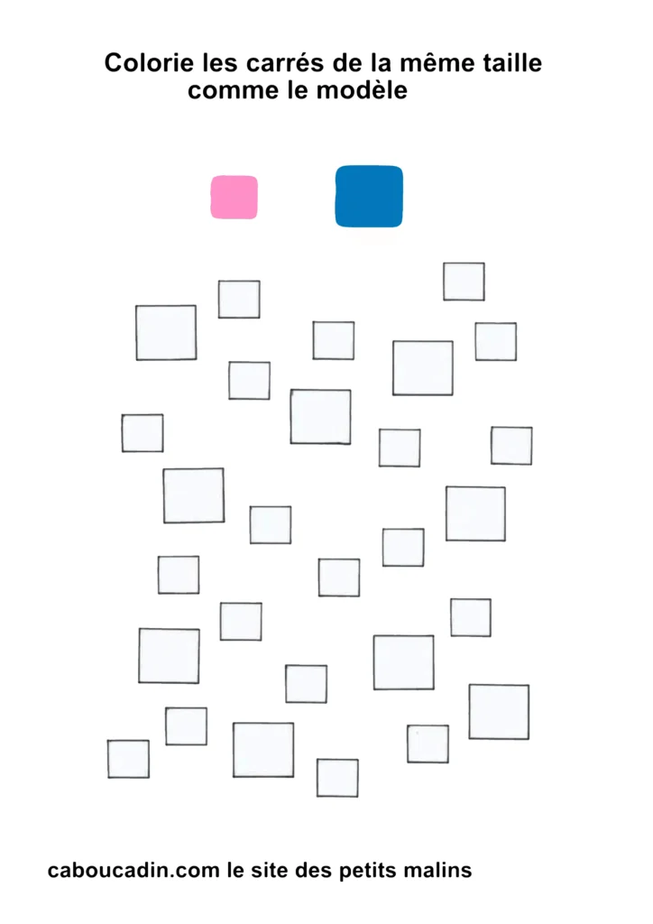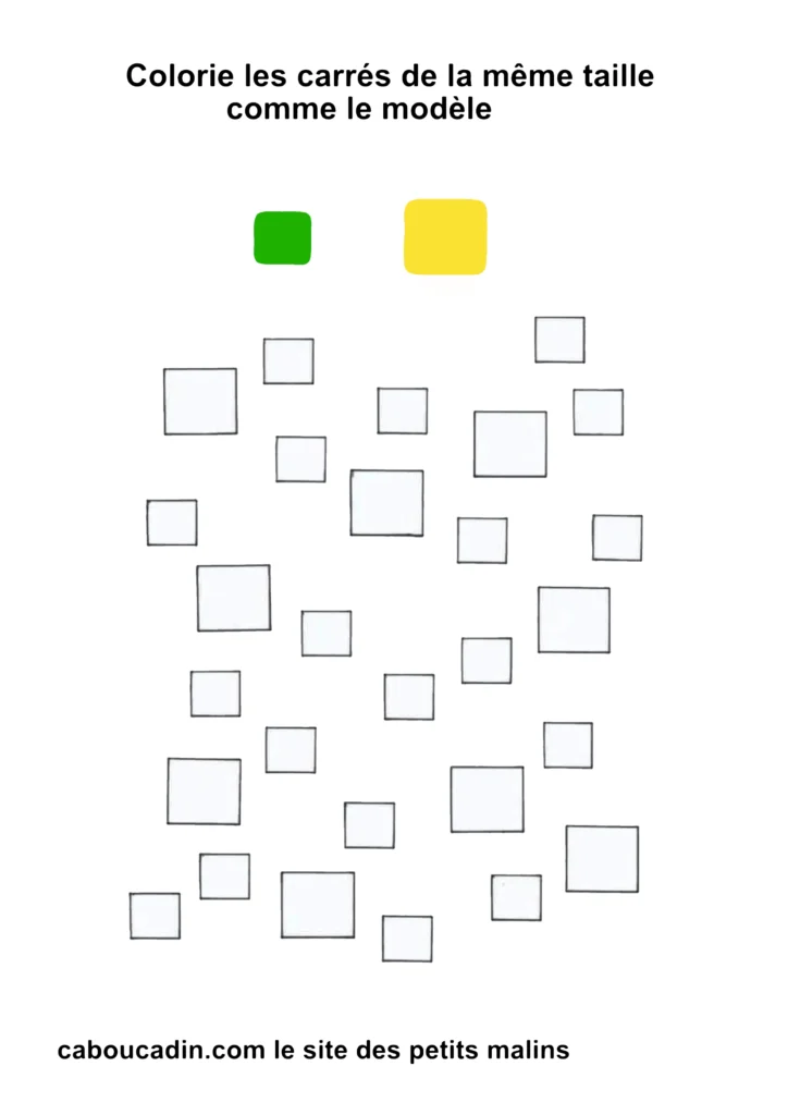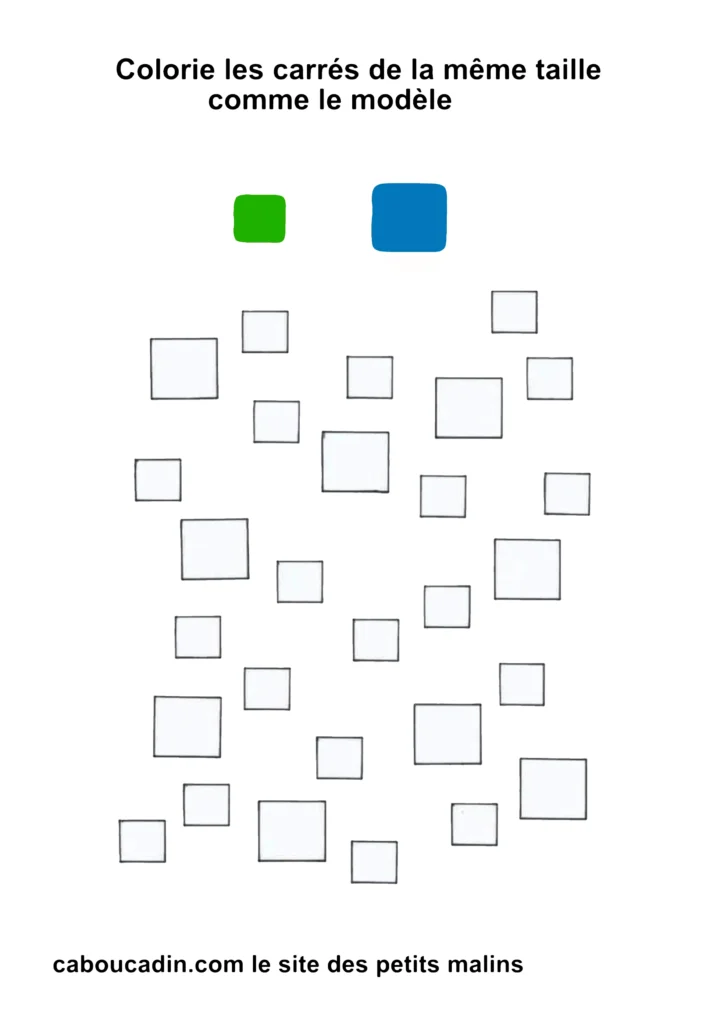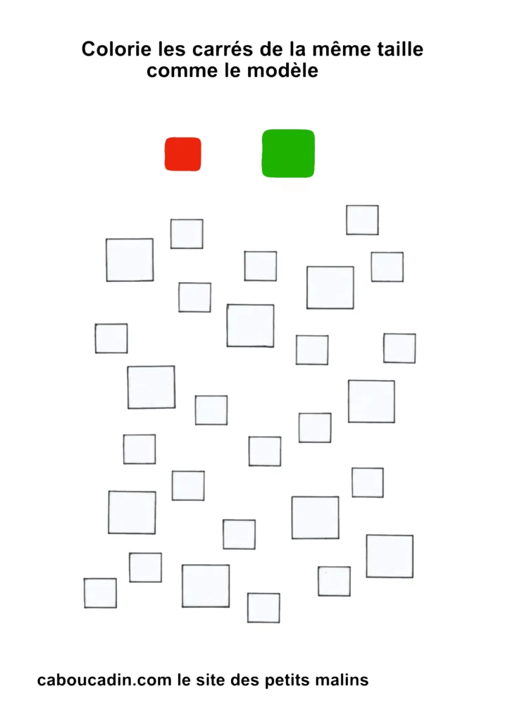 10 fiches maternelles : Faire la différence entre petit et grand. Des fiches maternelles pour apprendre la différence entre petit et grand. Pas facile quand on est enfants de faire la différence de taille d’un objet surtout sur une feuille de papier. Dans l’exercice, il faut trouver les petits carrés et les colorier comme le modèle. Ensuite, il faut trouver les grands carrés et les colorier aussi comme le modèle.