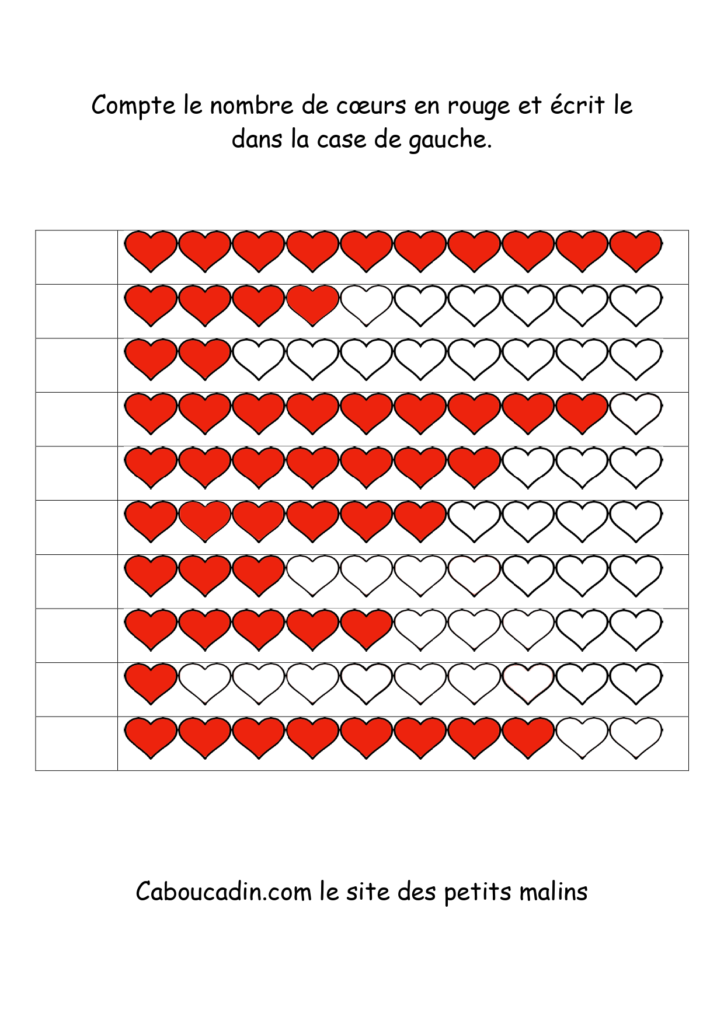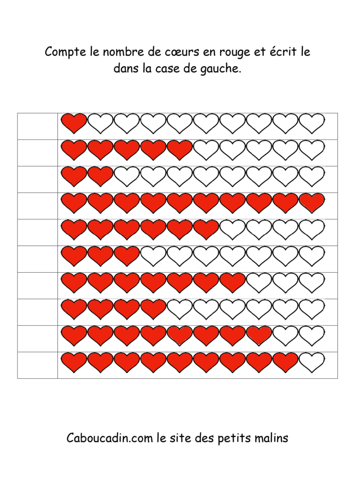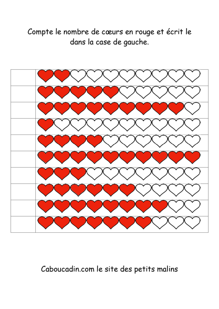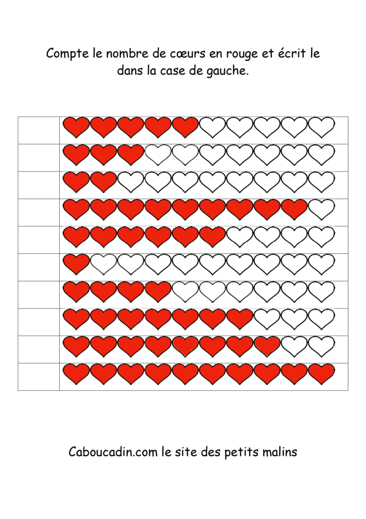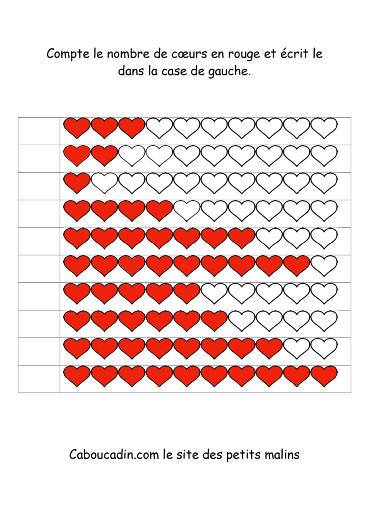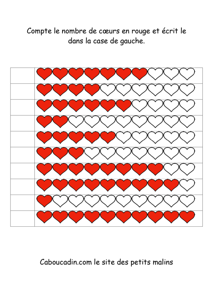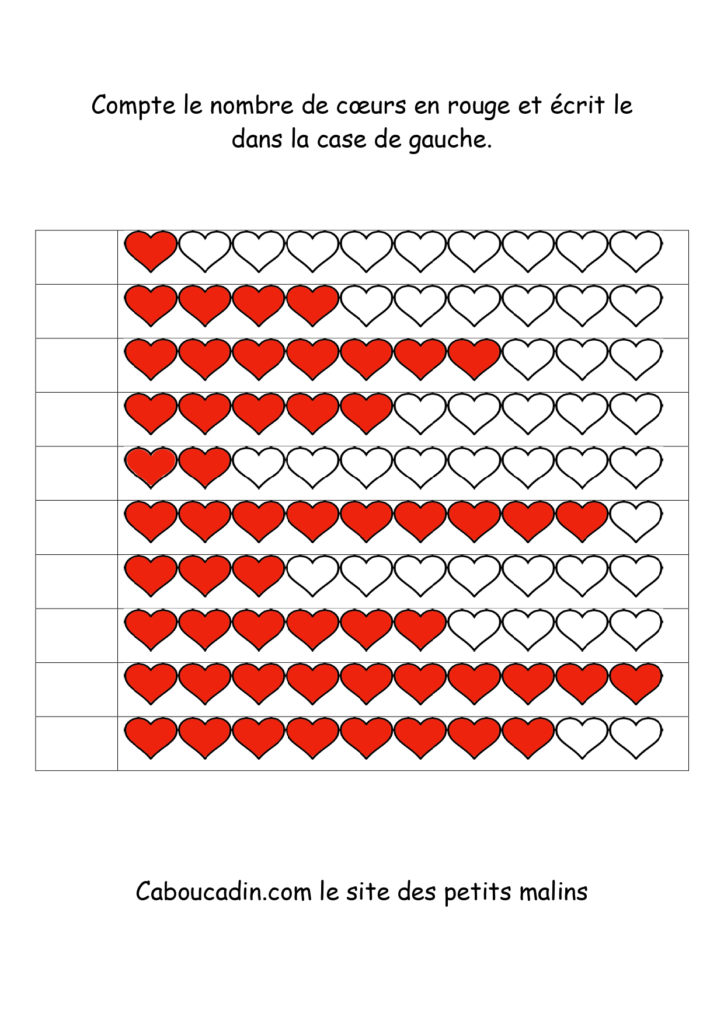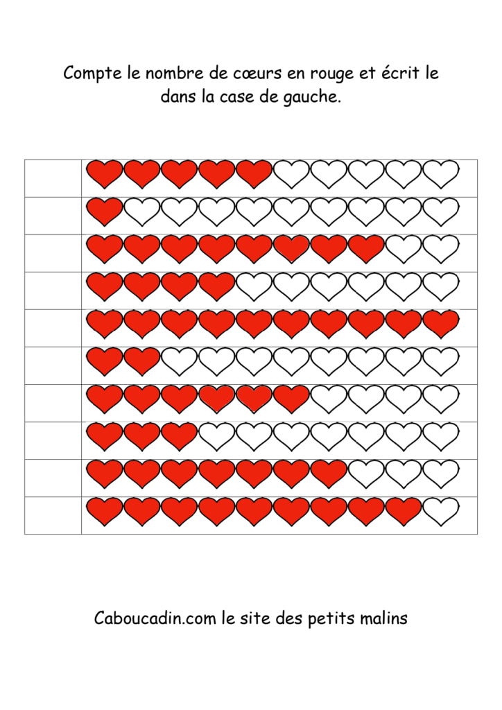 10 fiches maternelles fête des mères : Apprendre à compter jusqu’à 10. Des fiches pour apprendre à compter jusqu’à 10 des coeurs coloriés en rouge. Un exercice facile pour les enfants qui savent déjà compter jusqu’à 10. Le principe de la fiche est de compter le nombre de coeurs coloriés en rouge sur la ligne et de mettre le chiffre dans la case à gauche.