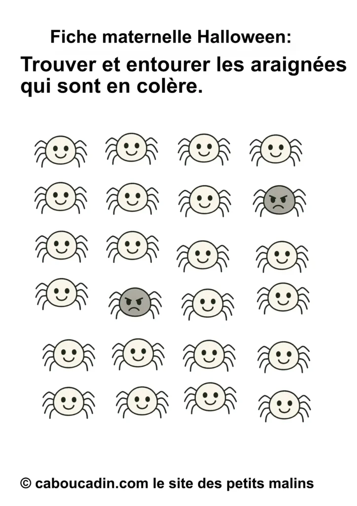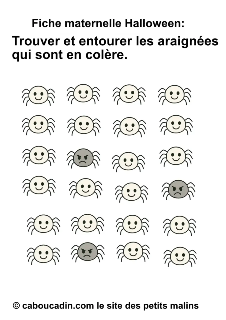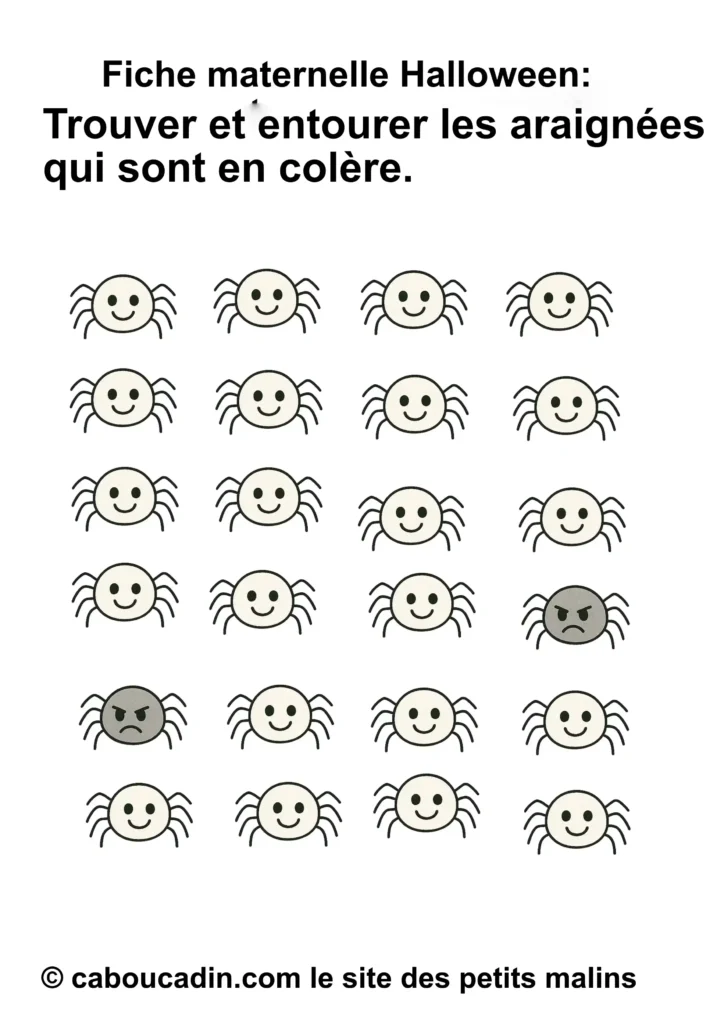 👉 Alors, prêt à jouer au détective d’émotions avec ces petites araignées d’Halloween ? Installe-toi, prends ton crayon, et ouvre l’œil : certaines araignées n’ont vraiment pas le sourire aujourd’hui… À toi de les attraper ! 🕷️🎃👻