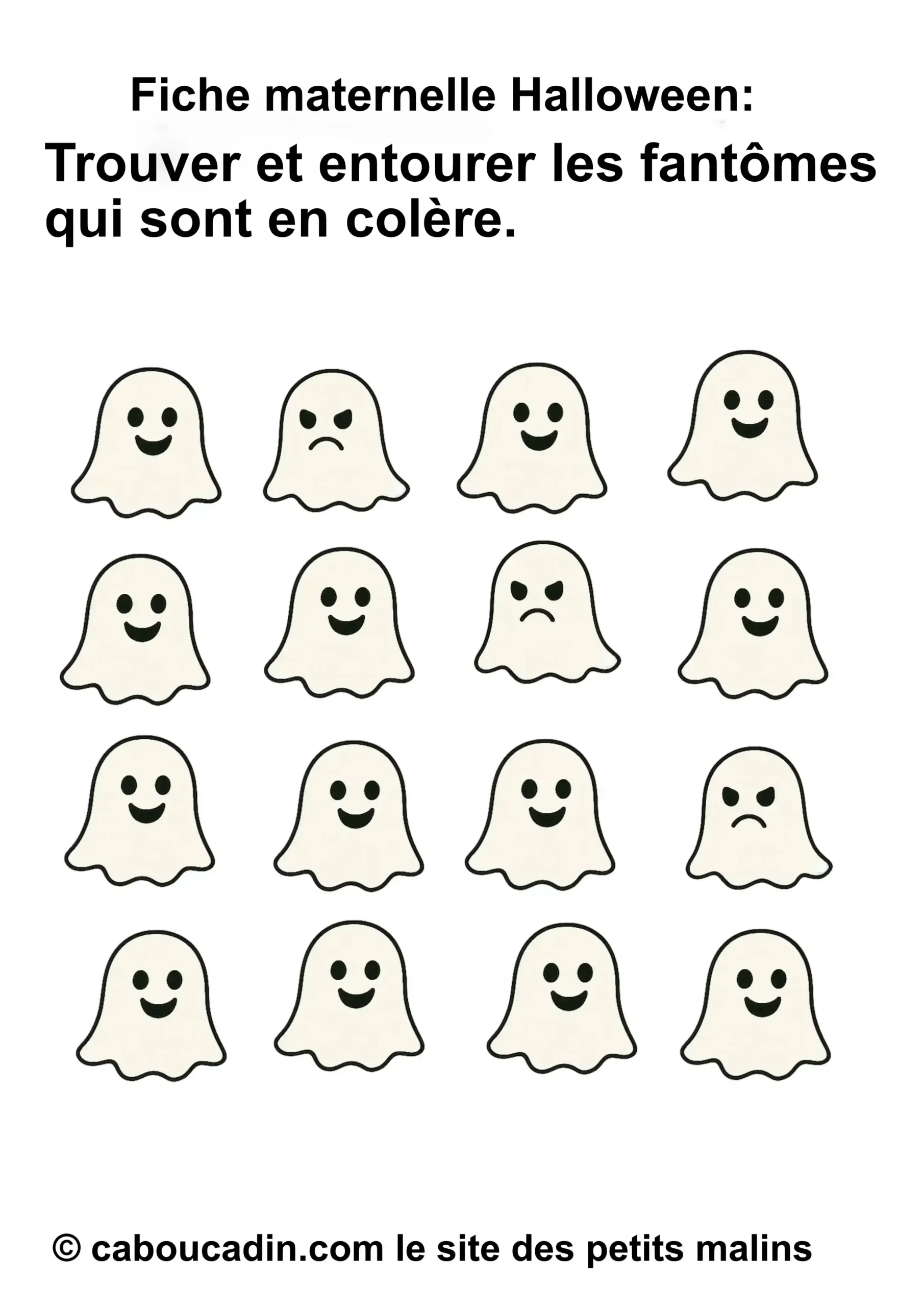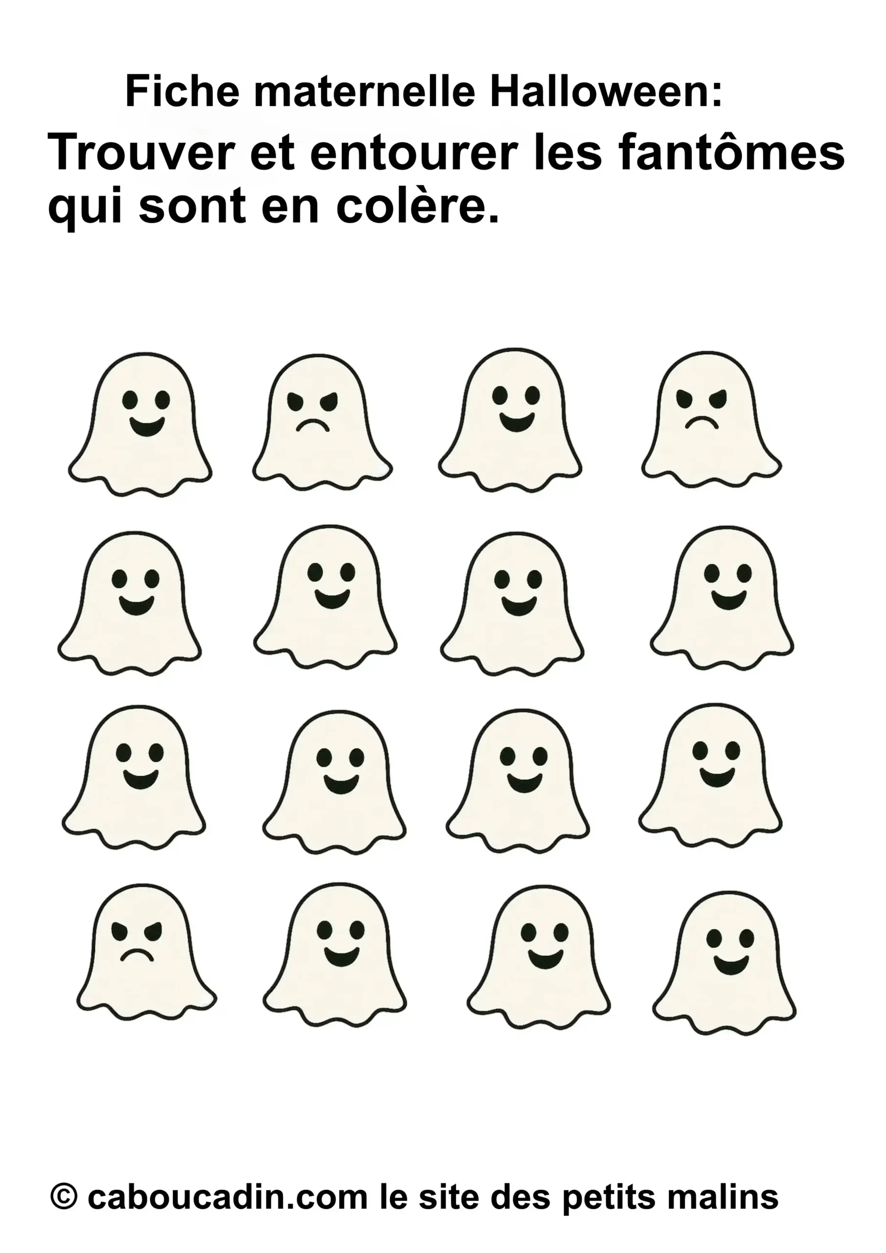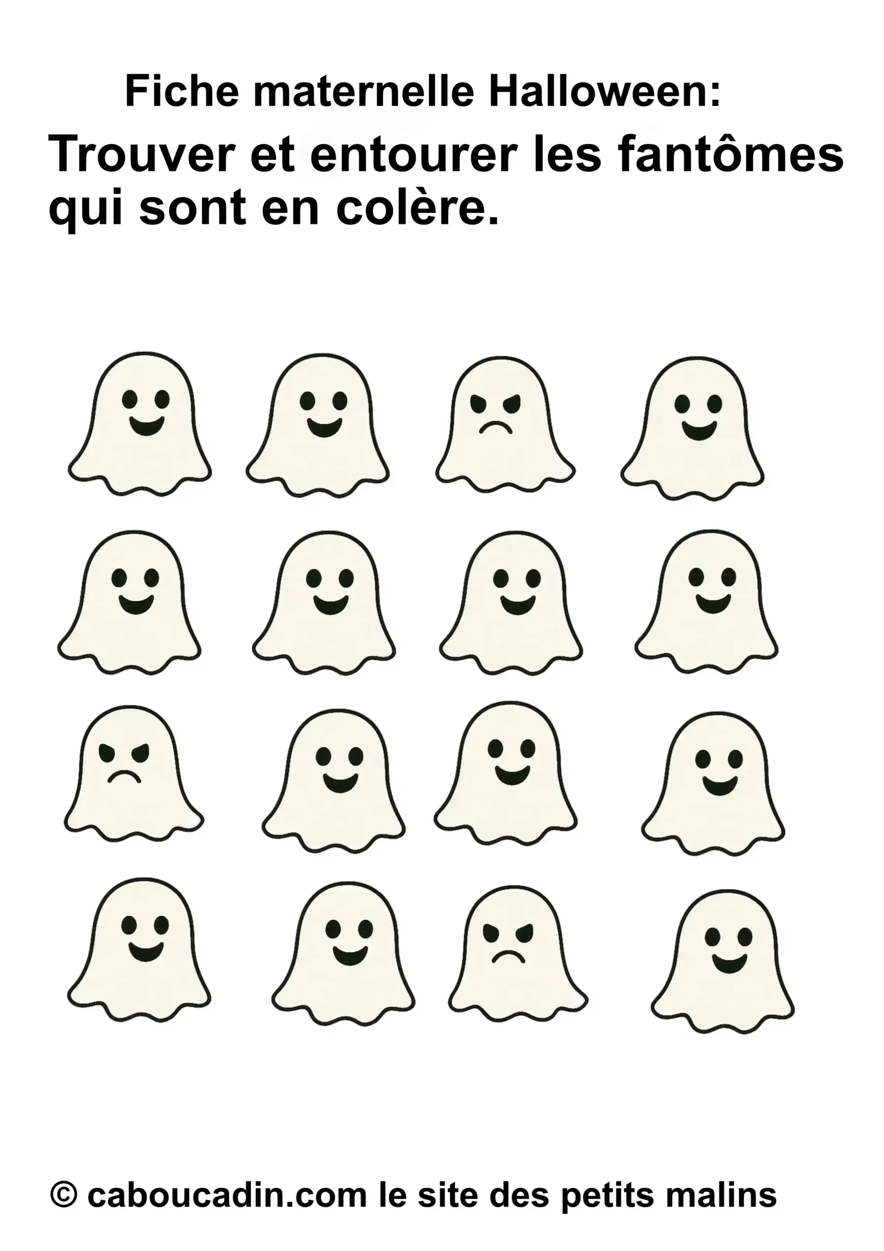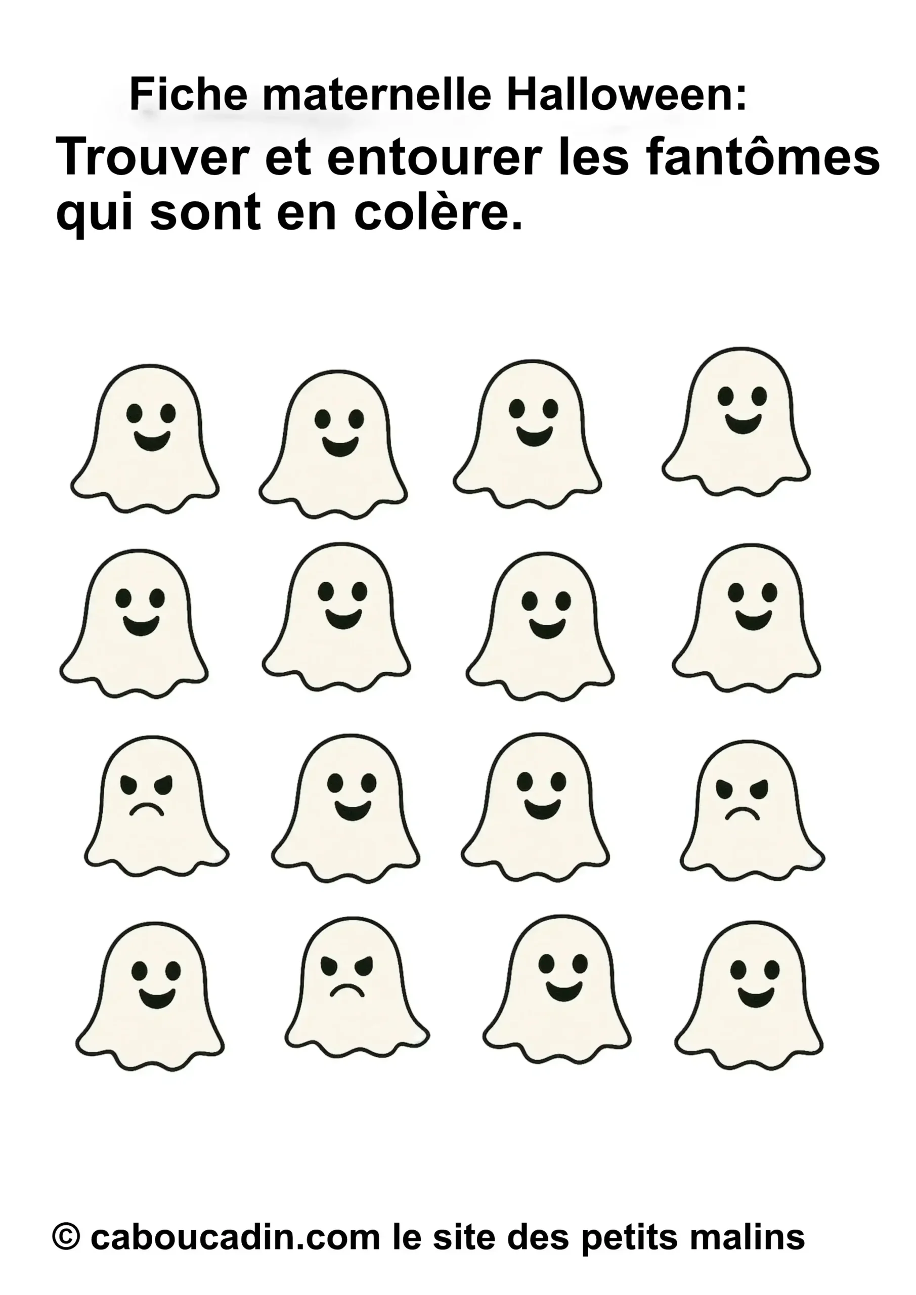 10 Fiches maternelles Halloween : activité à imprimer pour trouver les fantômes en colère. Halloween, c’est le moment où les fantômes sortent se balader… mais rassure-toi, ceux qu’on va rencontrer aujourd’hui ne font pas peur du tout. Non, non ! Ce sont des petits fantômes rigolos, tout ronds, tout blancs, dessinés exprès pour jouer avec toi. La plupart ont un grand sourire, comme s’ils venaient de croquer un bonbon au chocolat 🍫. Mais attention… certains ne sourient pas du tout. Ils froncent leurs sourcils, ils font la moue, bref… ils sont en colère ! 😡