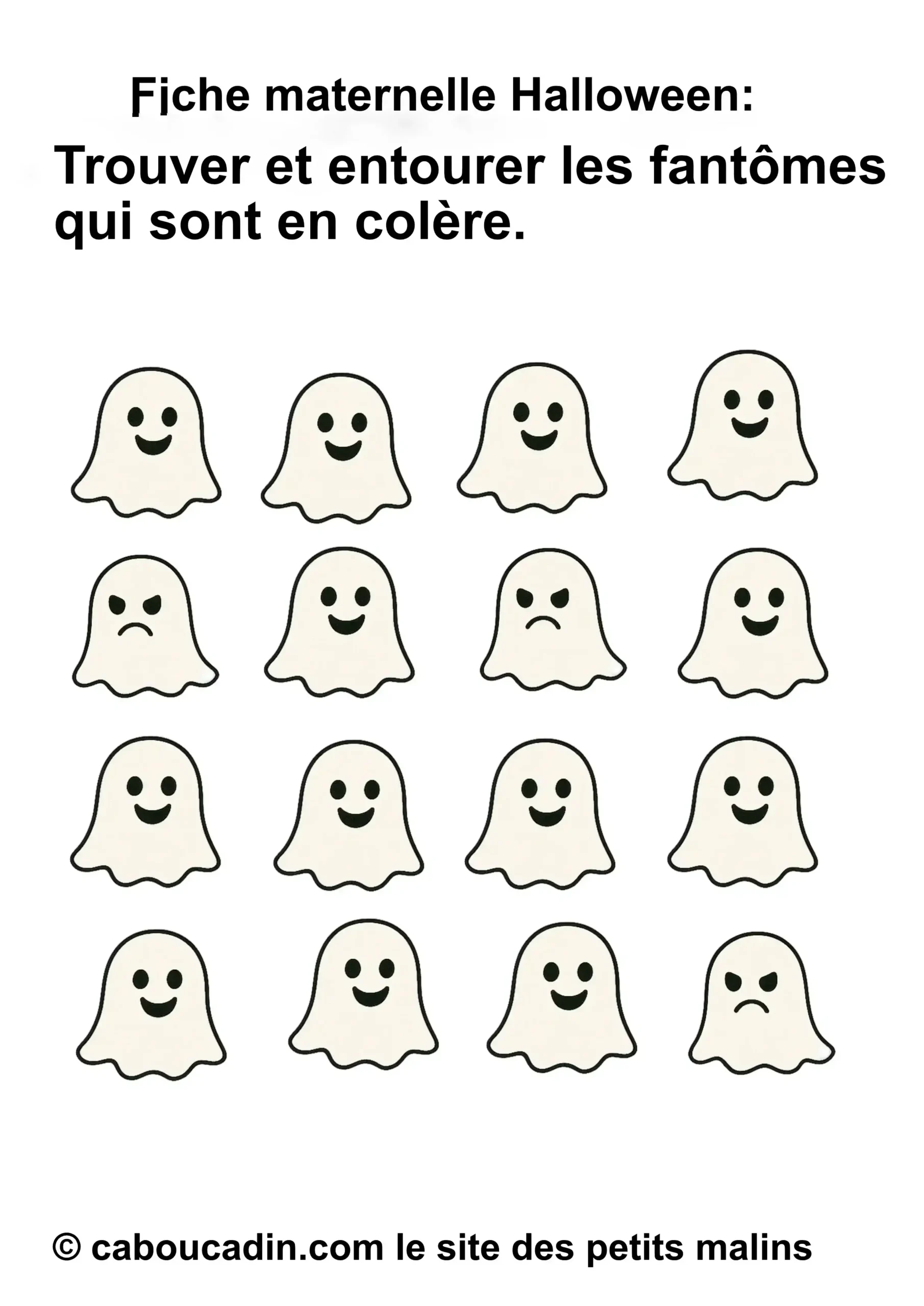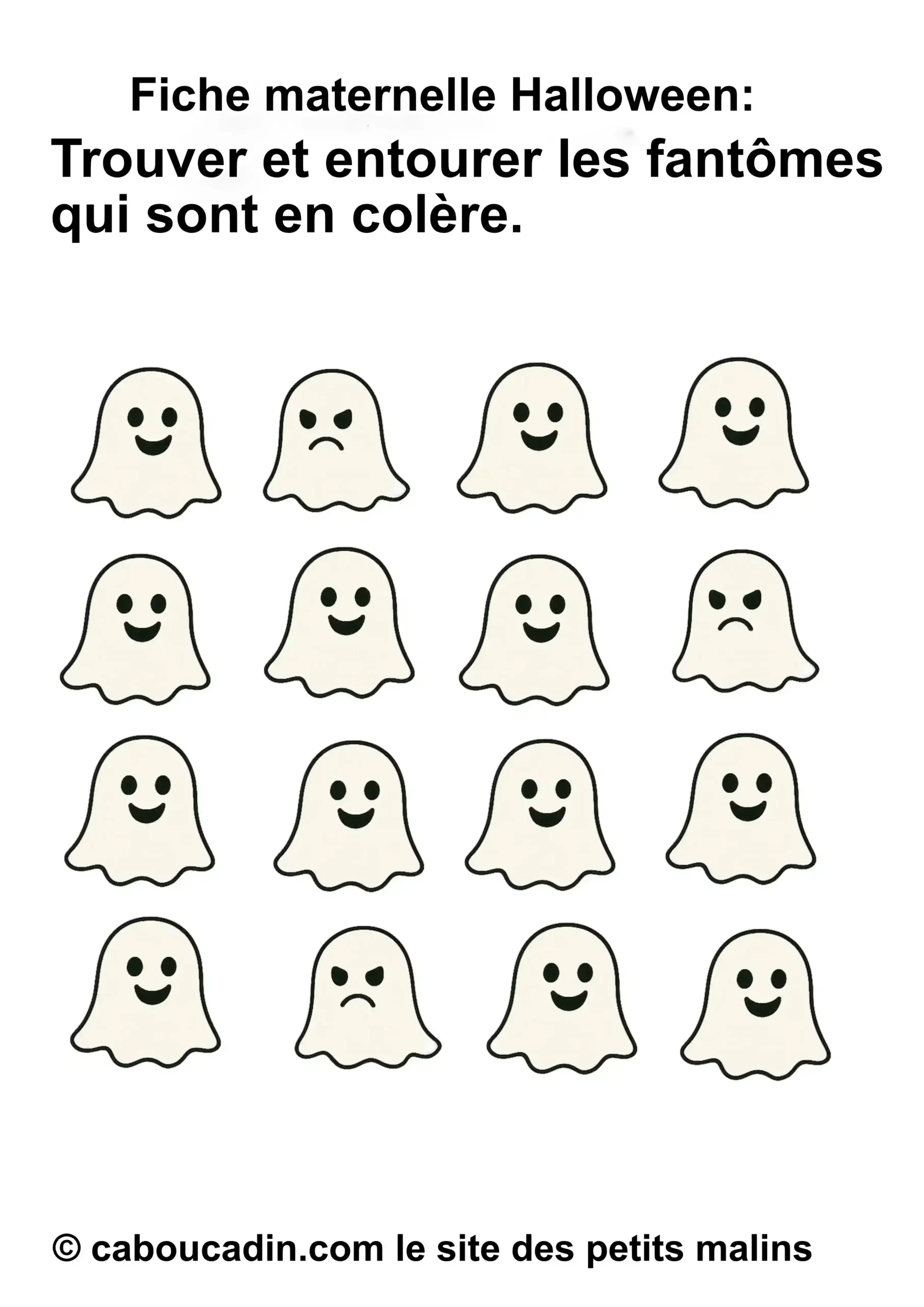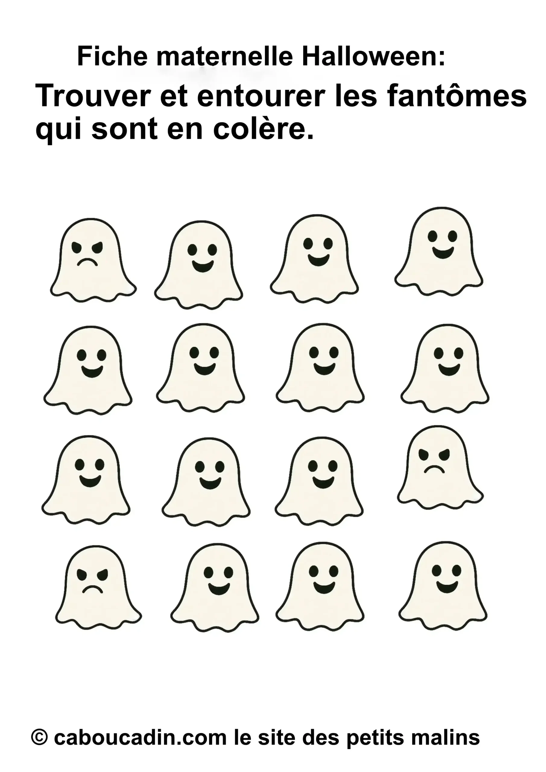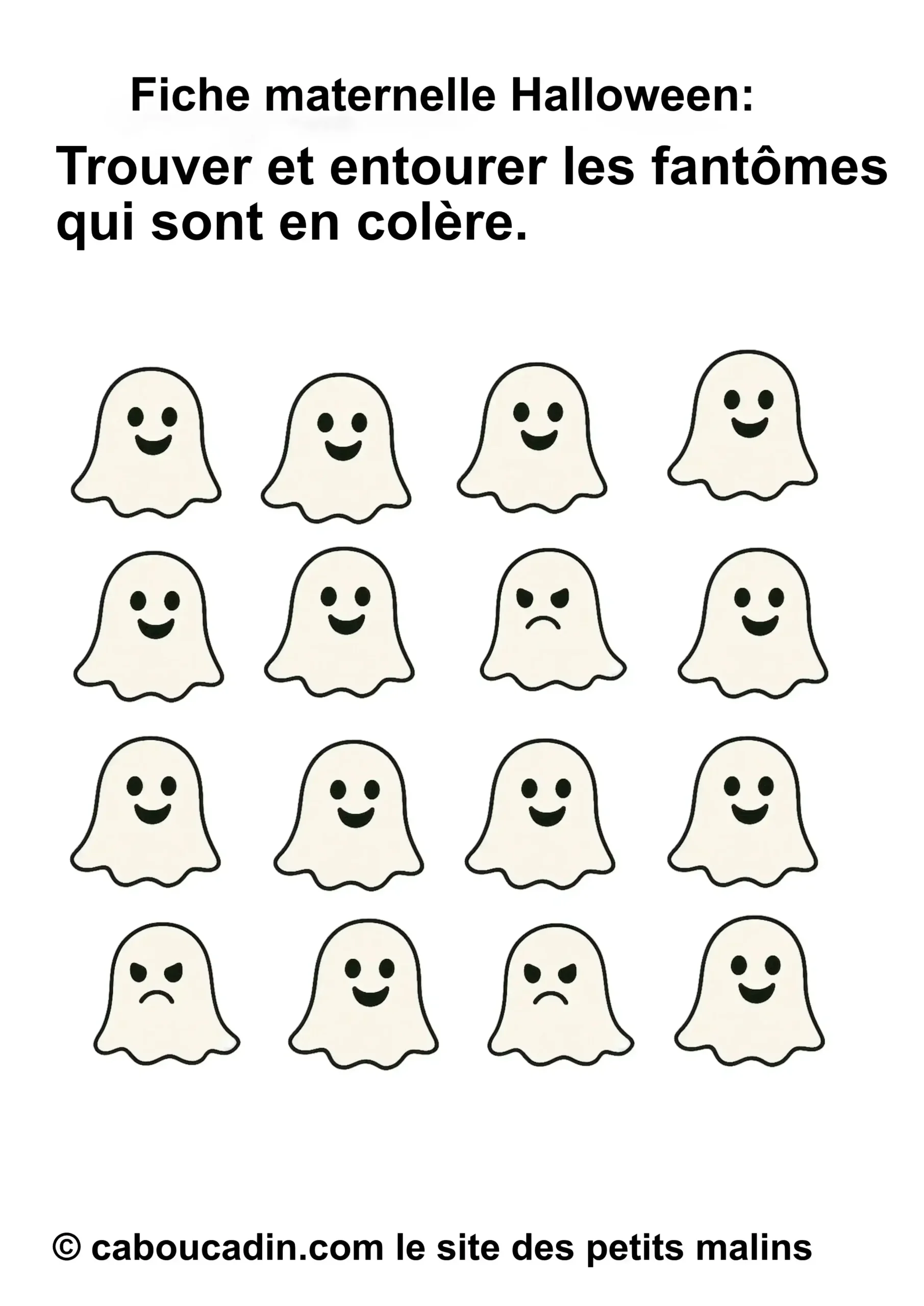 10 Fiches maternelles Halloween : activité à imprimer pour trouver les fantômes en colère. Halloween, c’est le moment où les fantômes sortent se balader… mais rassure-toi, ceux qu’on va rencontrer aujourd’hui ne font pas peur du tout. Non, non ! Ce sont des petits fantômes rigolos, tout ronds, tout blancs, dessinés exprès pour jouer avec toi. La plupart ont un grand sourire, comme s’ils venaient de croquer un bonbon au chocolat 🍫. Mais attention… certains ne sourient pas du tout. Ils froncent leurs sourcils, ils font la moue, bref… ils sont en colère ! 😡