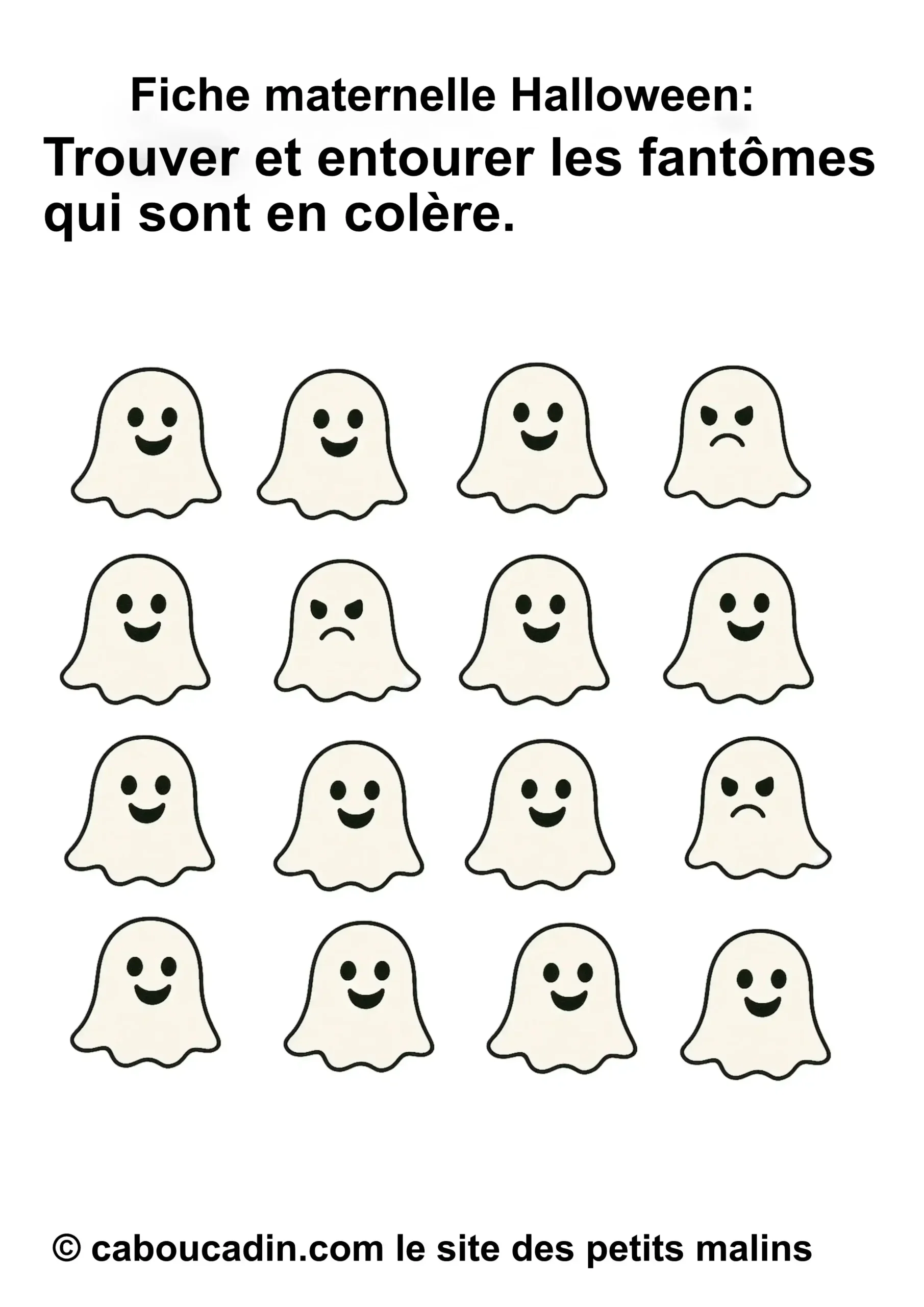 « Aujourd’hui, on joue aux détectives d’Halloween ! Votre travail est de chercher tous les fantômes fâchés et de les entourer avec votre crayon. Mais attention… ils se cachent bien parmi ceux qui sourient. Il faudra ouvrir grand vos yeux ! 👀 »