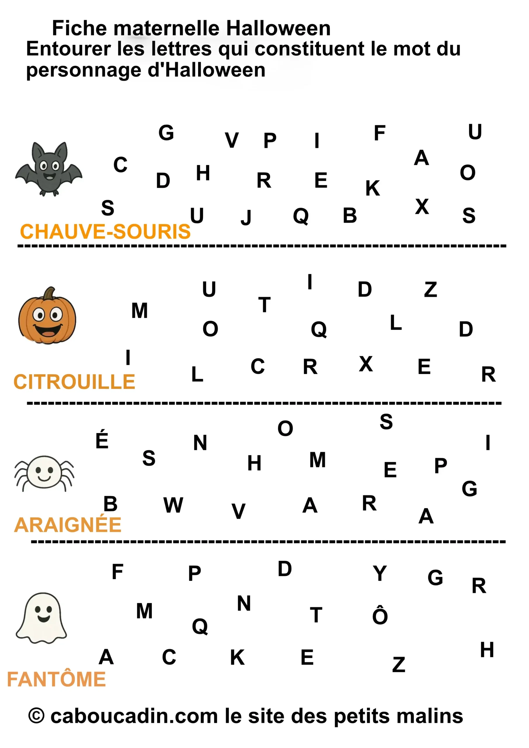Pour la citrouille, tu entoures C-I-T-R-O-U-I-L-L-E.