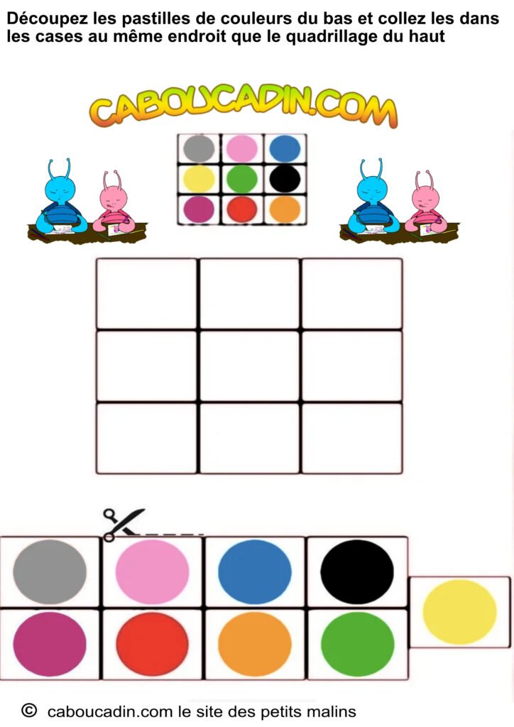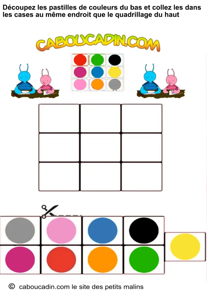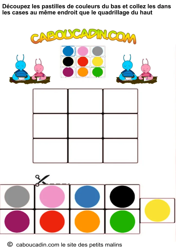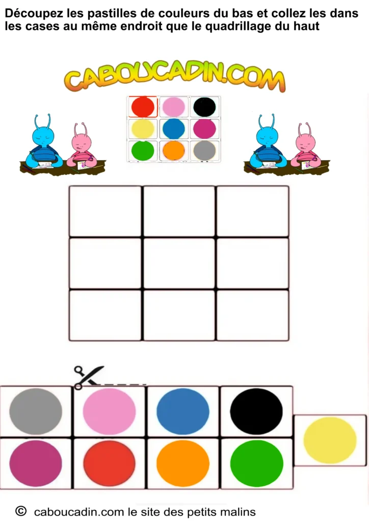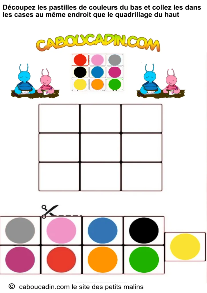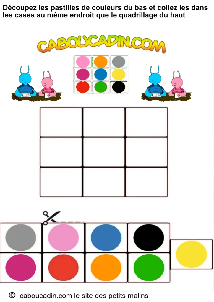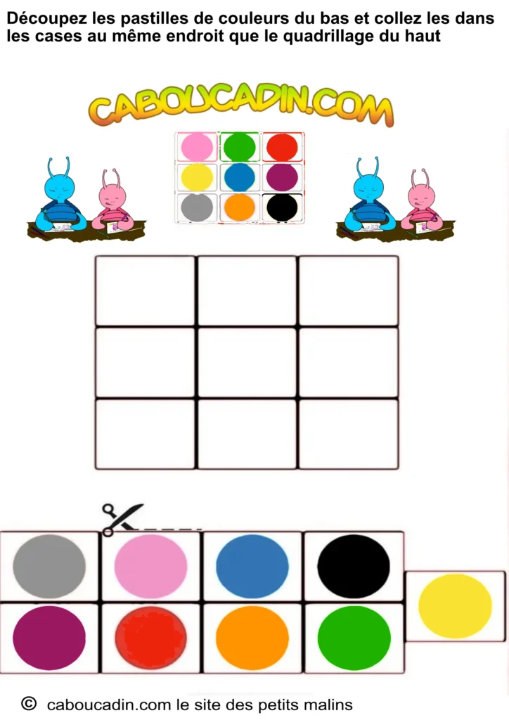 📢 Un titre clair : « Découpe les pastilles de couleurs en bas et colle-les dans les cases au même endroit que sur le quadrillage du haut. » Facile, non ?