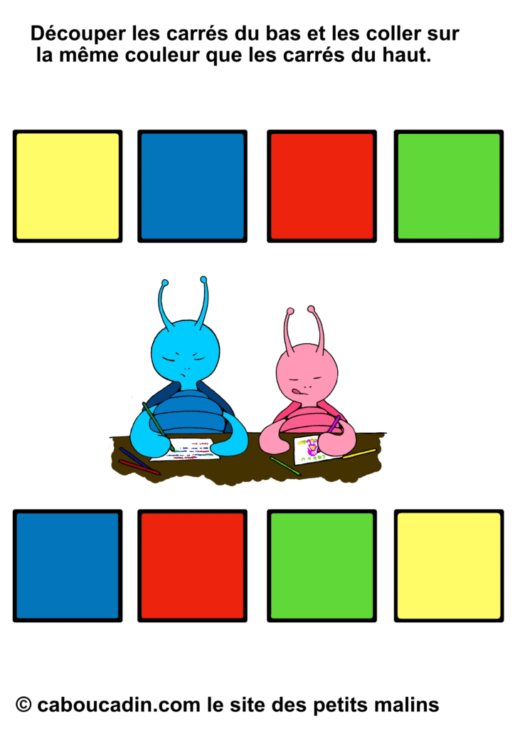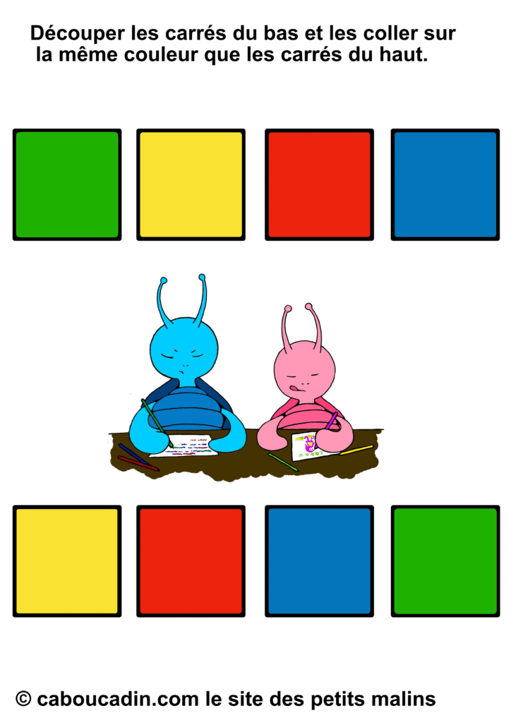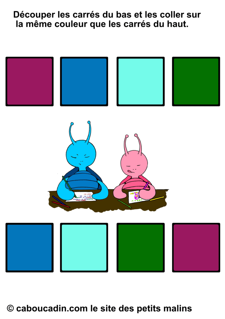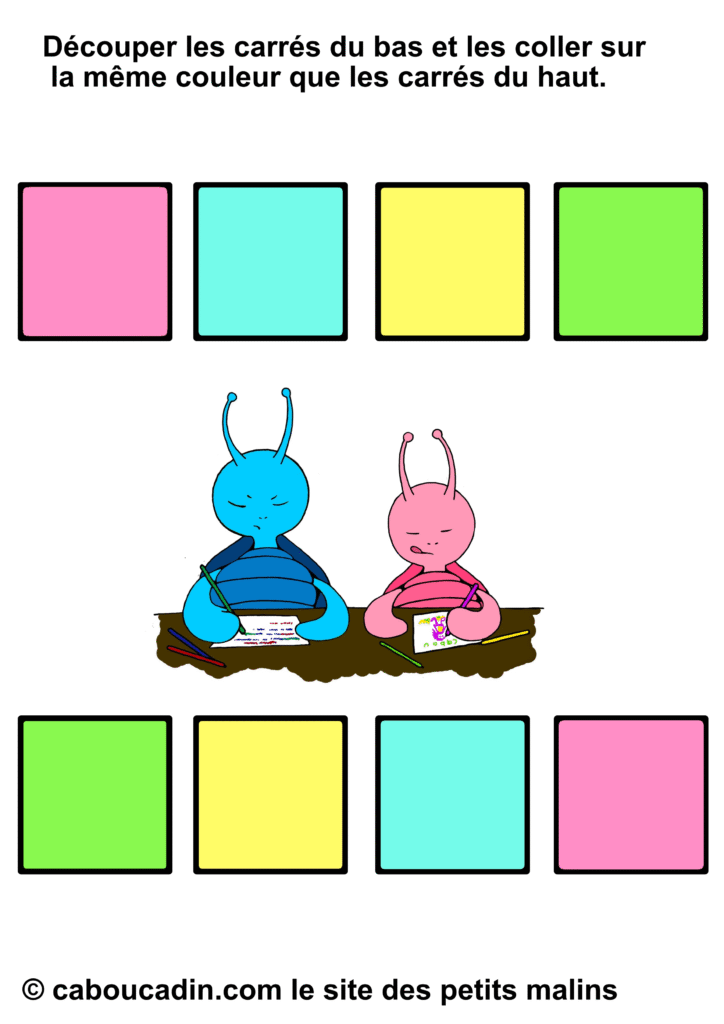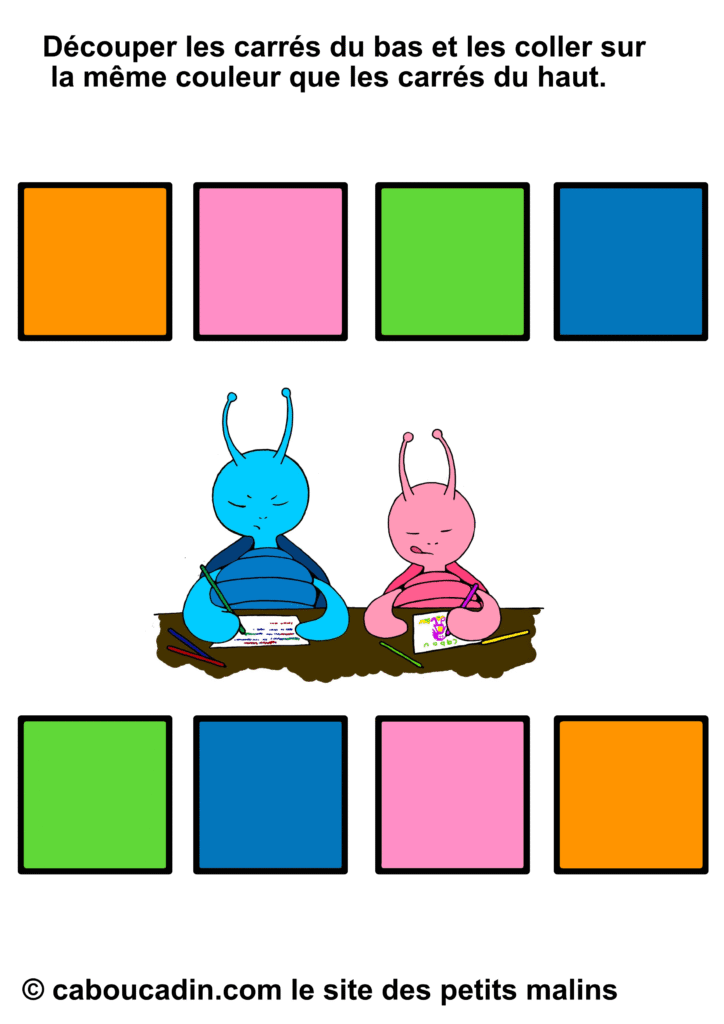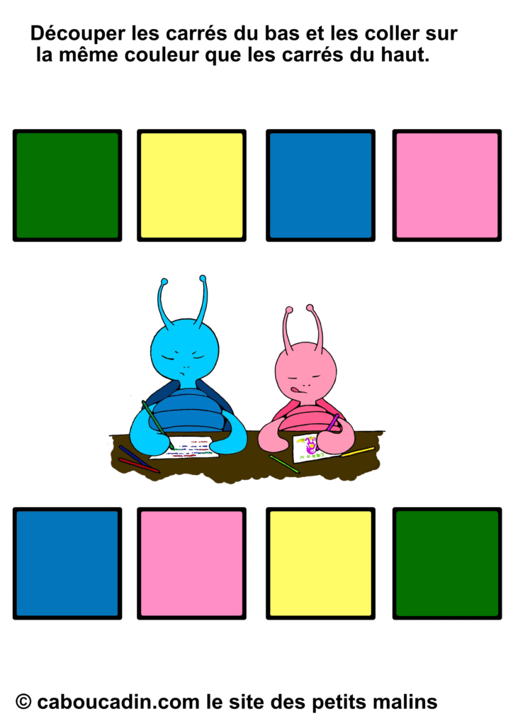 “Découpe les carrés du bas et colle-les sur la même couleur que les carrés du haut.”