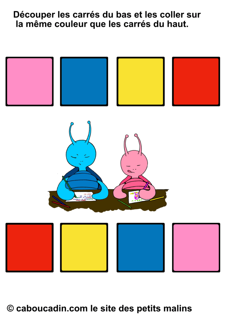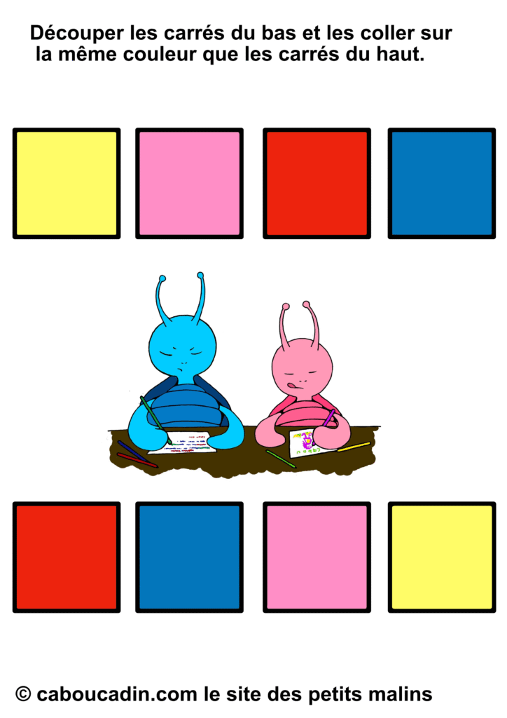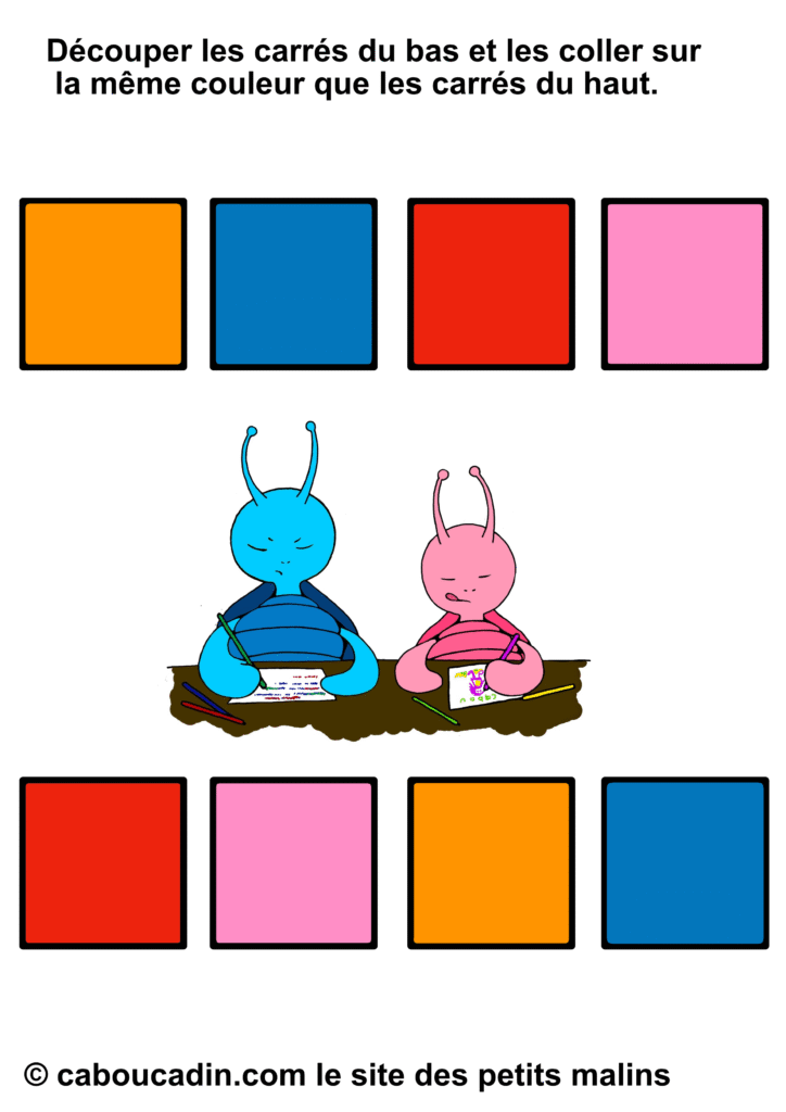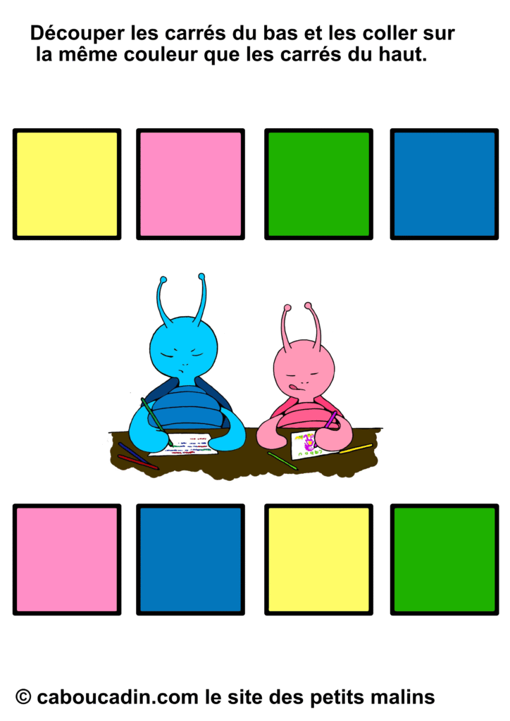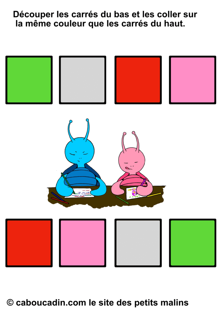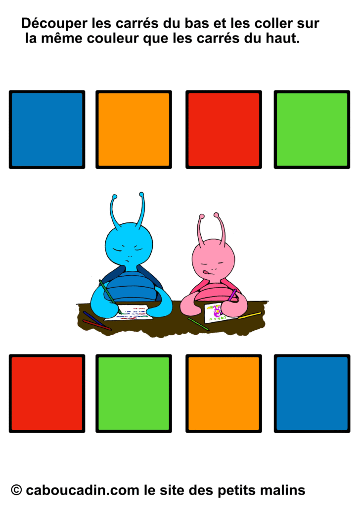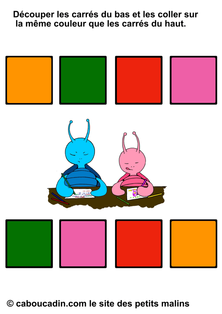 “Découpe les carrés du bas et colle-les sur la même couleur que les carrés du haut.”