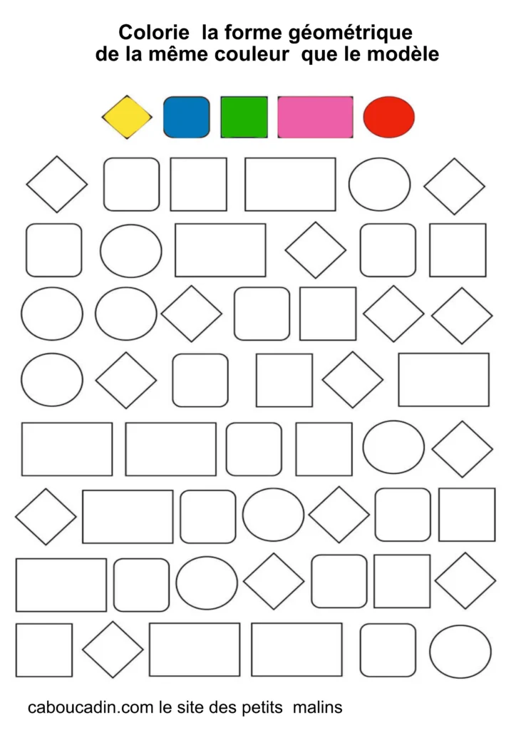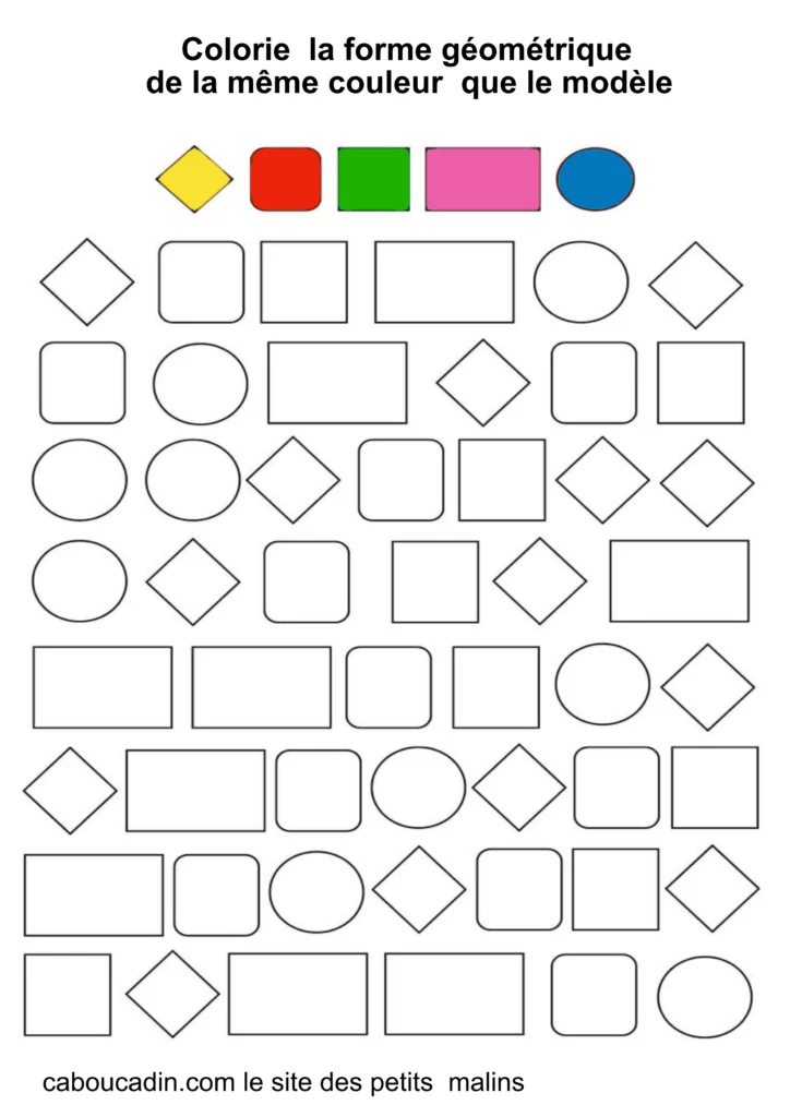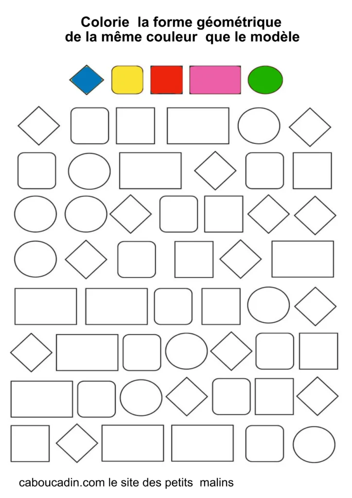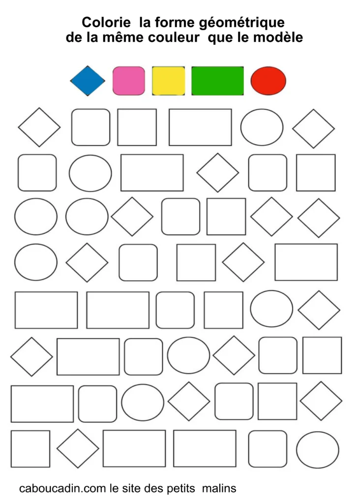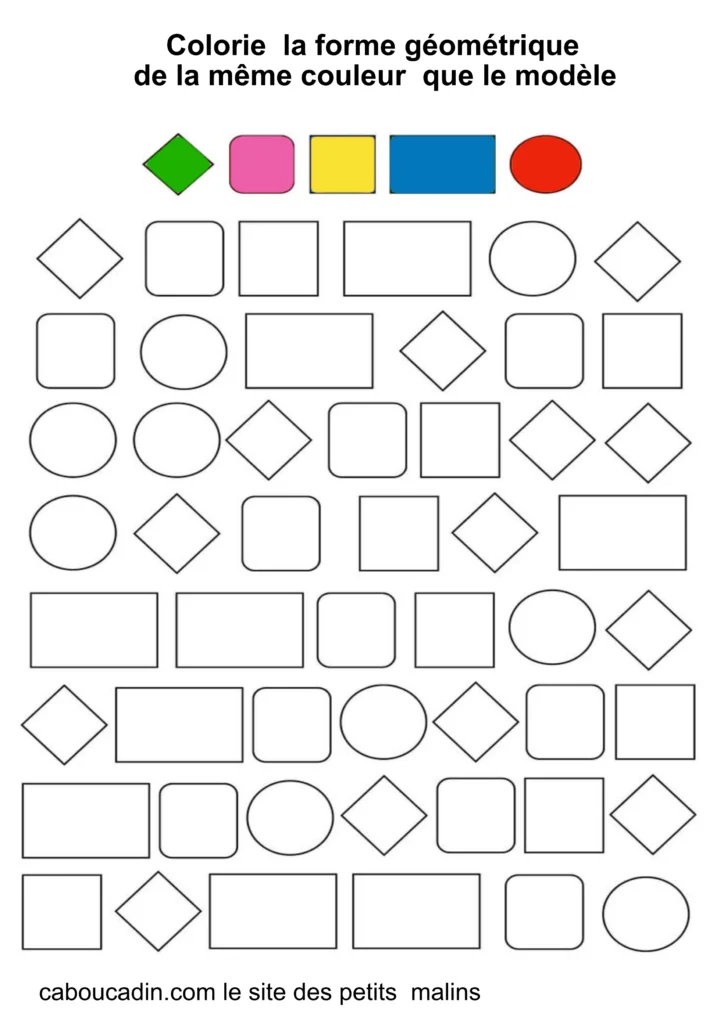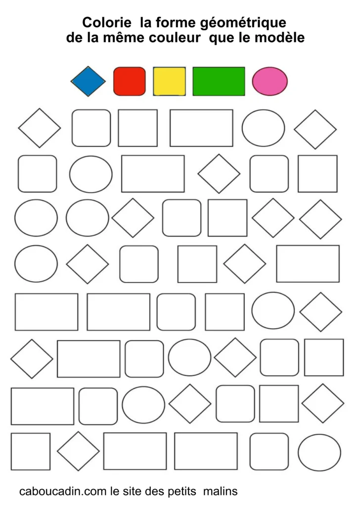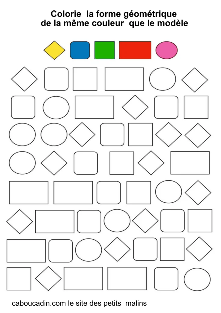 Ces fiches amusantes présentent des grilles remplies de formes simples comme des carrés, des cercles et des losanges. Par exemple : Tout en haut de la grille, cinq formes sont colorées en rose, vert, bleu, rouge et jaune : elles servent de modèles. Le mais du jeu ? L’enfant doit retrouver ces mêmes formes dans la grille et les colorier avec la couleur correspondante. Cet exercice, à la fois ludique et éducatif, aide les petits à reconnaître les formes, à travailler leur coordination œil-main, et à affiner leur motricité fine.
