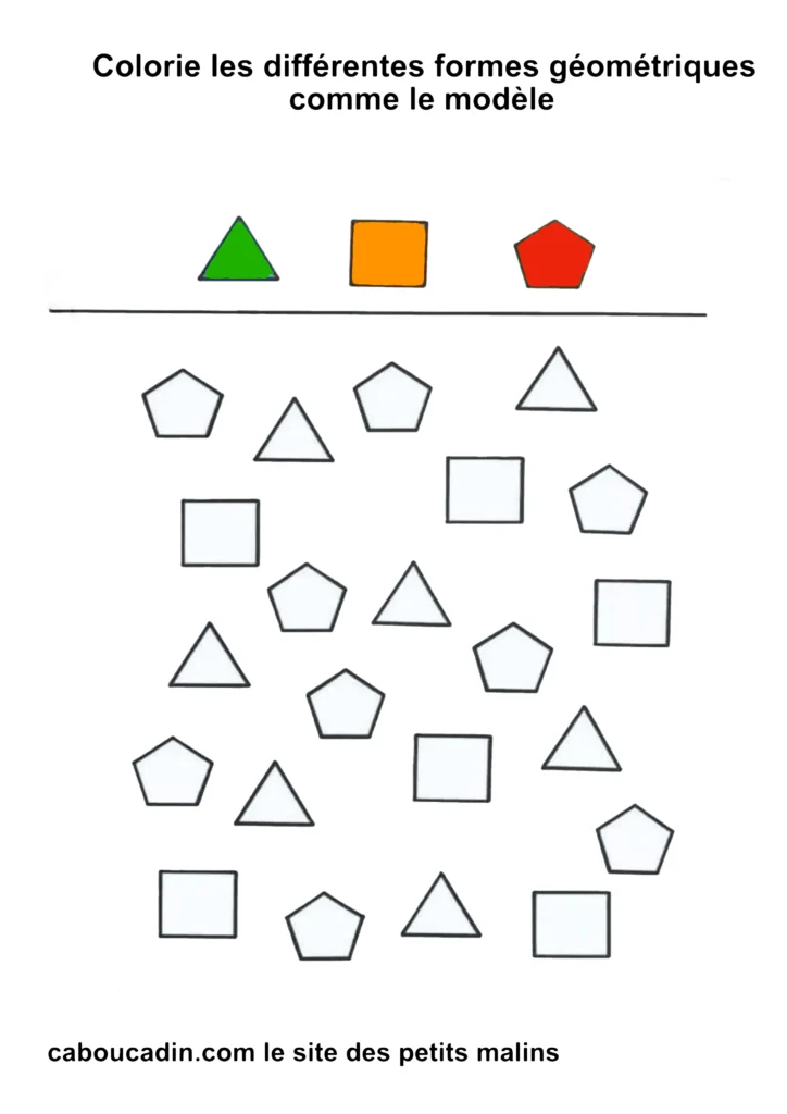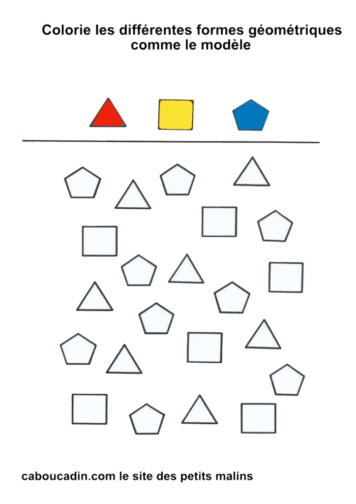 10 fiches maternelles : Reconnaitre Un triangle, un carré ou un pentagone. Ces fiches vont apprendre à vos enfants à reconnaitre les différentes formes géométriques comme un triangle, un carré ou un pentagone. En haut de la fiche maternelle se trouve 3 formes géométriques (triangle, carré et pentagone) , le principe de la fiche est de reconnaitre ses différentes formes géométriques en dessous des modèles et de les colorier de la même couleur que les modèles.