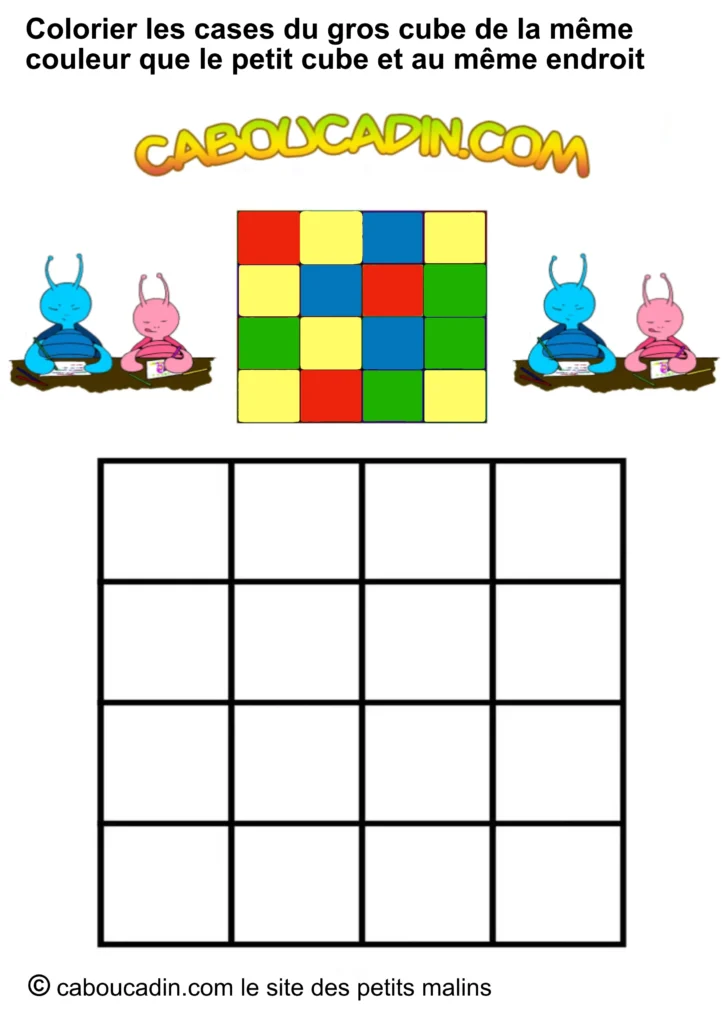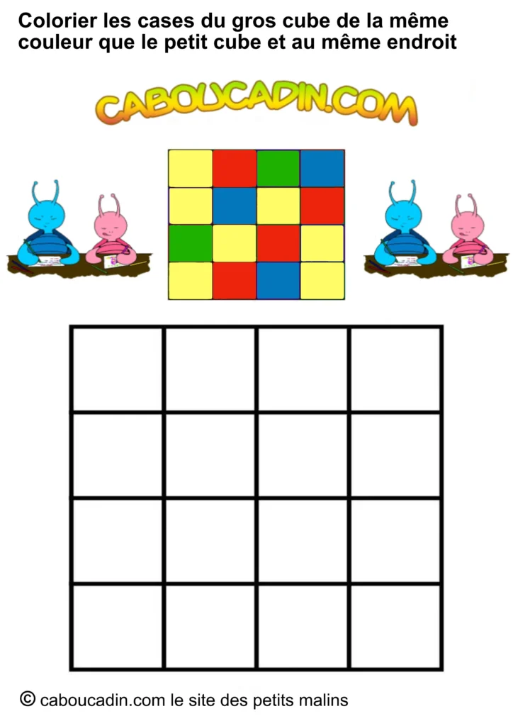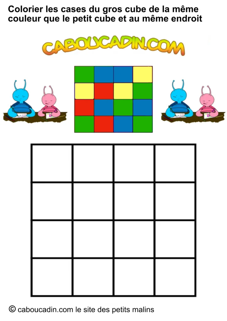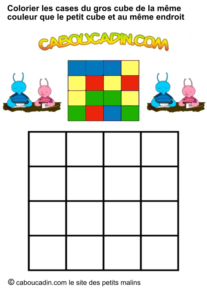 Regarde bien l’image : en haut, un petit carré avec neuf étuis colorés (rouge, bleu, jaune, vert). Juste en dessous, un grand carré avec des cases toutes blanches, qui n’attendent qu’une chose… être coloriées ! Et ce n’est pas tout : deux petits personnages caboucadin rigides, un bleu et une rose, semblent encourager l’enfant à se lancer dans le jeu.