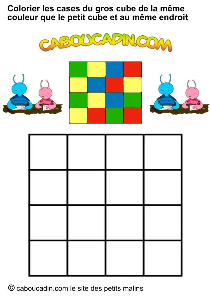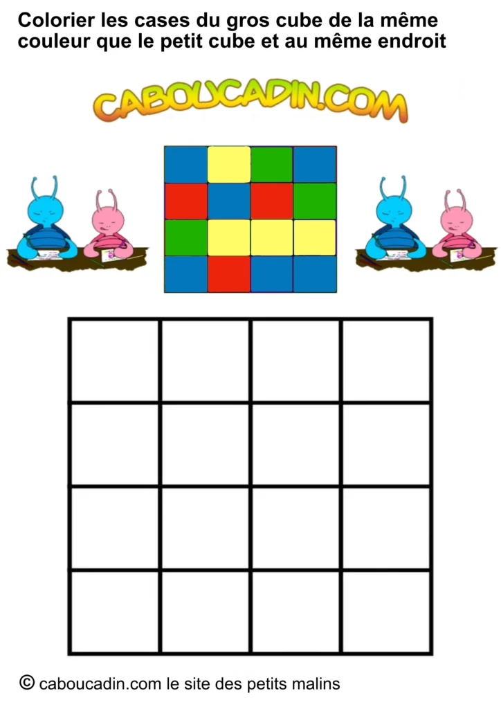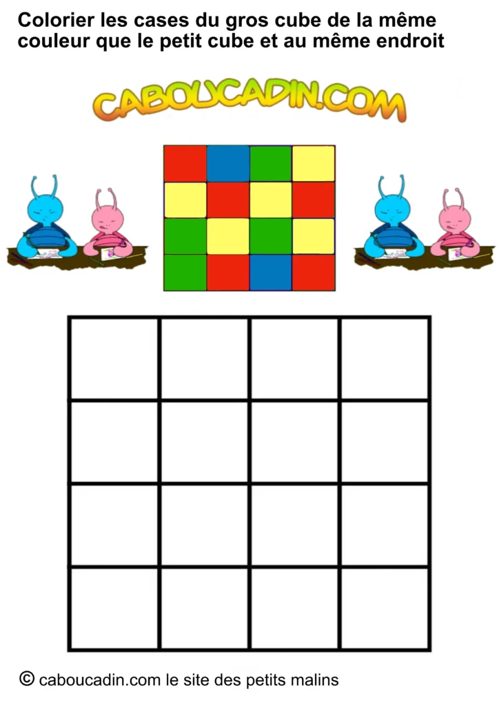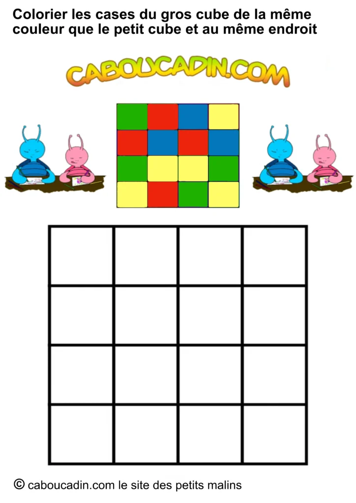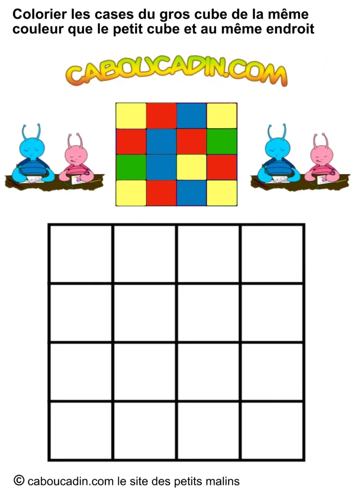 Regarde bien l’image : en haut, un petit carré avec neuf étuis colorés (rouge, bleu, jaune, vert). Juste en dessous, un grand carré avec des cases toutes blanches, qui n’attendent qu’une chose… être coloriées ! Et ce n’est pas tout : deux petits personnages caboucadin rigides, un bleu et une rose, semblent encourager l’enfant à se lancer dans le jeu.