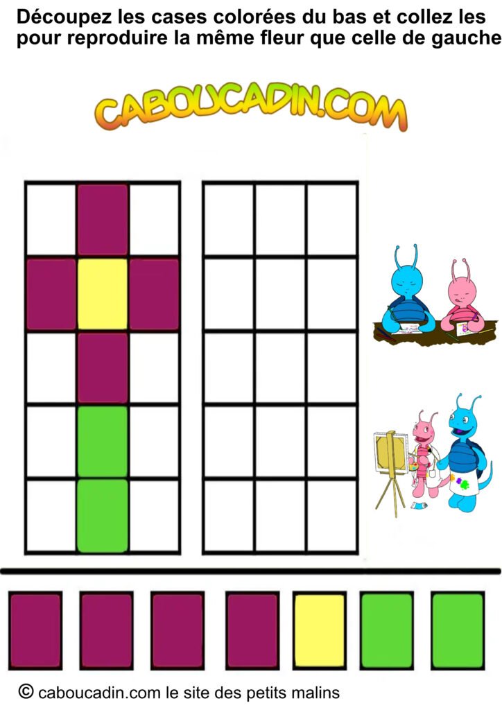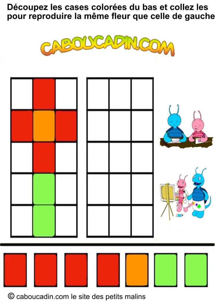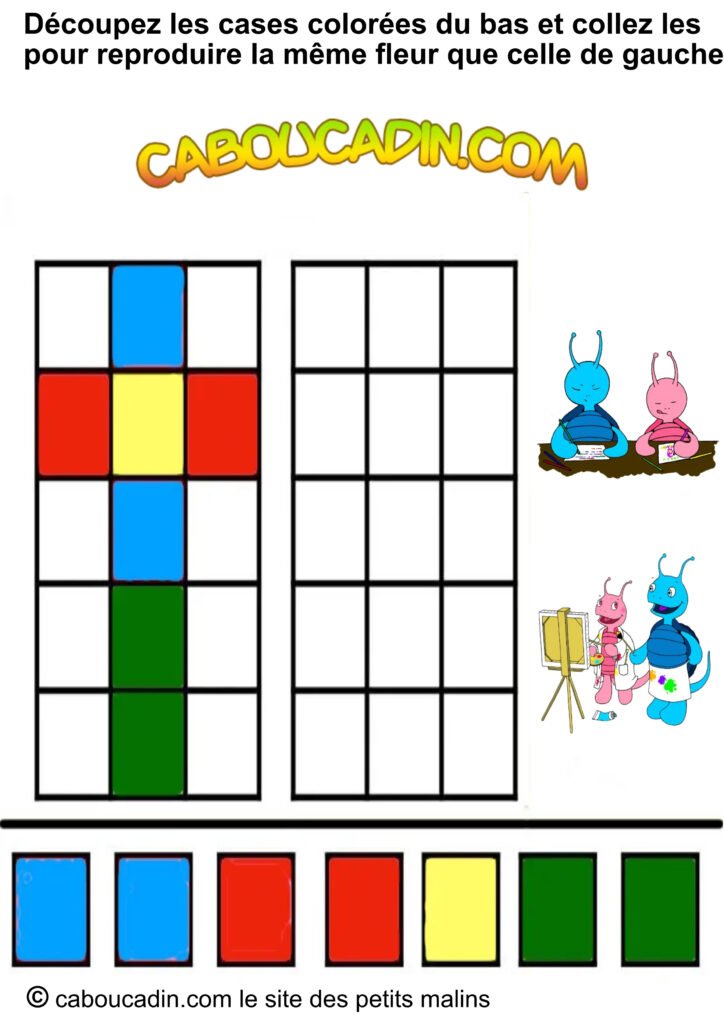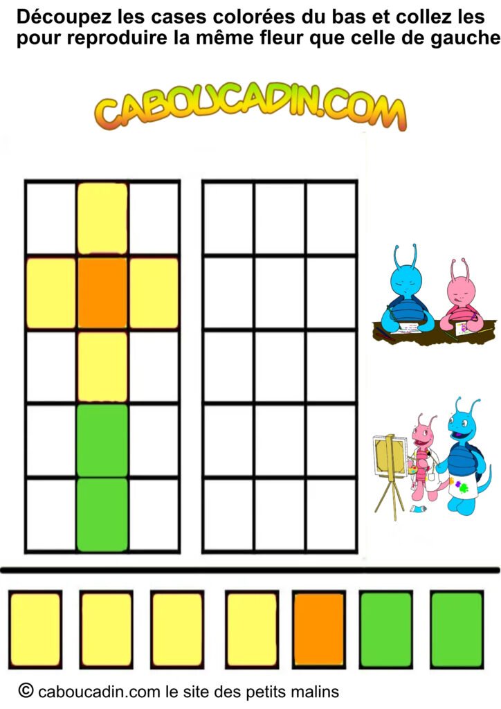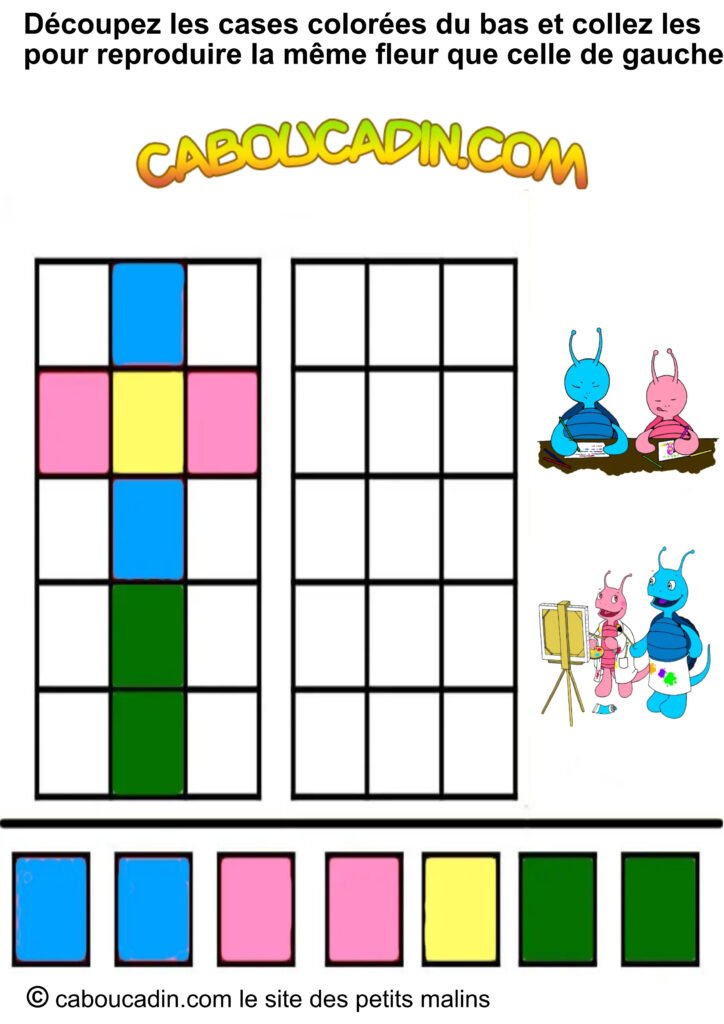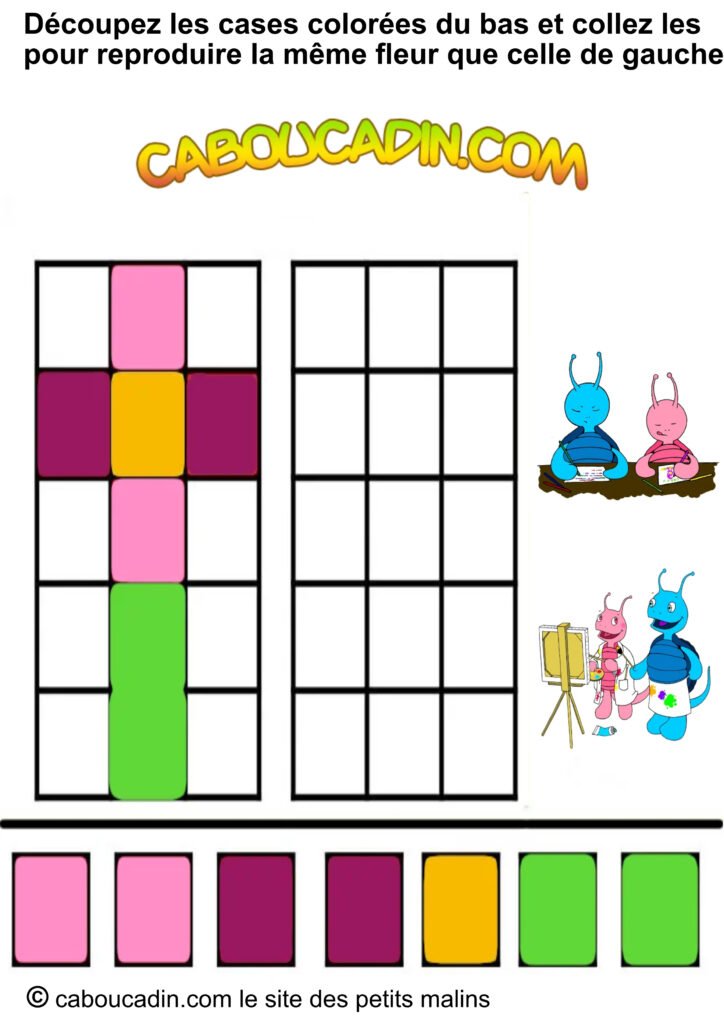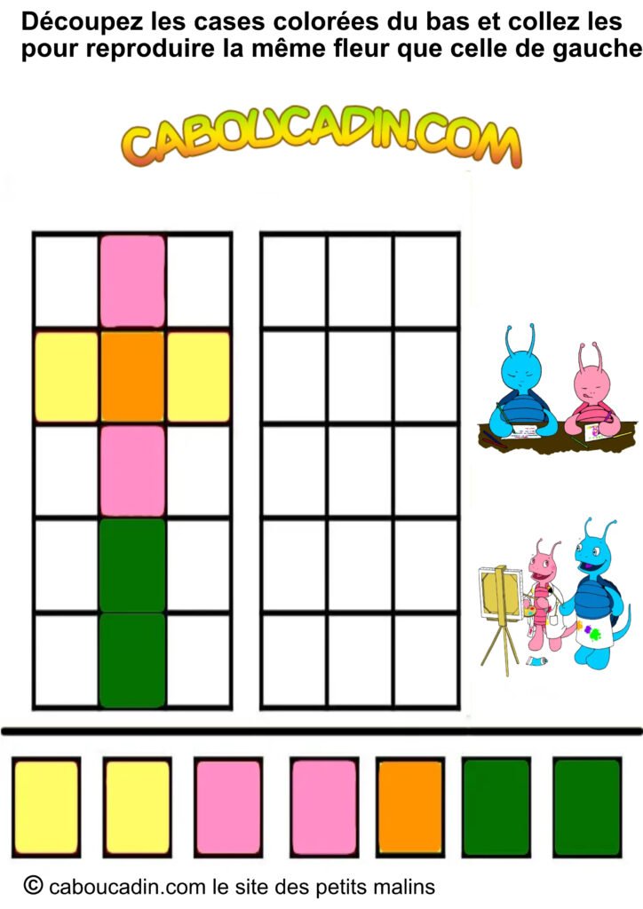 📢 Un titre super clair : « Découpe les carrés colorés en bas et colle-les pour recréer la même fleur que celle de gauche. » Pas compliqué, hein ?