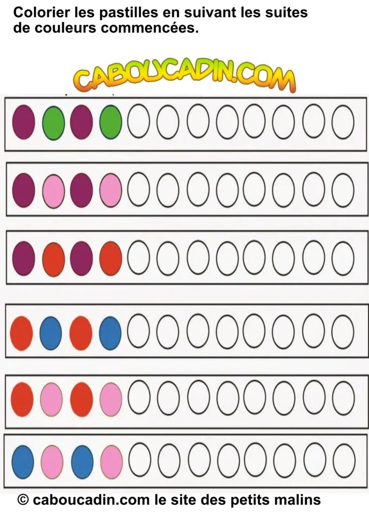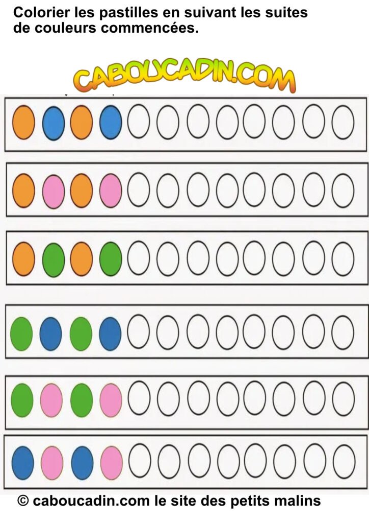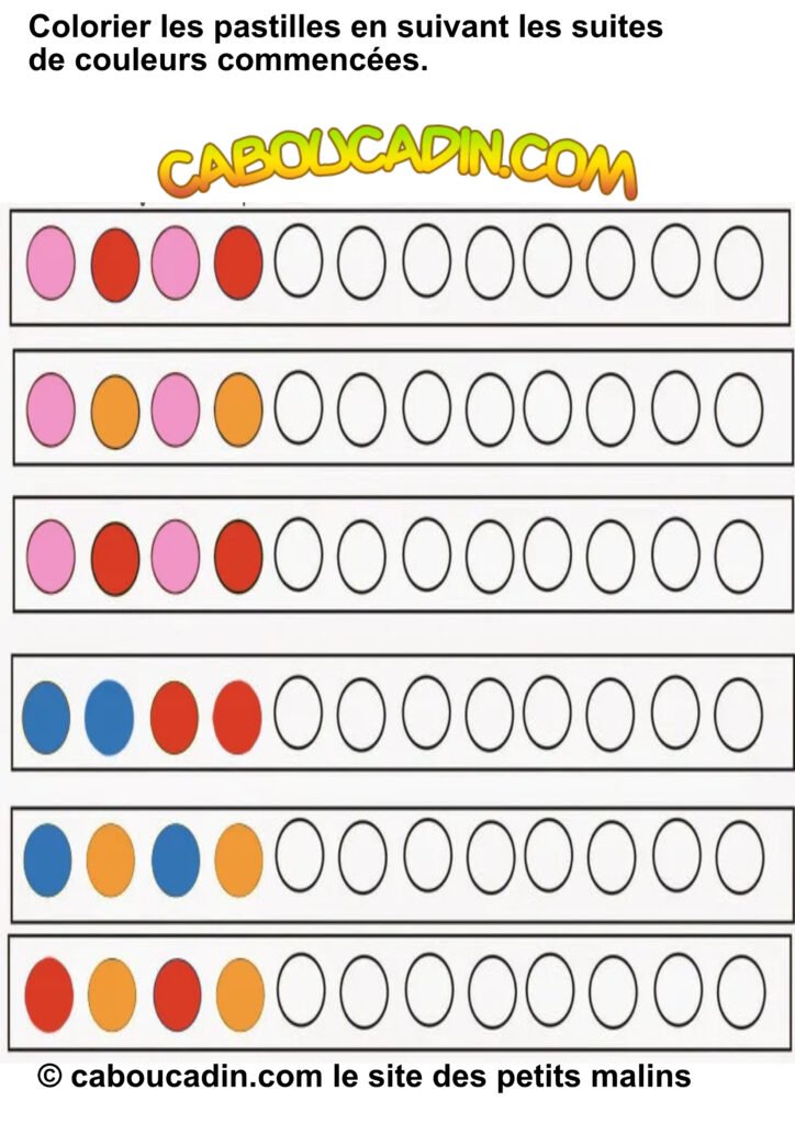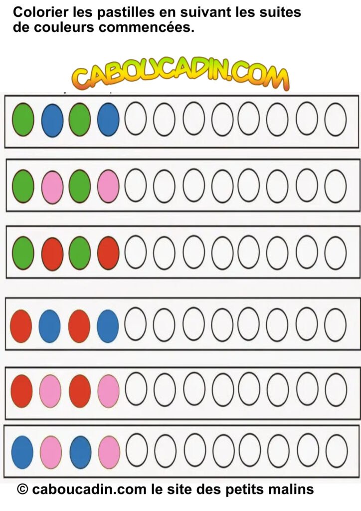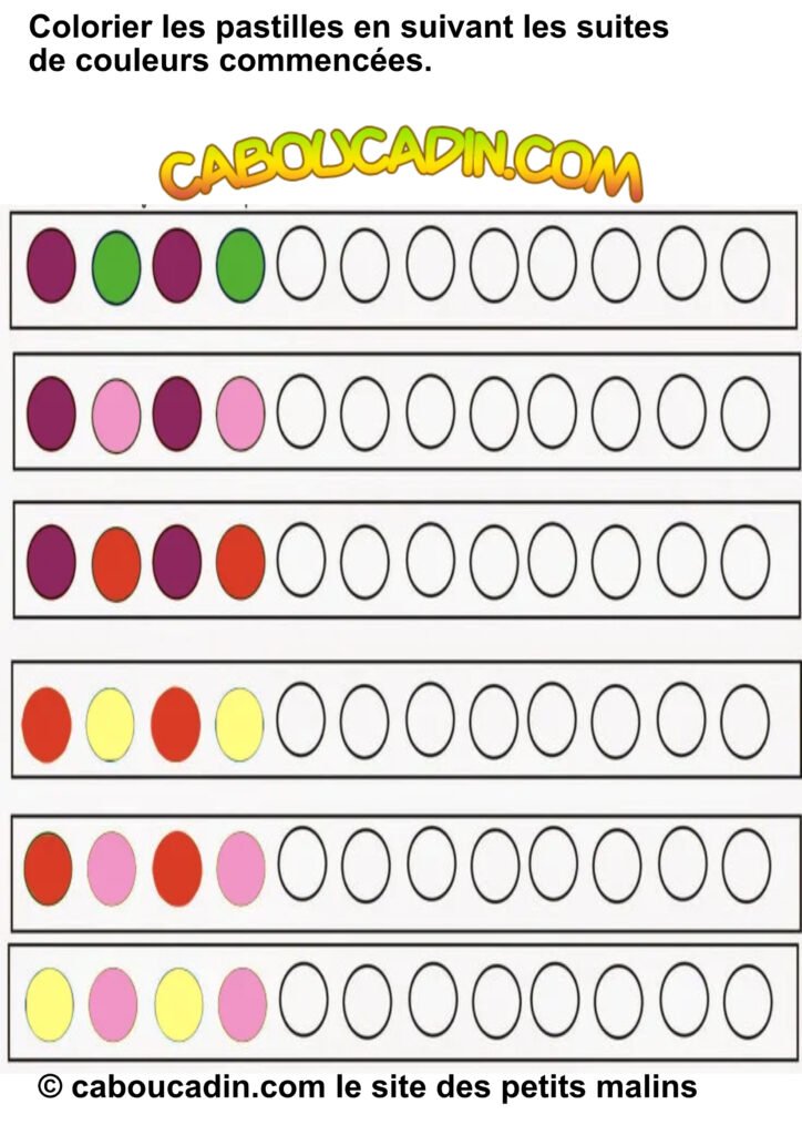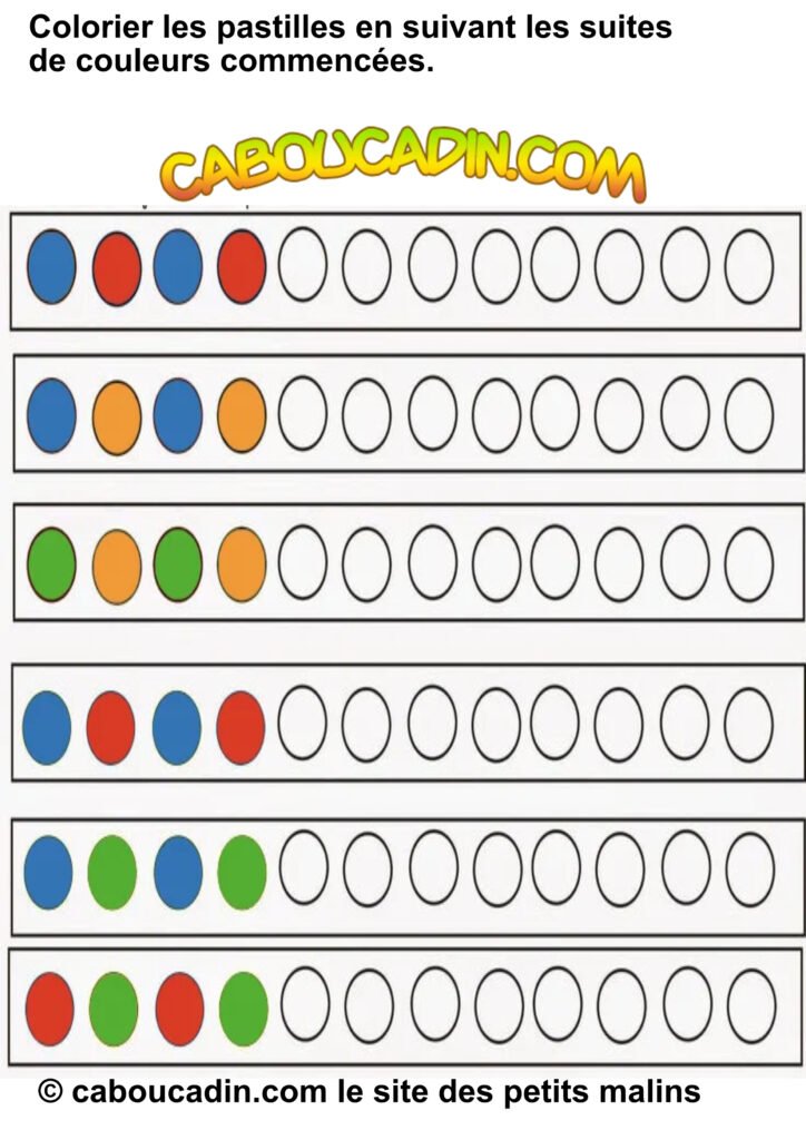 Une activité super cool pour s’amuser avec les couleurs ! 10 fiches maternelles suites logiques de couleurs. Aujourd’hui, on te présente une fiche d’activités hyper chouette pour apprendre à repérer et à reproduire des suites de couleurs. Allez, viens, on jette un coup d’œil ensemble !