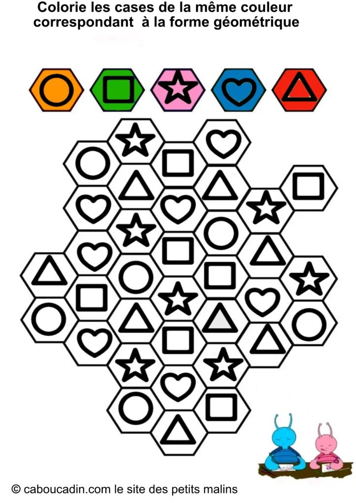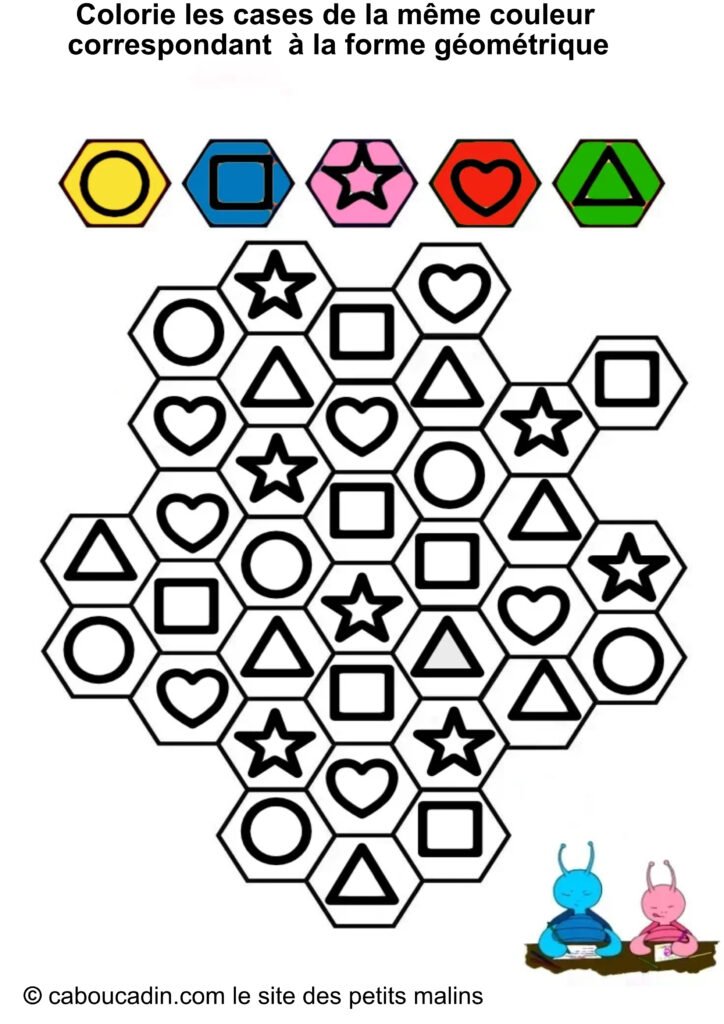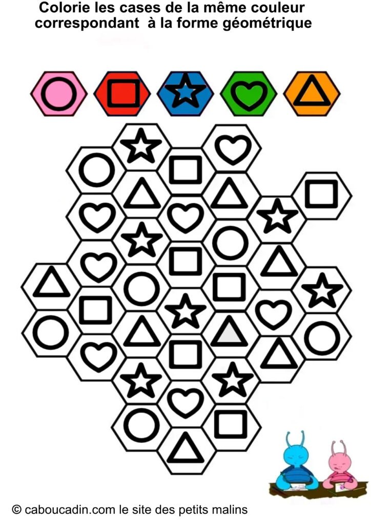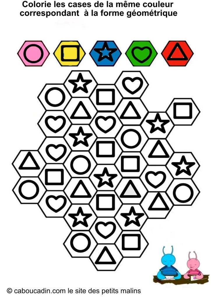 Titre : « Colorie les cases de la même couleur correspondant à la forme géométrique ». Ce titre explique clairement ce que les enfants devront faire.