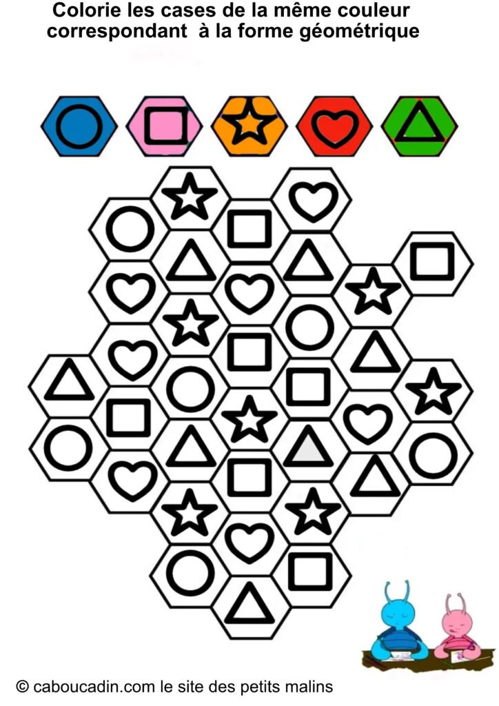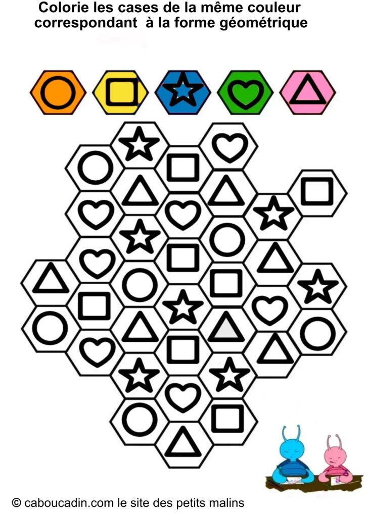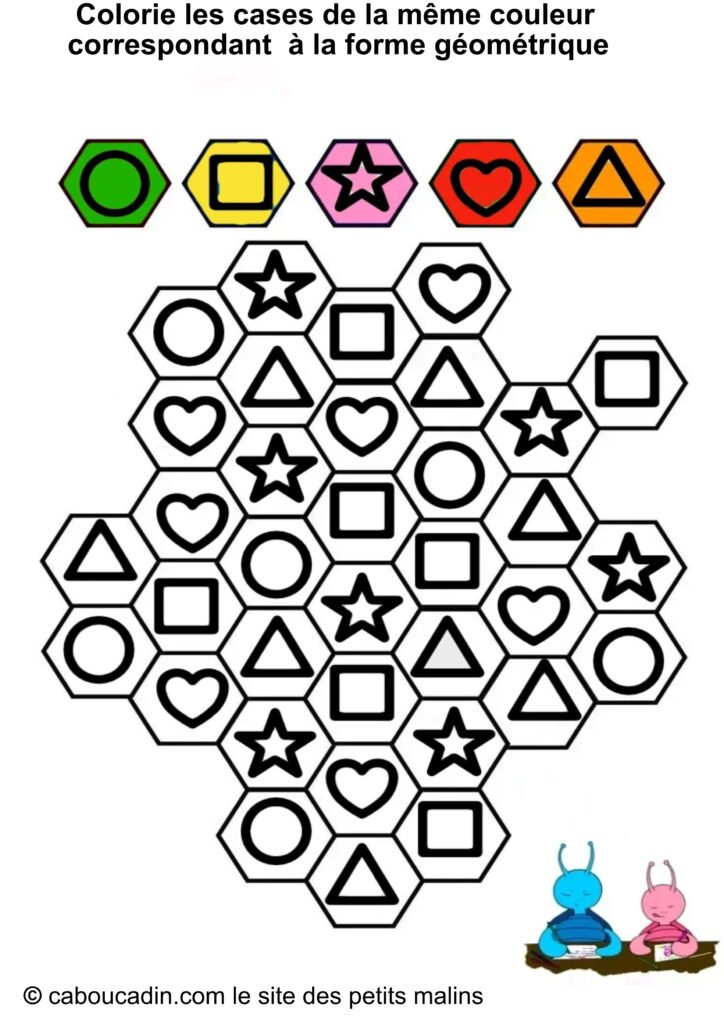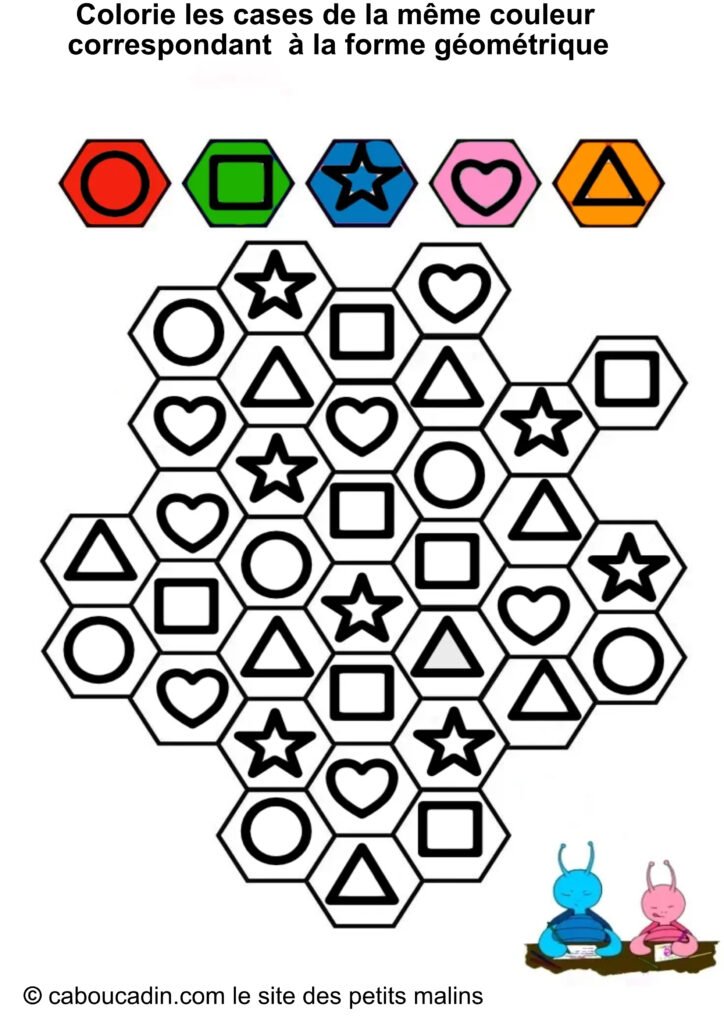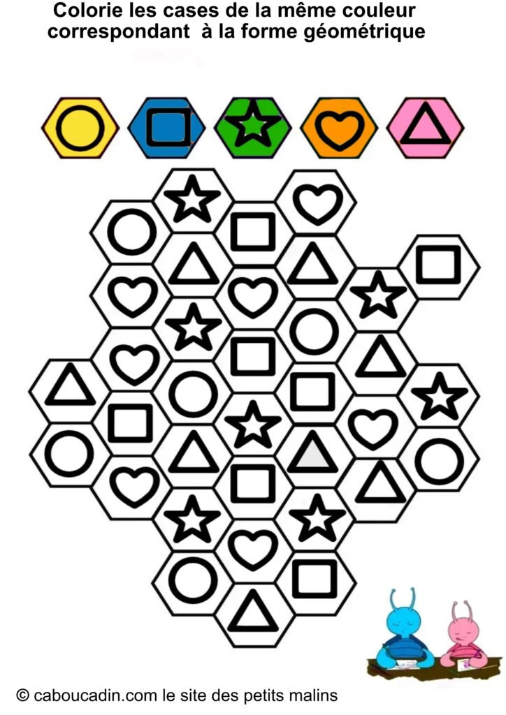 Titre : « Colorie les cases de la même couleur correspondant à la forme géométrique ». Ce titre explique clairement ce que les enfants devront faire.