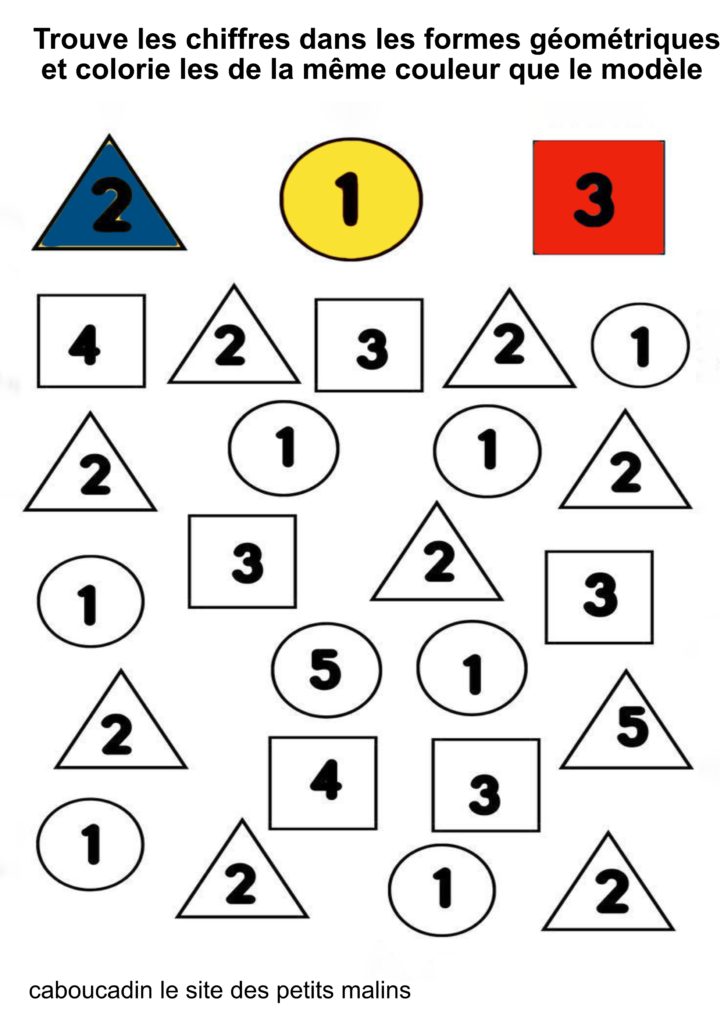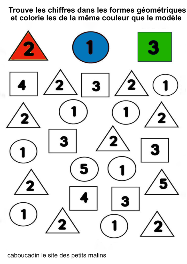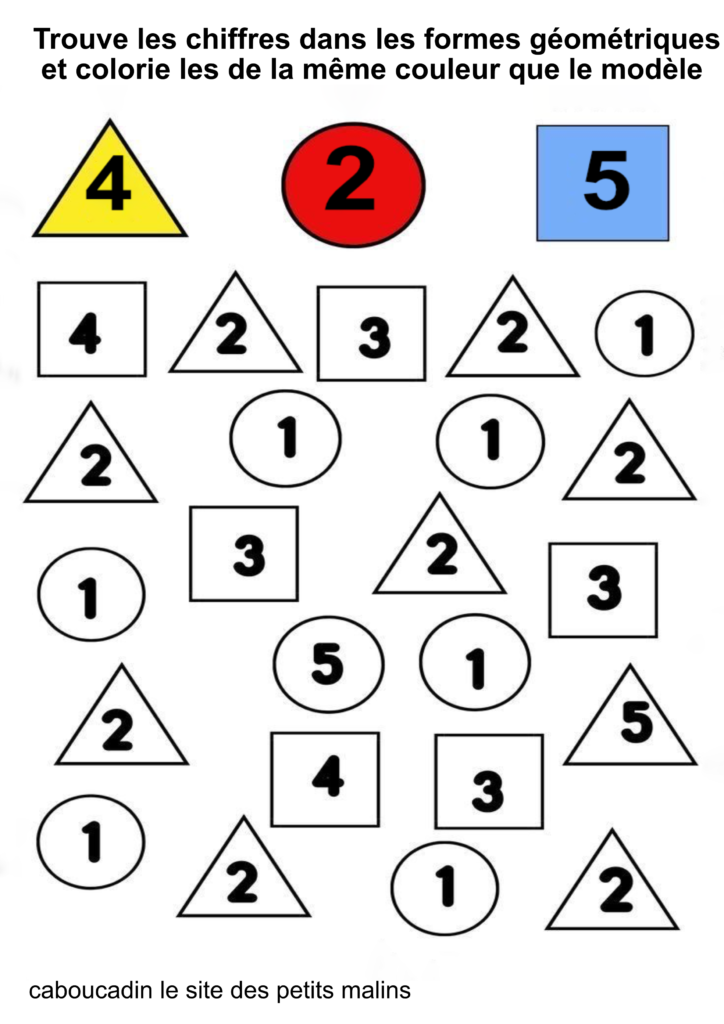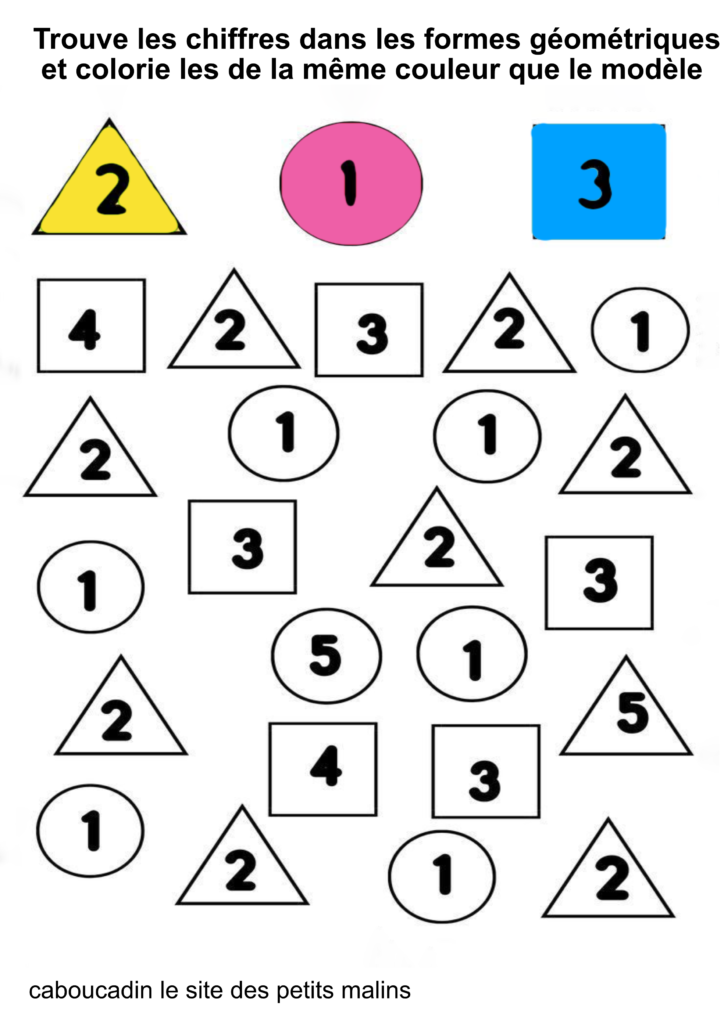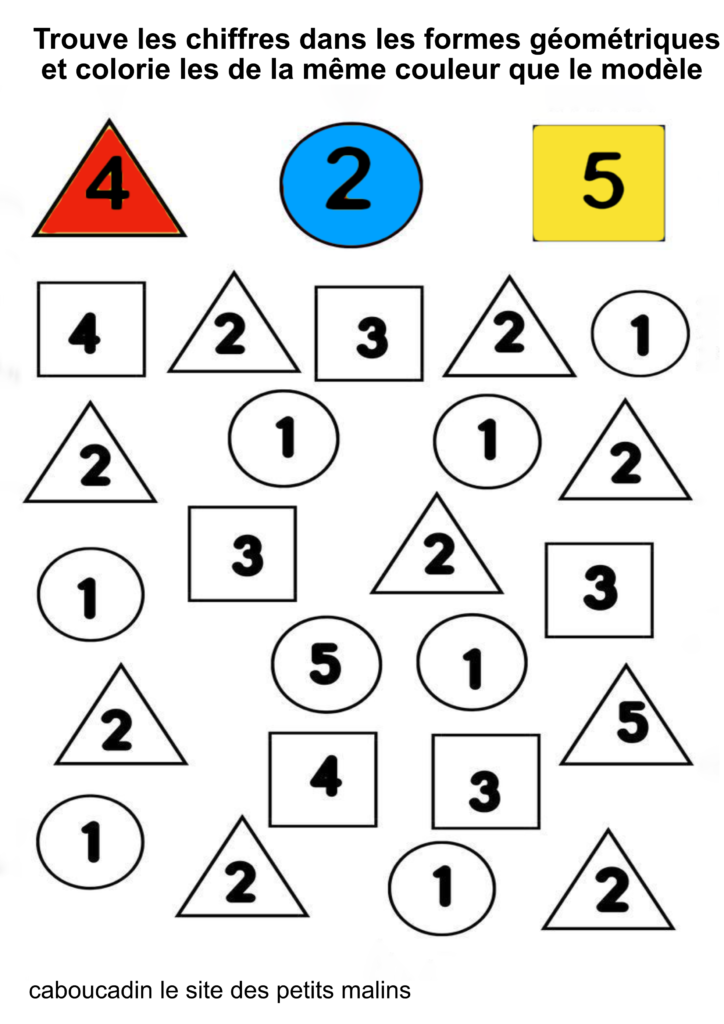 15 fiches maternelles : apprendre les chiffres et les couleurs . Ces fiches maternelles présentent un jeu éducatif conçu pour les enfants, simple et amusant. Il se base sur des formes géométriques (carrés, cercles et triangles) qui contiennent des chiffres allant de 1 à 5.