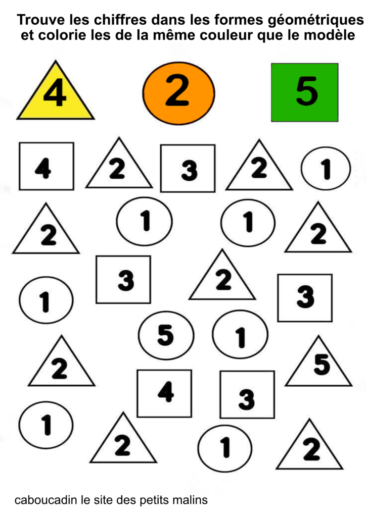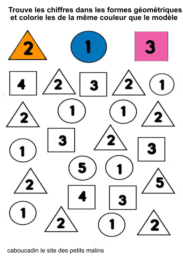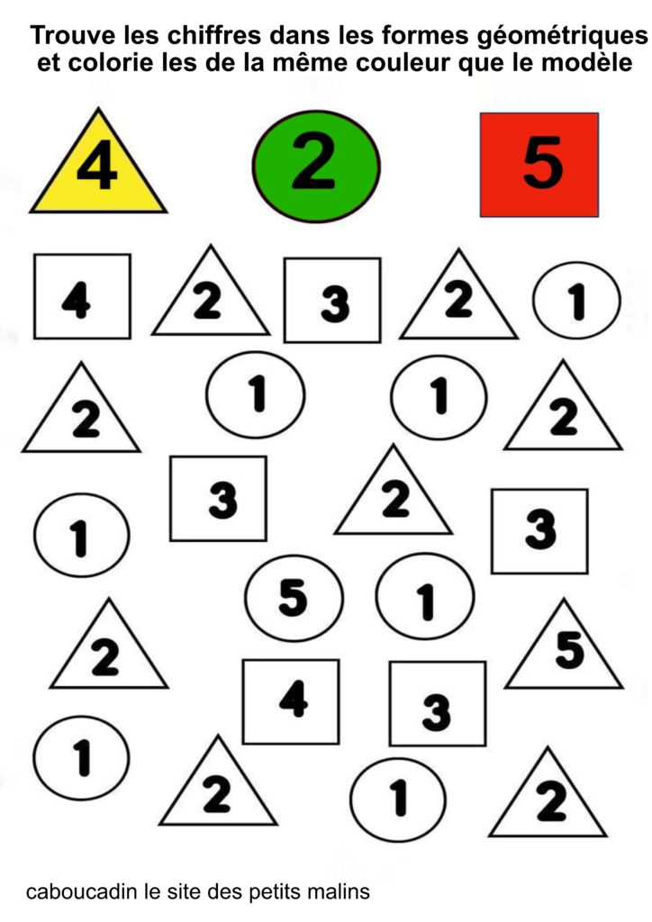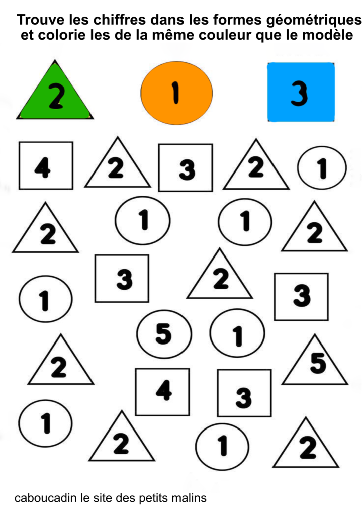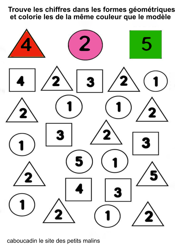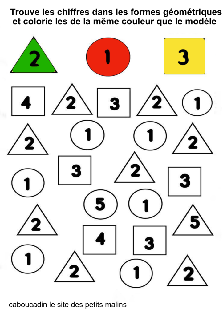 15 fiches maternelles : apprendre les chiffres et les couleurs . Ces fiches maternelles présentent un jeu éducatif conçu pour les enfants, simple et amusant. Il se base sur des formes géométriques (carrés, cercles et triangles) qui contiennent des chiffres allant de 1 à 5.
