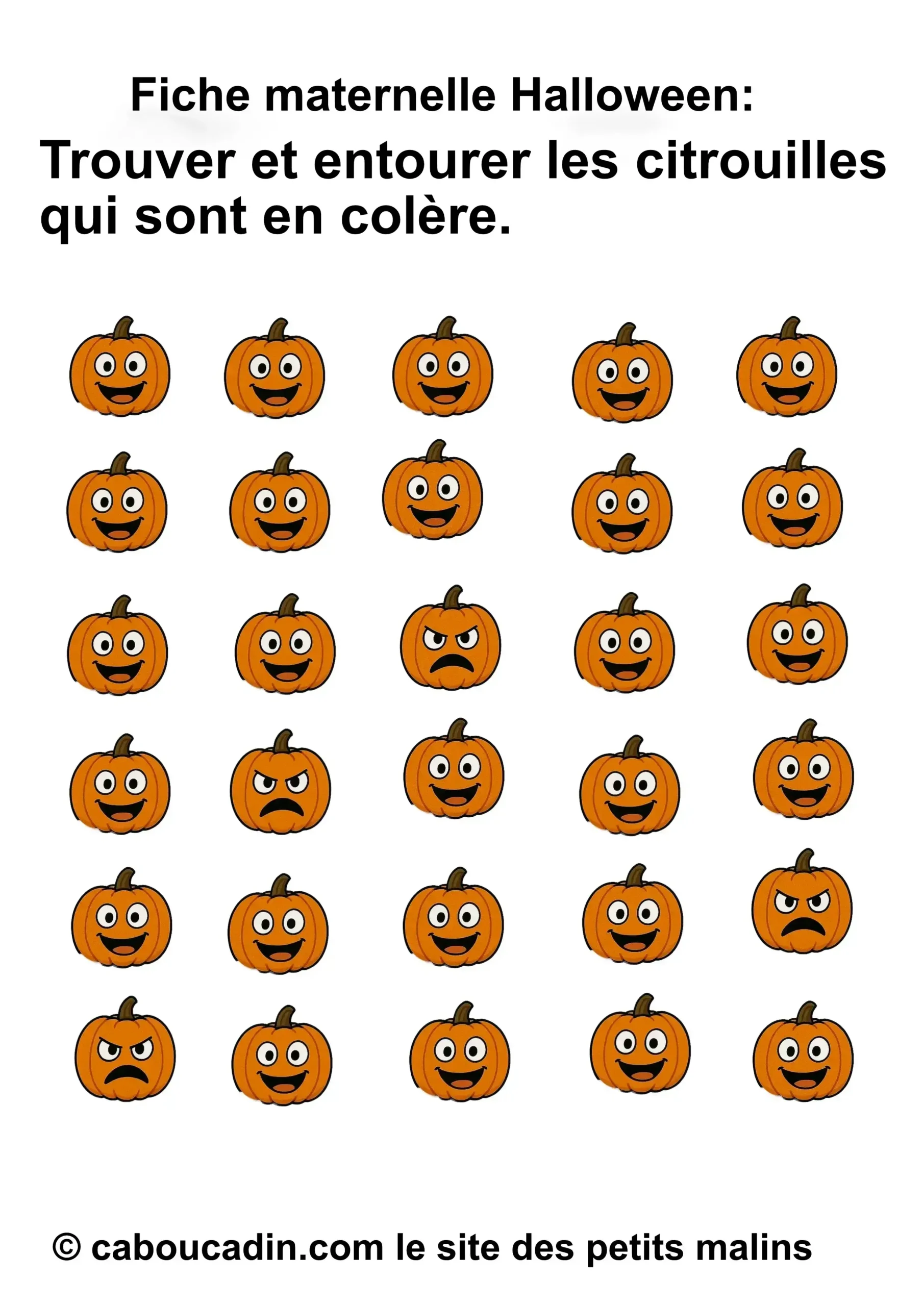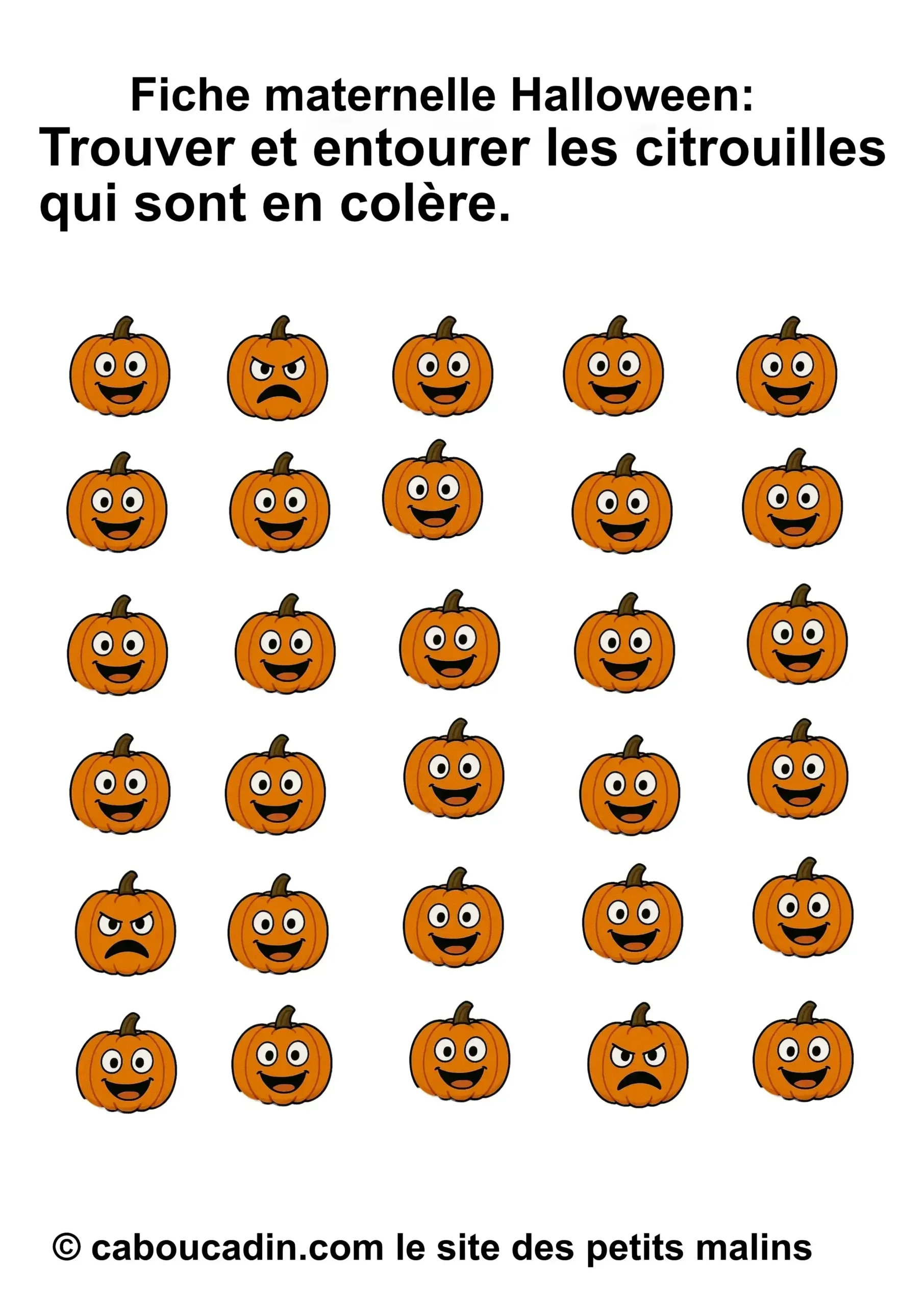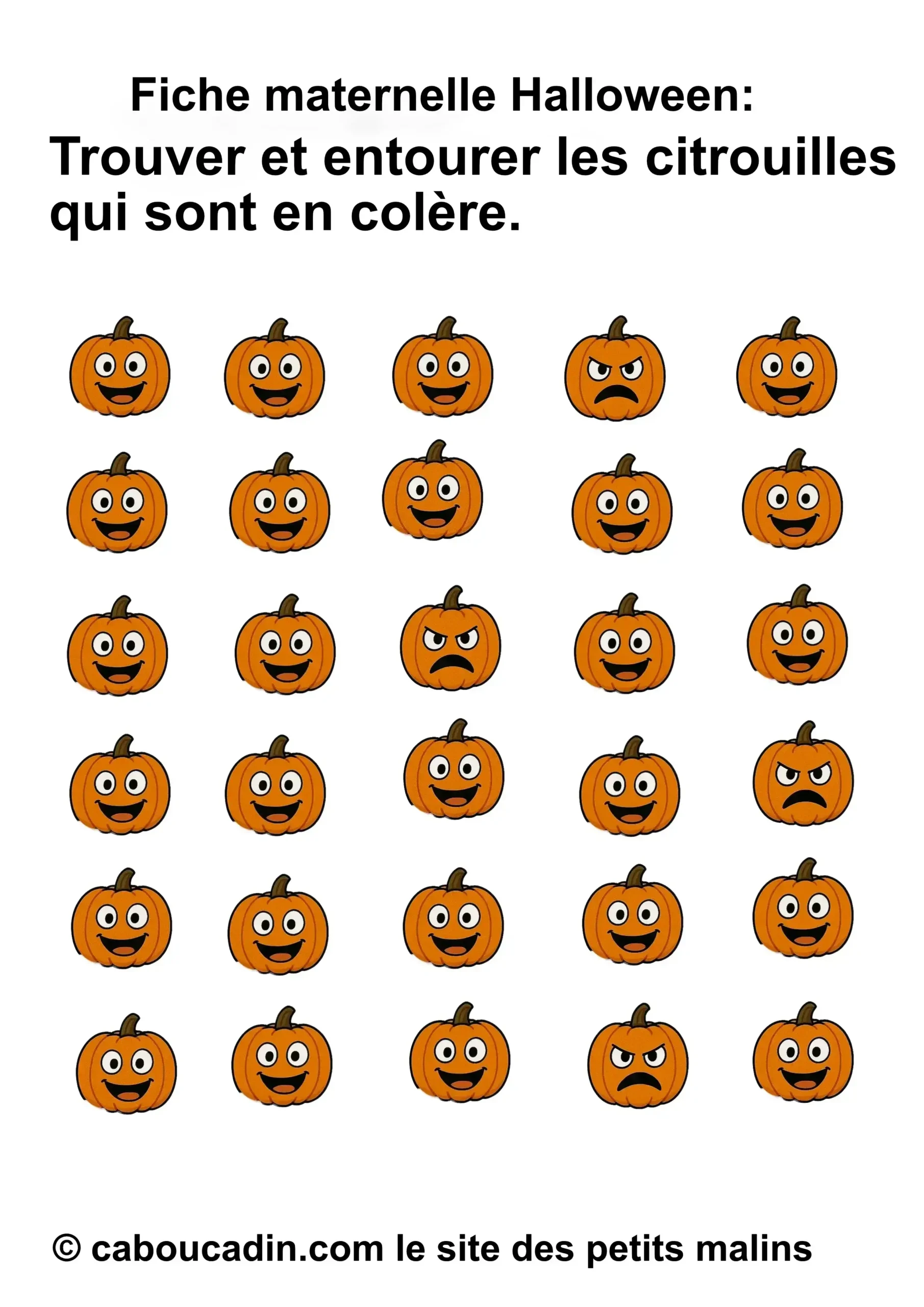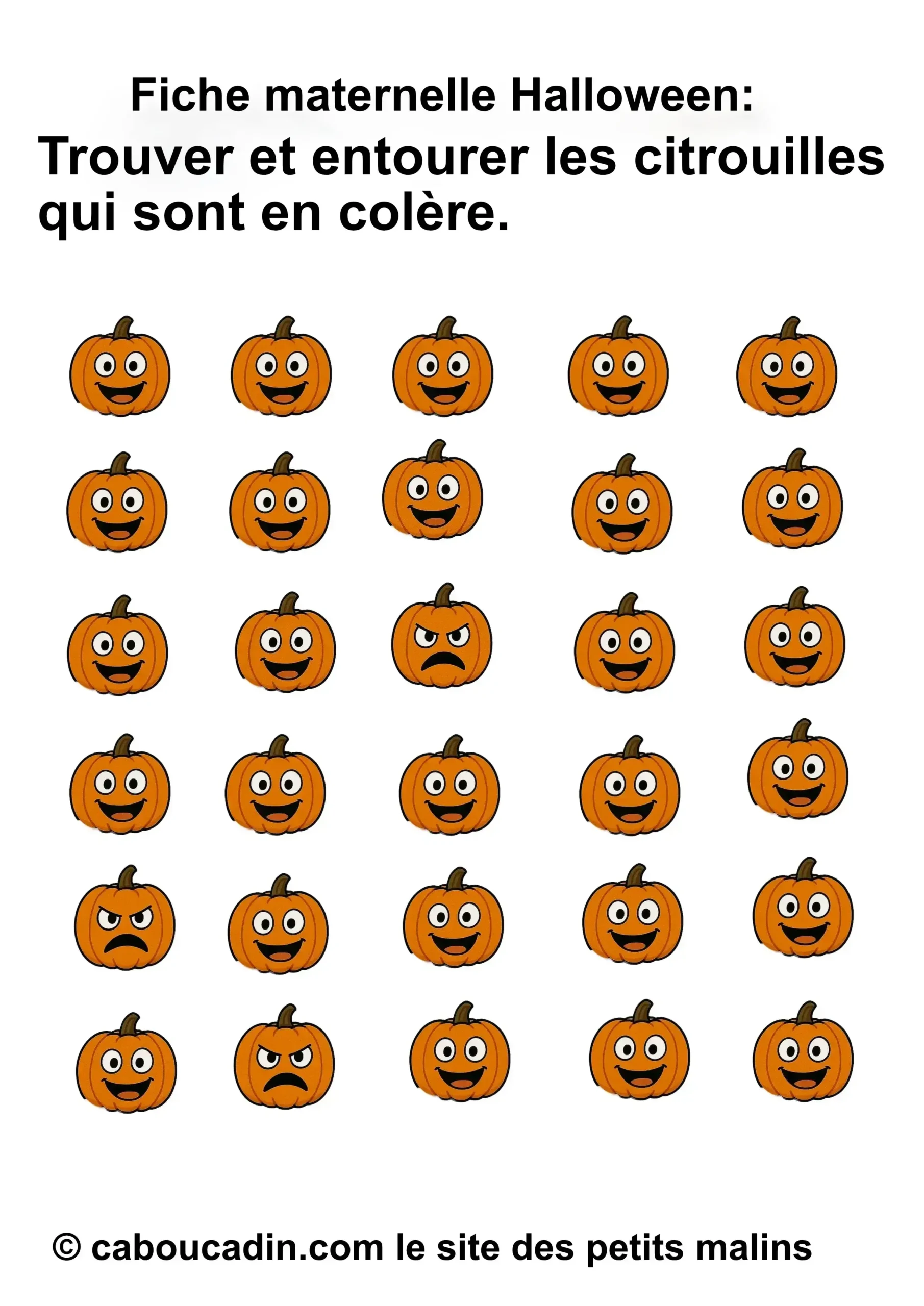 15 Fiches maternelles Halloween : activité à imprimer pour trouver les citrouilles en colère. Halloween, c’est le moment où les citrouilles sortent de leur cachette pour illuminer les maisons, rigoler dans les jardins… mais parfois aussi pour faire un peu la tête ! Eh oui, toutes les citrouilles ne sourient pas. Certaines tirent la langue, d’autres font de grands sourires, et quelques-unes… oh là là… boudent carrément ! 😡