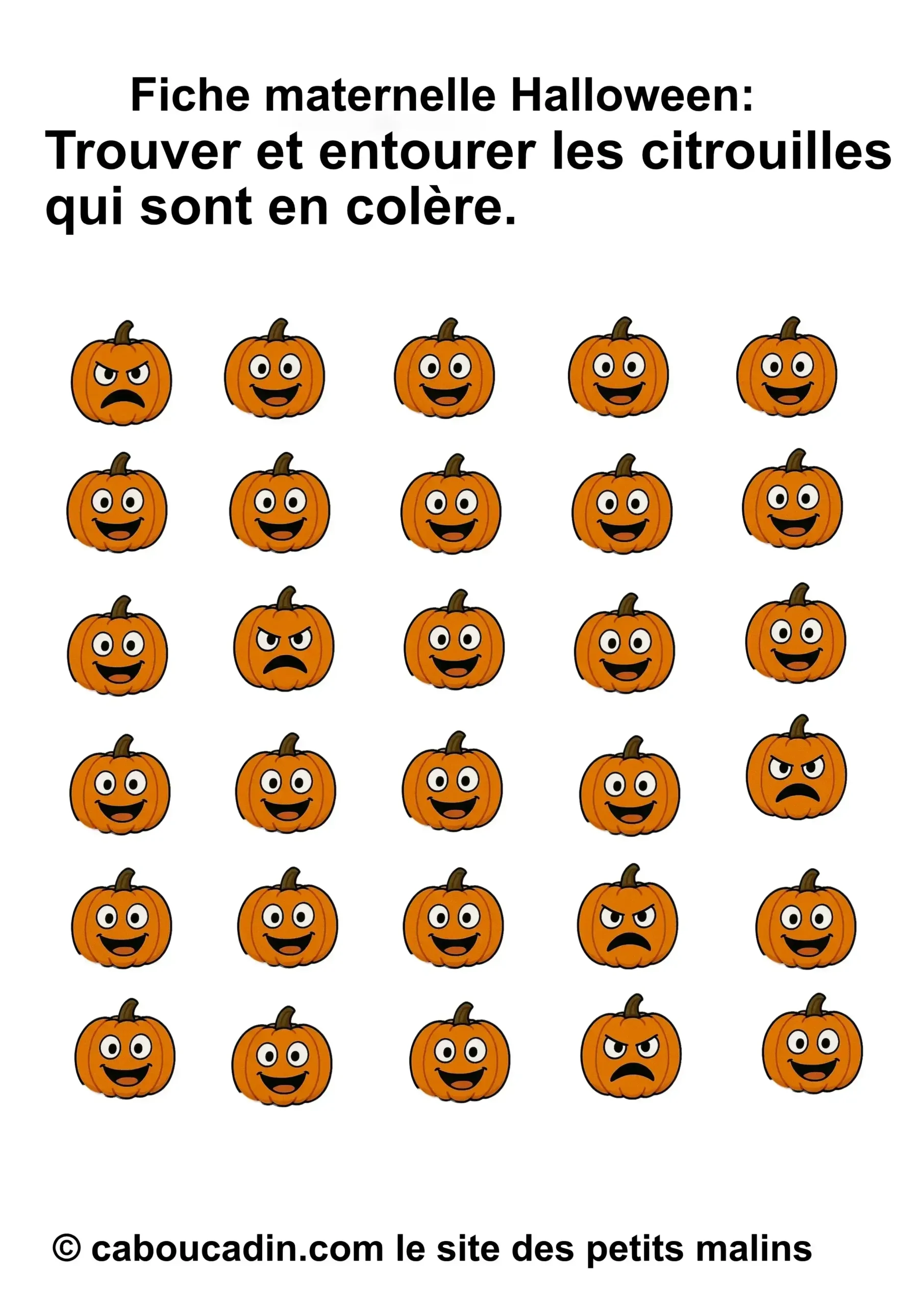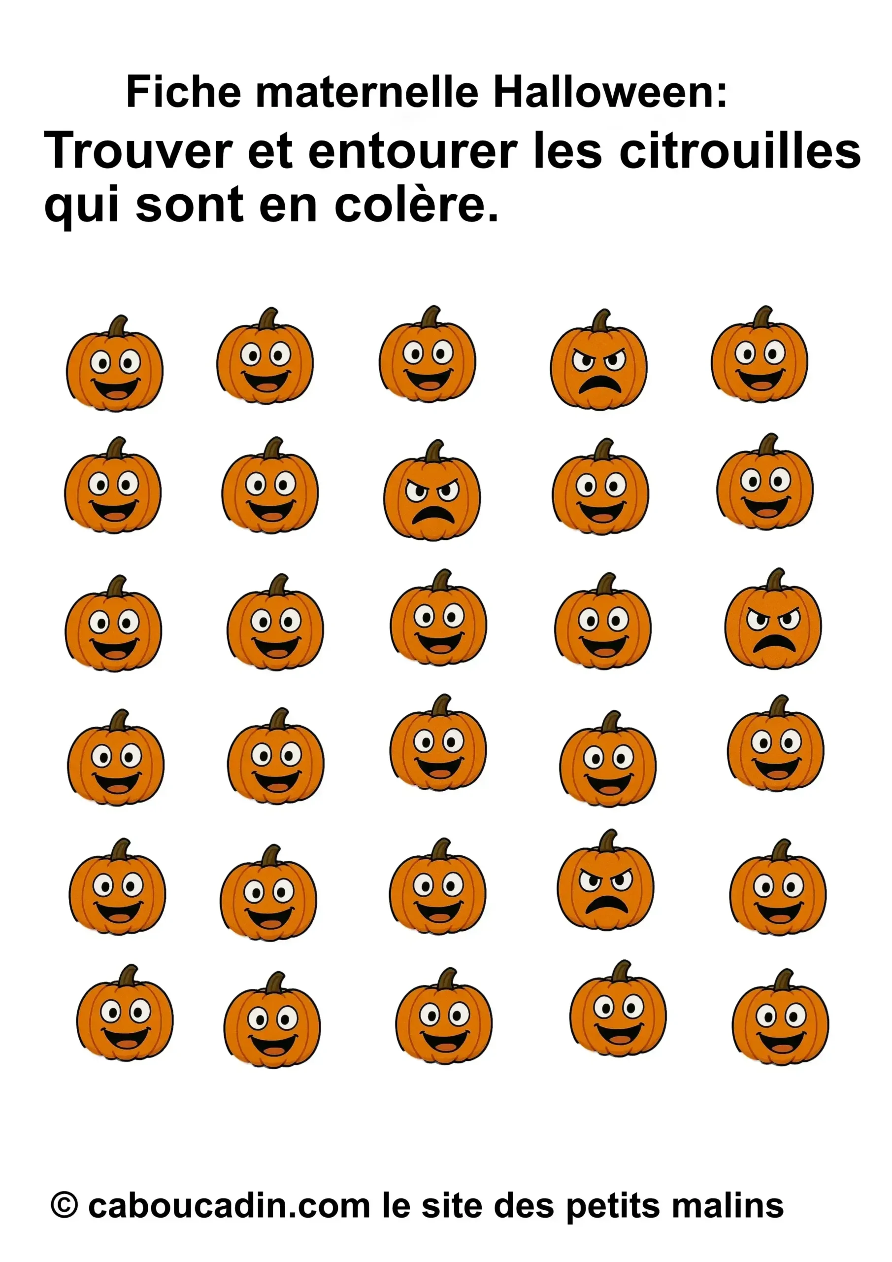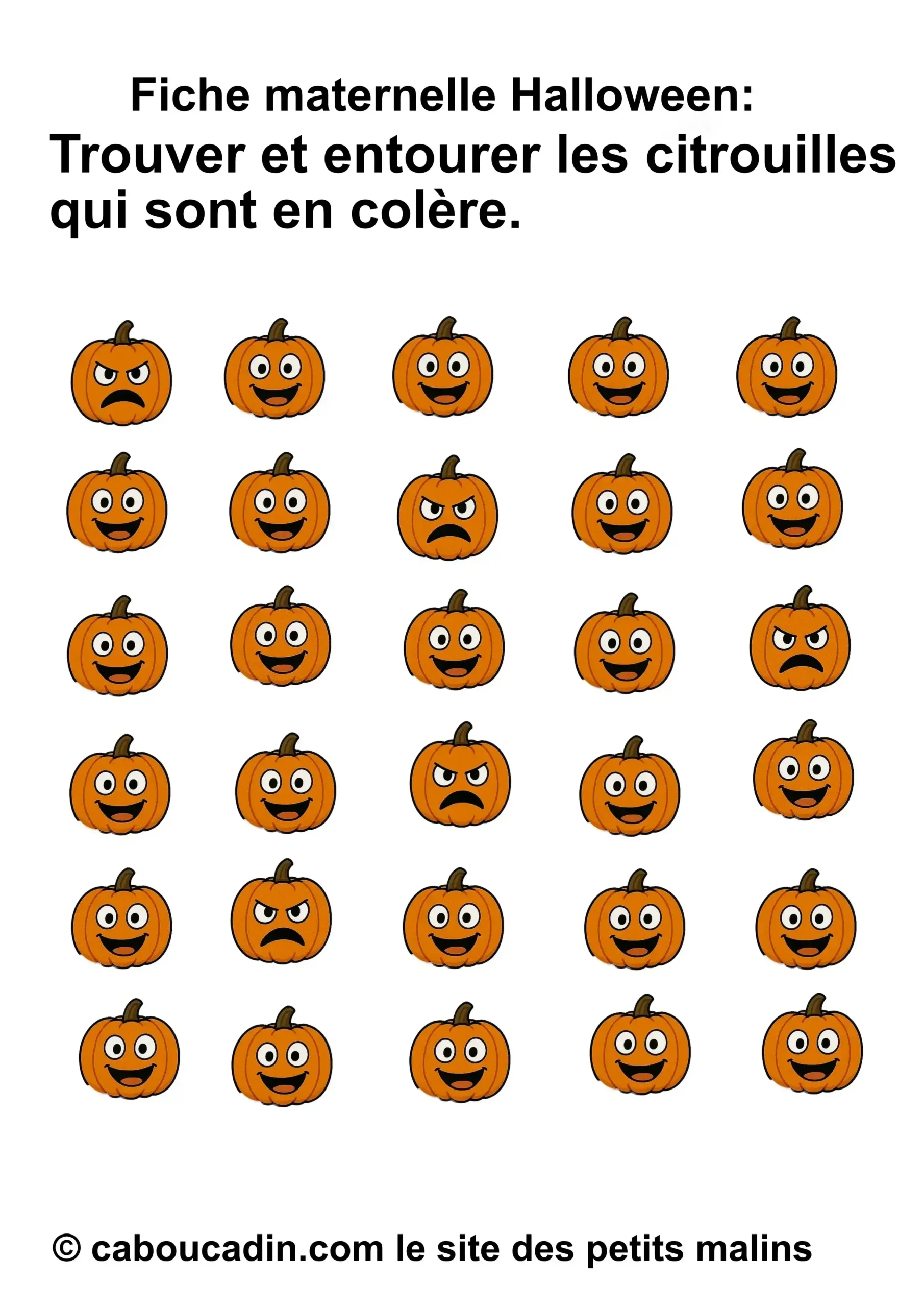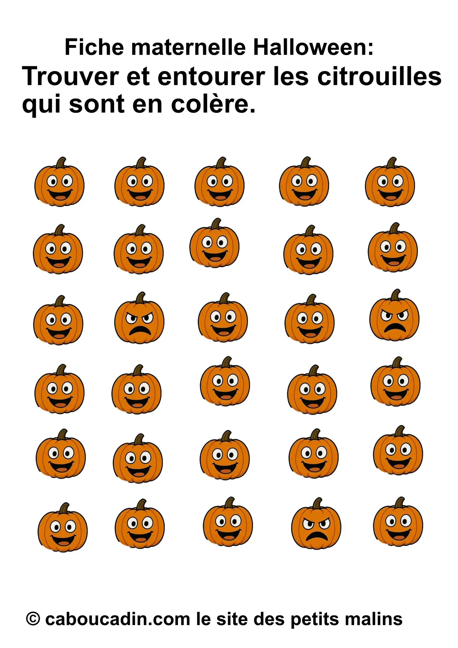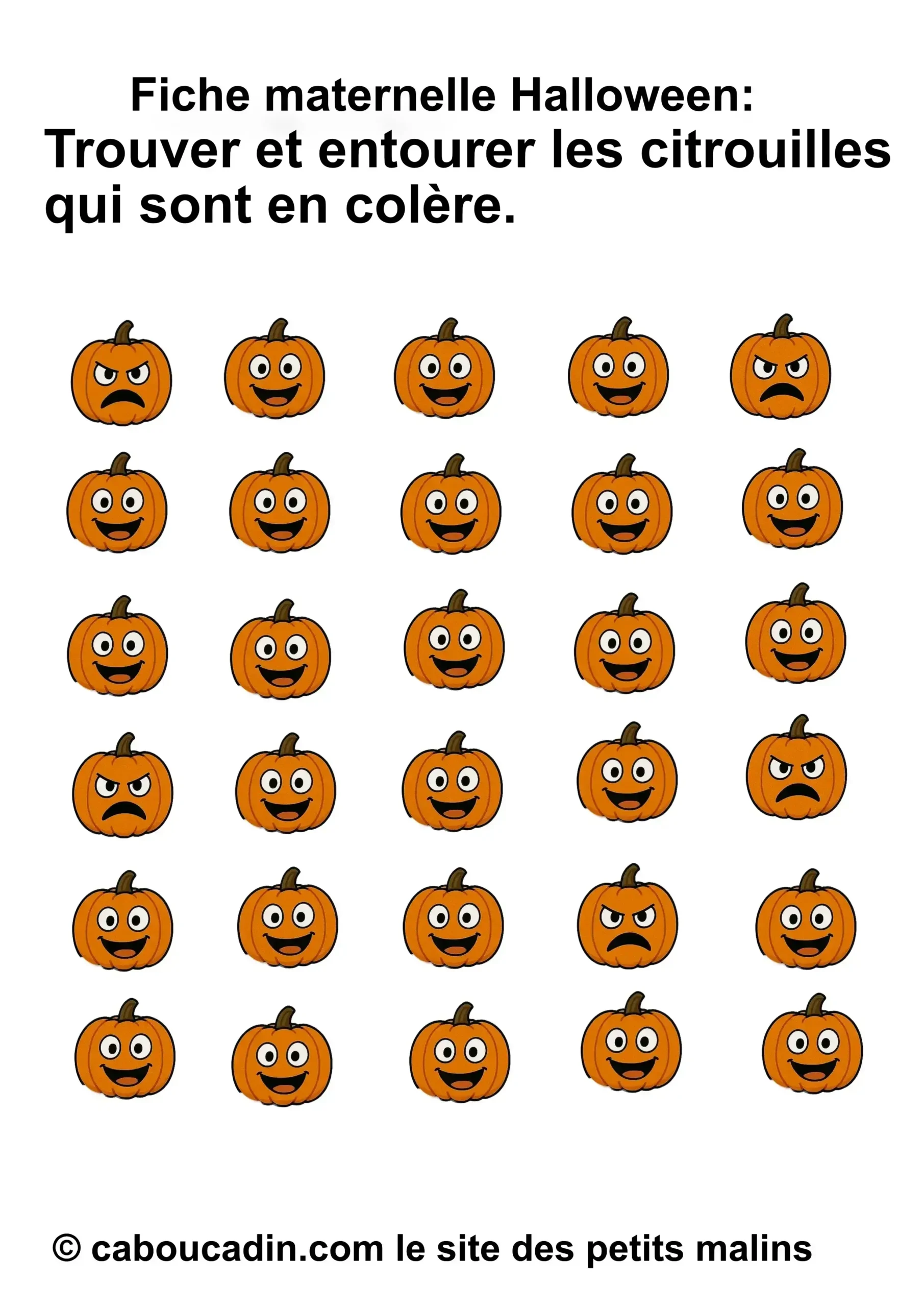 15 Fiches maternelles Halloween : activité à imprimer pour trouver les citrouilles en colère. Halloween, c’est le moment où les citrouilles sortent de leur cachette pour illuminer les maisons, rigoler dans les jardins… mais parfois aussi pour faire un peu la tête ! Eh oui, toutes les citrouilles ne sourient pas. Certaines tirent la langue, d’autres font de grands sourires, et quelques-unes… oh là là… boudent carrément ! 😡