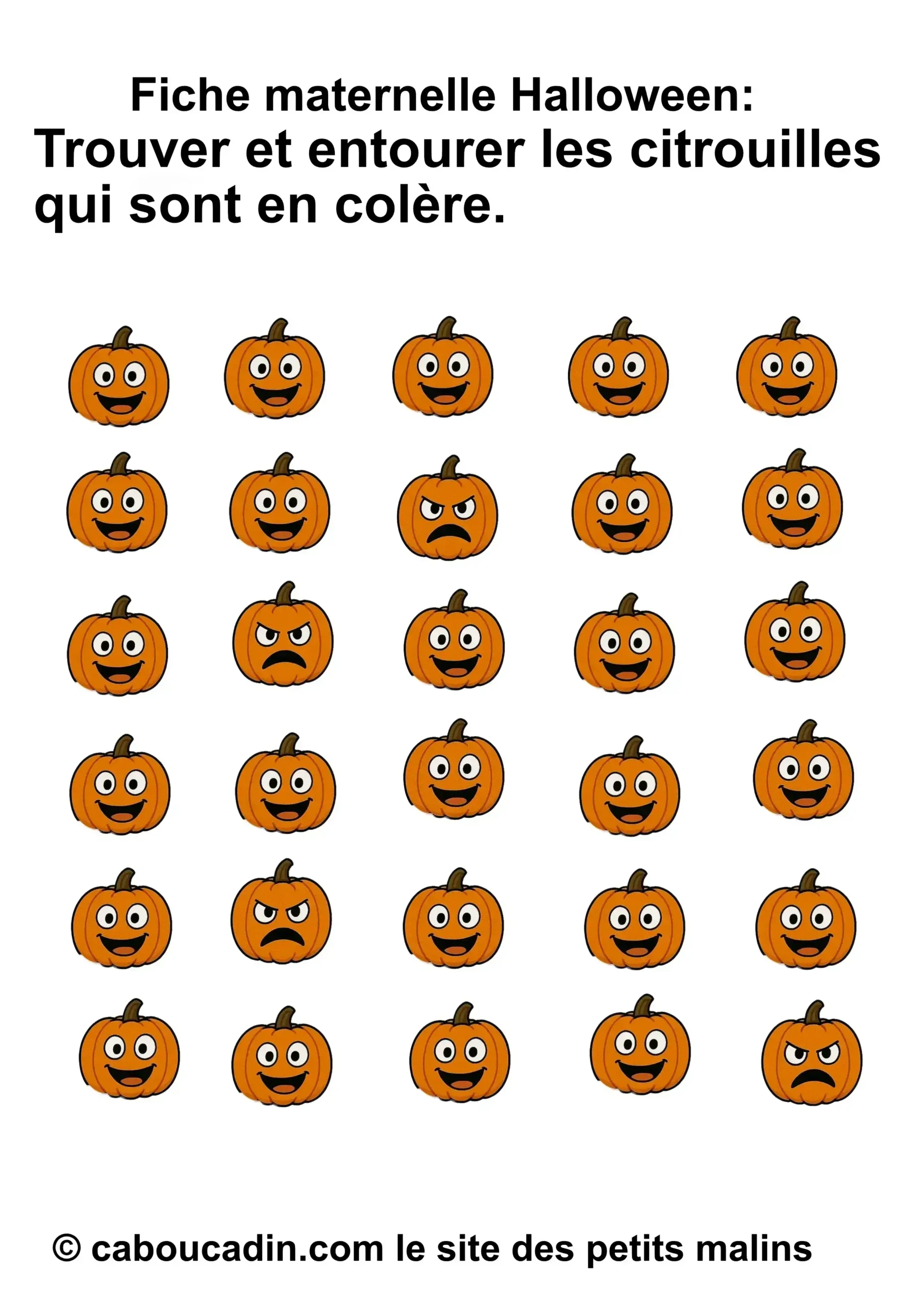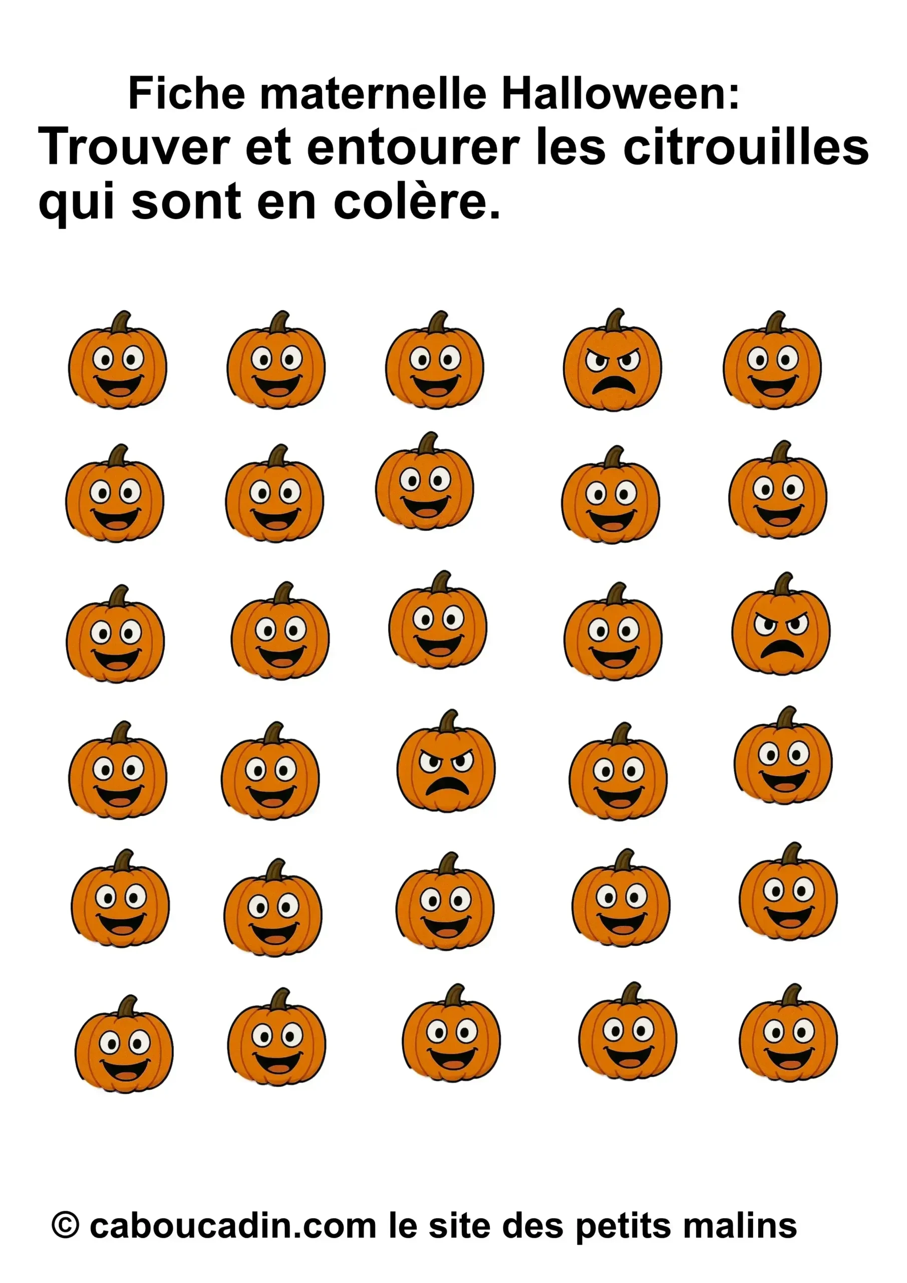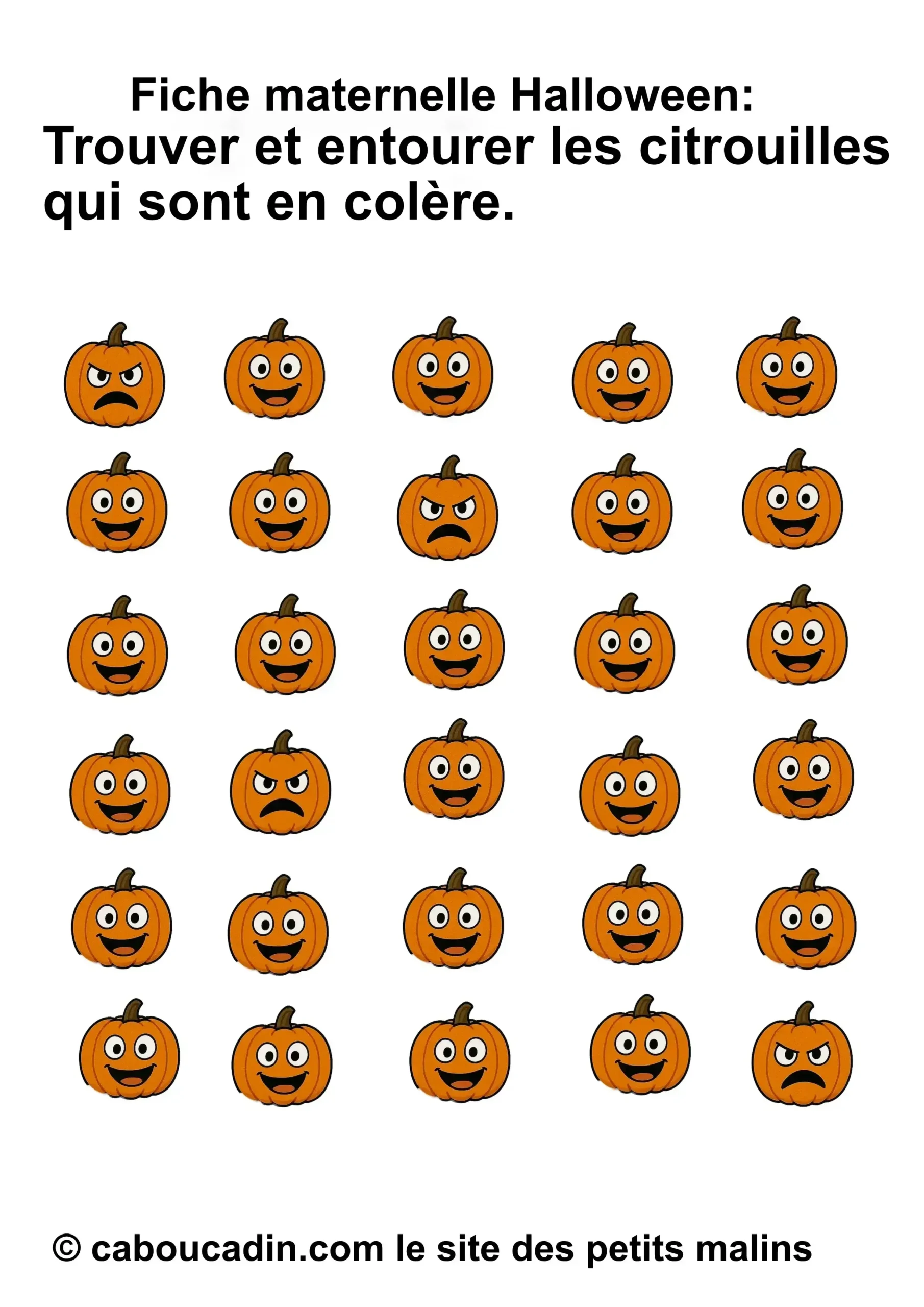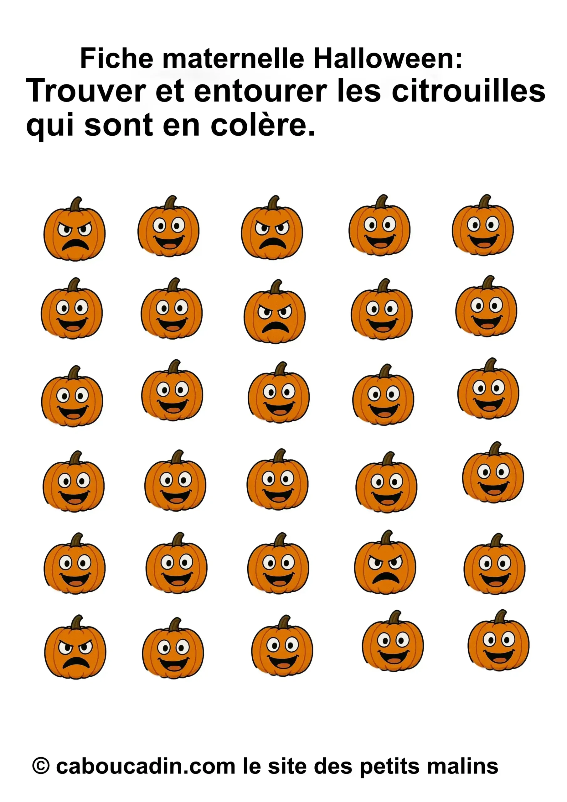 15 Fiches maternelles Halloween : activité à imprimer pour trouver les citrouilles en colère. Halloween, c’est le moment où les citrouilles sortent de leur cachette pour illuminer les maisons, rigoler dans les jardins… mais parfois aussi pour faire un peu la tête ! Eh oui, toutes les citrouilles ne sourient pas. Certaines tirent la langue, d’autres font de grands sourires, et quelques-unes… oh là là… boudent carrément ! 😡