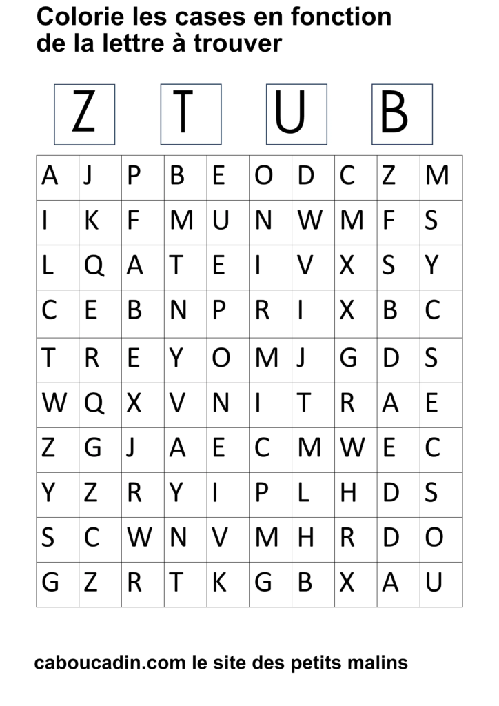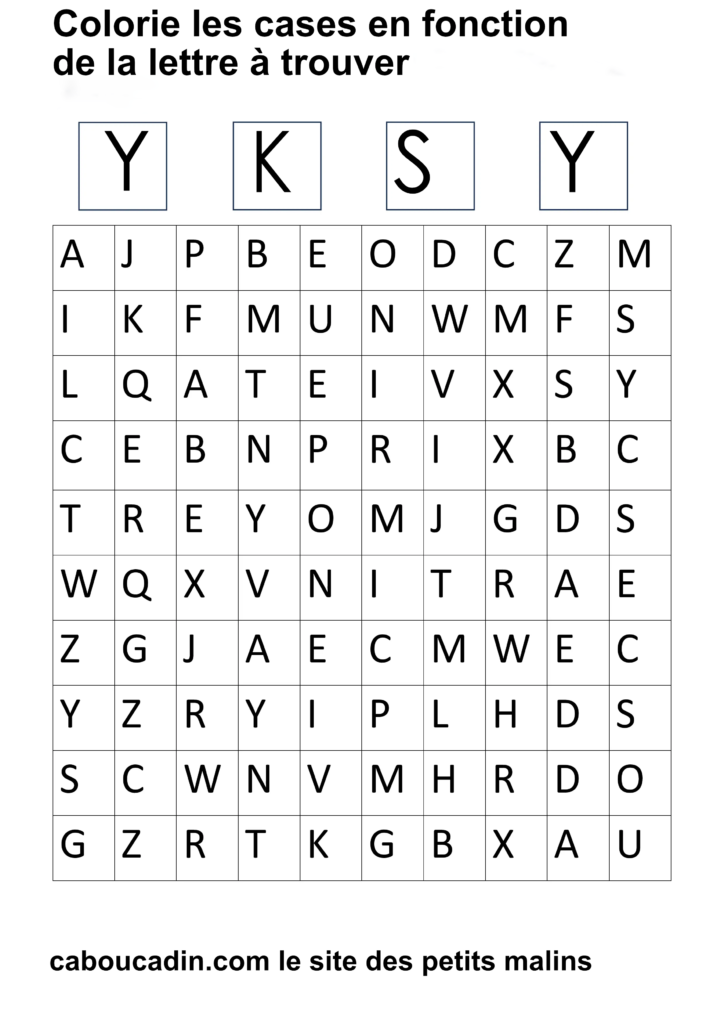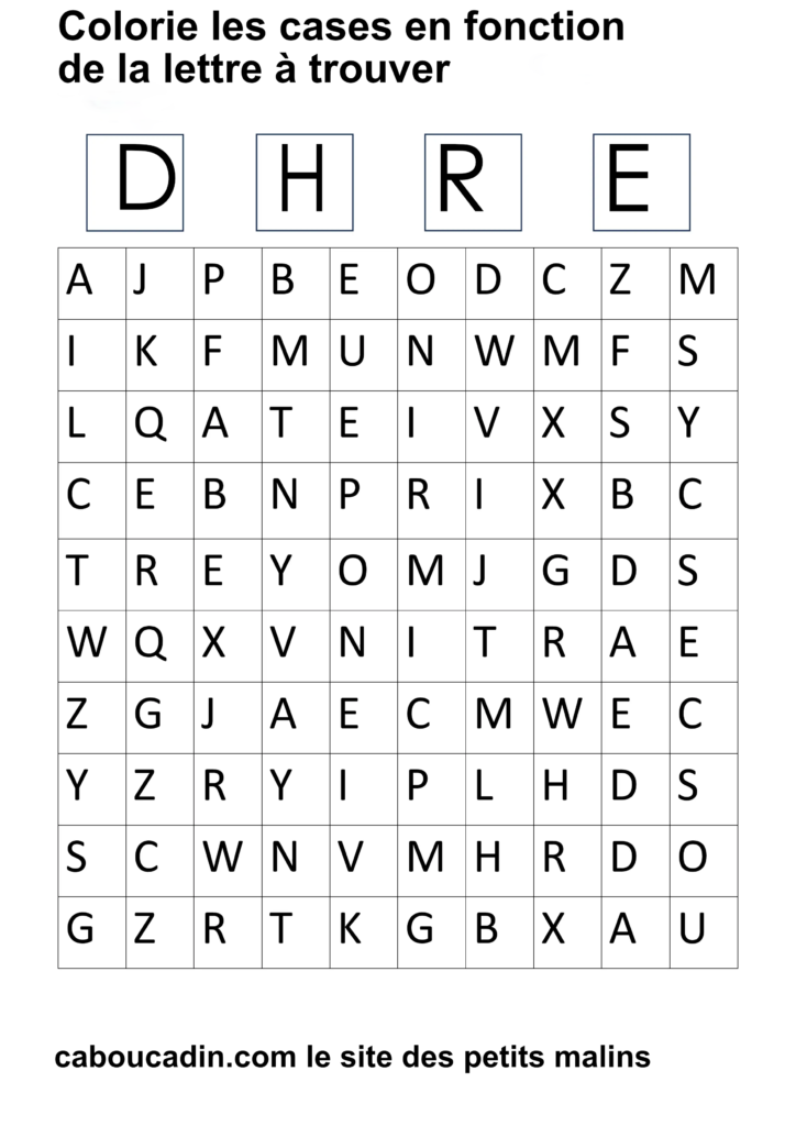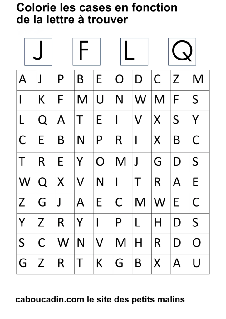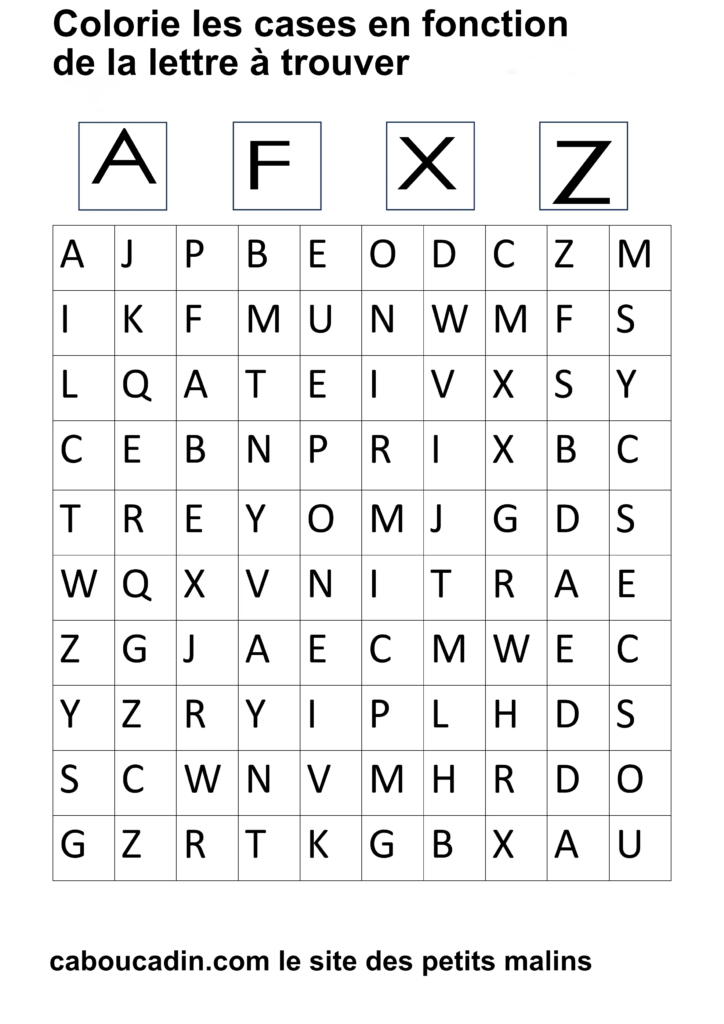 15 fiches maternelles pour reconnaitre les lettres de l’alphabet. Des fiches de français pour apprendre à reconnaitre les différentes lettres de l’alphabet. Le principe de la fiche est simple : il y a un tableau avec 100 cases, dans chaque case il y a une lettre de l’alphabet. En haut de la fiche, il y a 4 grandes cases avec chacune une lettre à l’intérieur. Cherche et trouve les lettres qui correspondent et colorie la case de la couleur que tu veux. Ces fiches maternelles sont gratuites et réalisées par moi même.