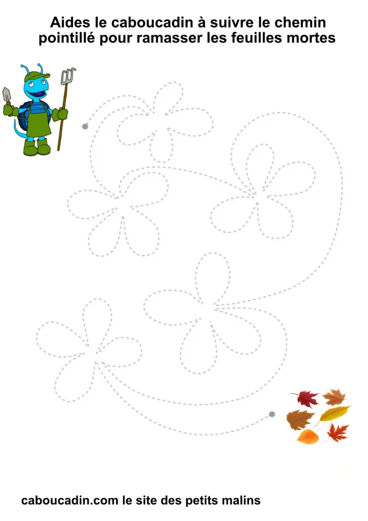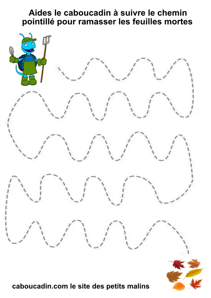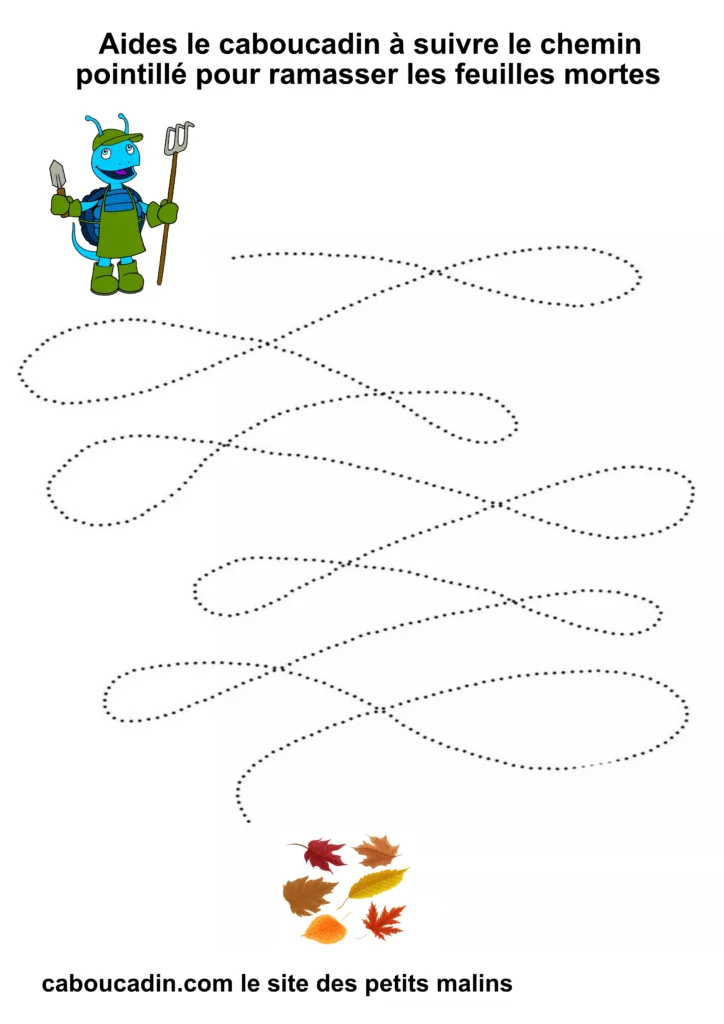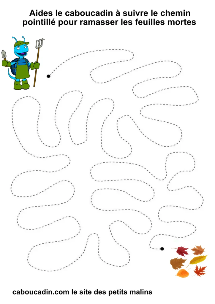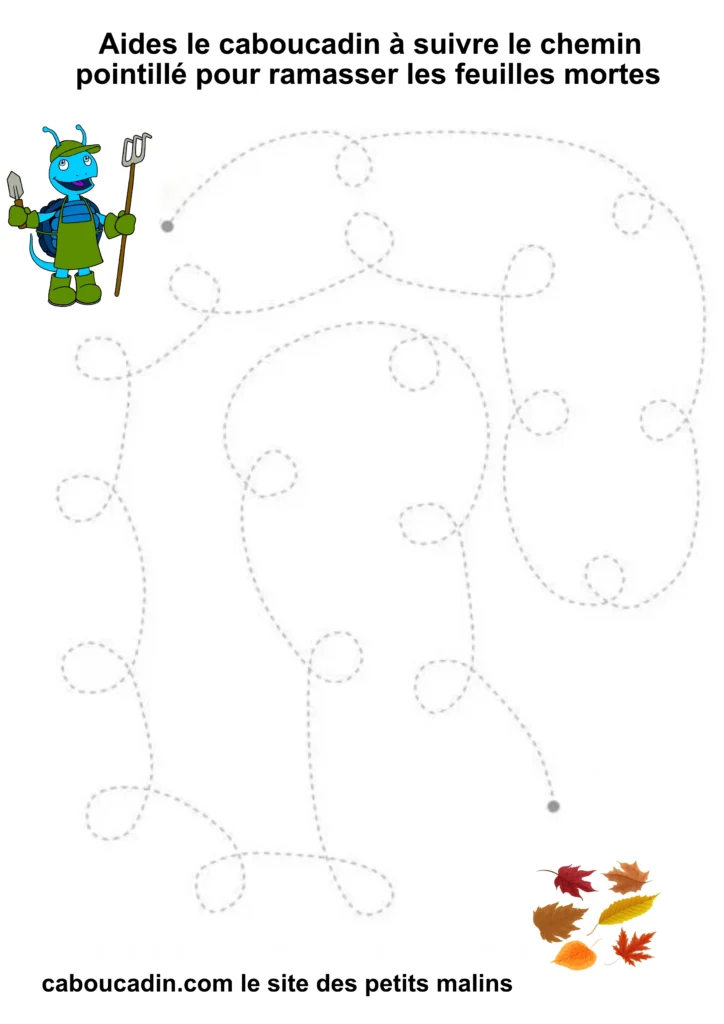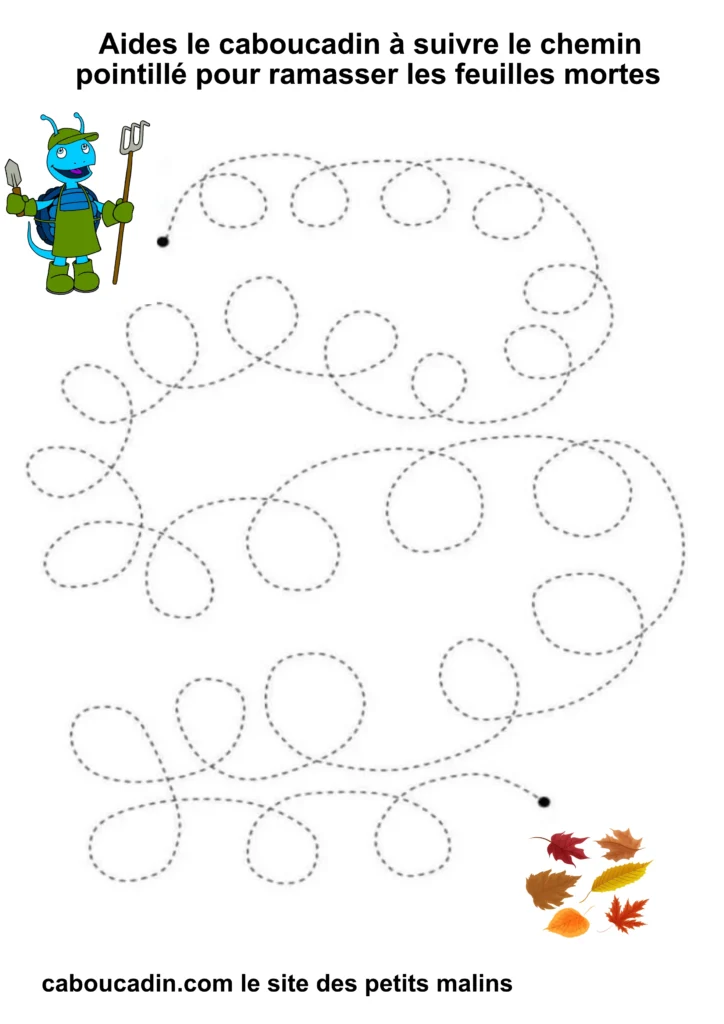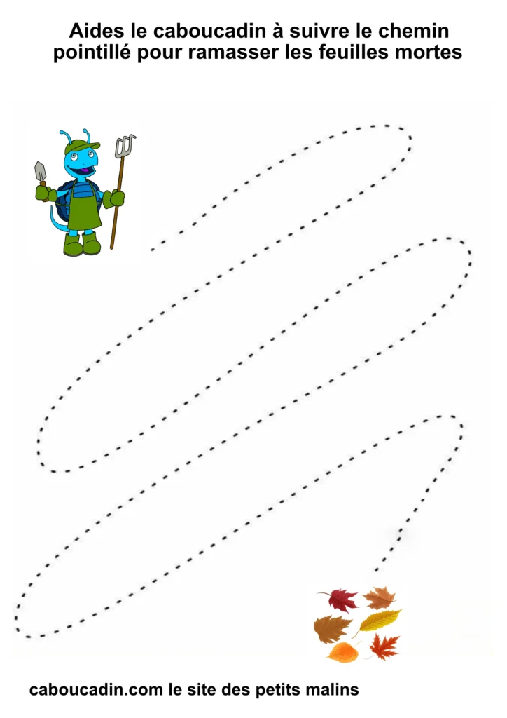 L’exercice est assez simple : il s’agit pour l’enfant de tracer un trait sur les pointillés qui forment un sentier sinueux. À la fin du parcours, le caboucadin pourra ramasser les feuilles mortes.
