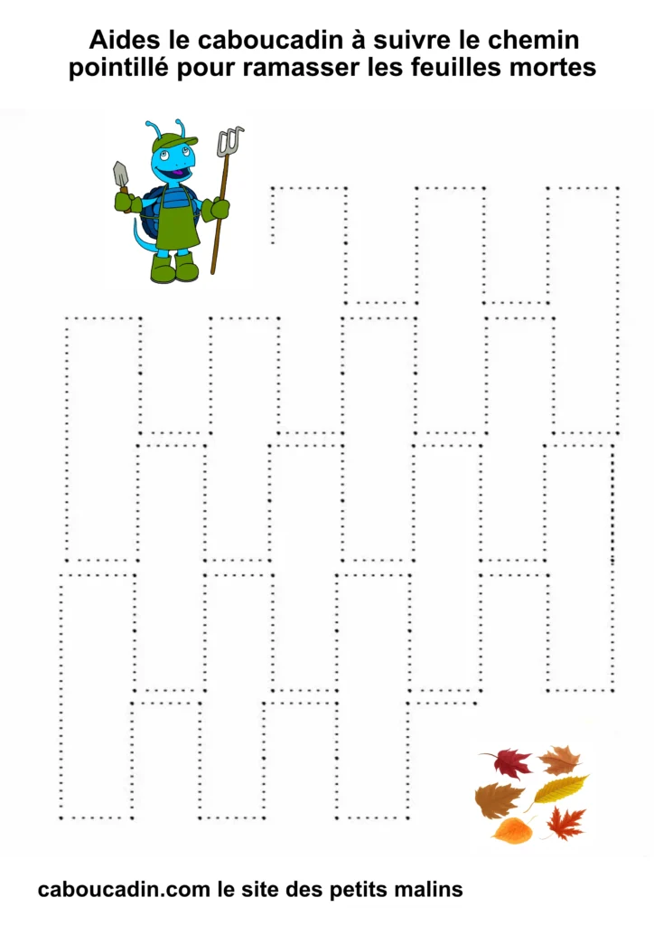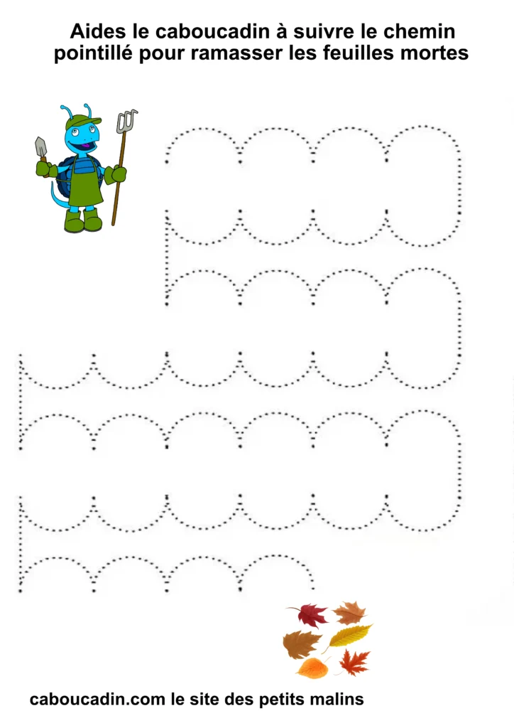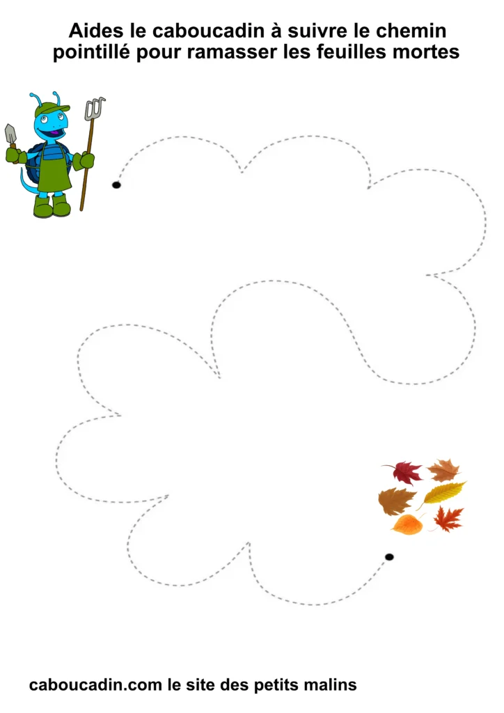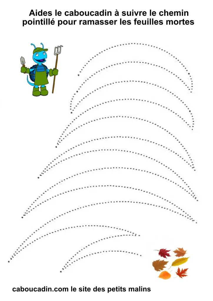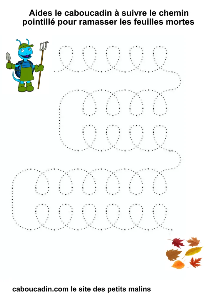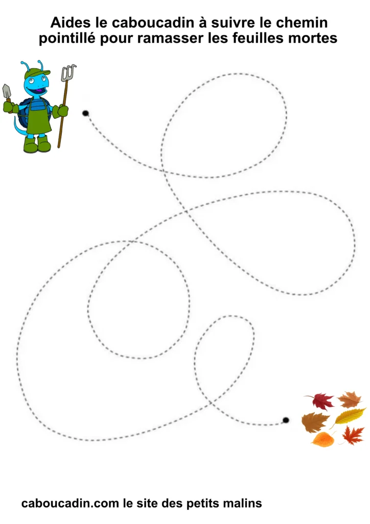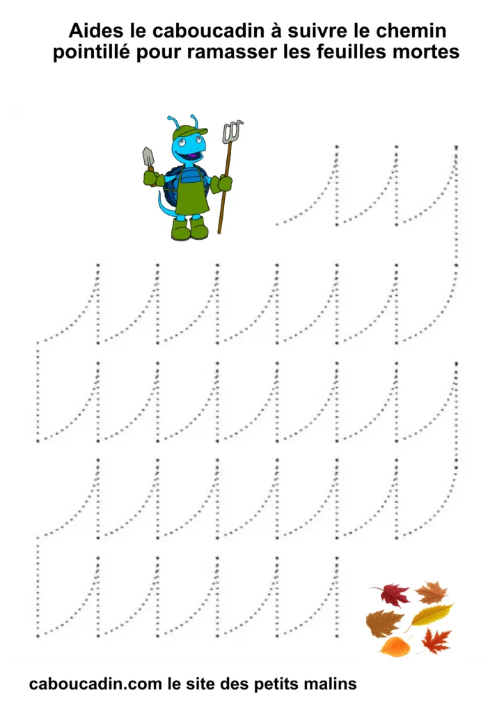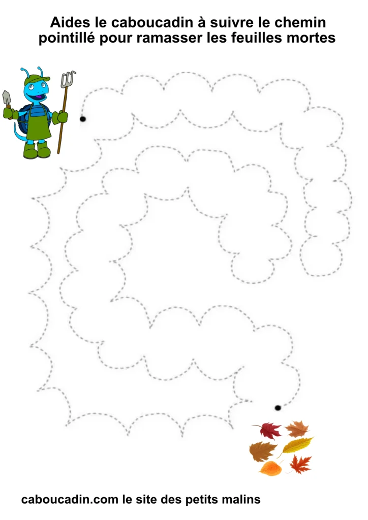 L’exercice est assez simple : il s’agit pour l’enfant de tracer un trait sur les pointillés qui forment un sentier sinueux. À la fin du parcours, le caboucadin pourra ramasser les feuilles mortes.