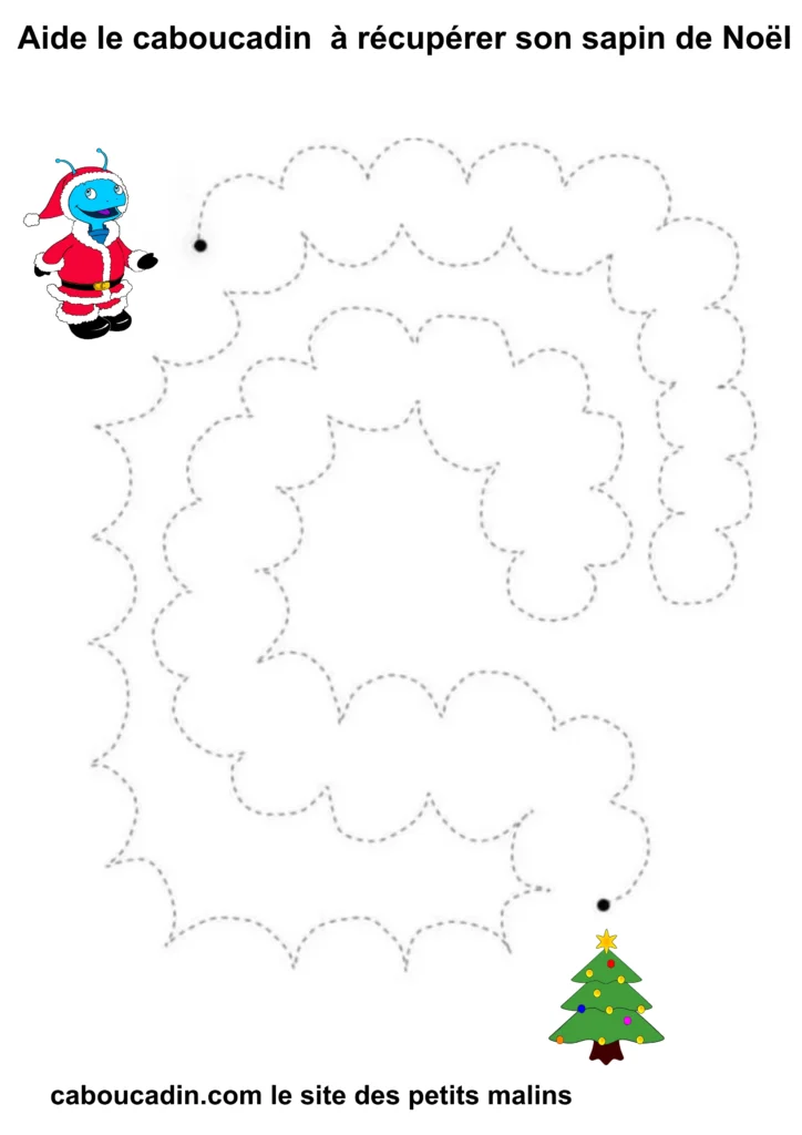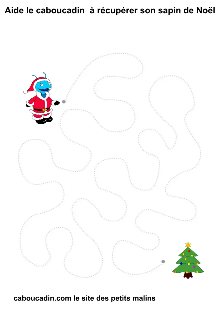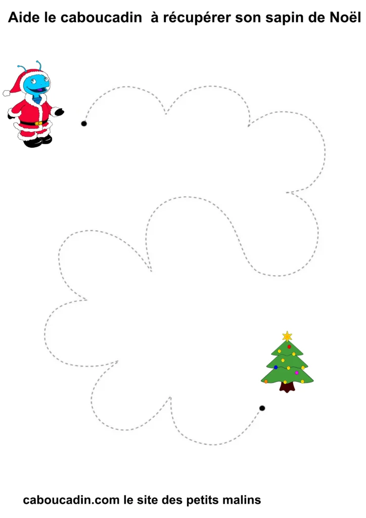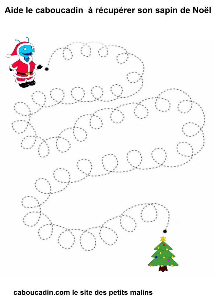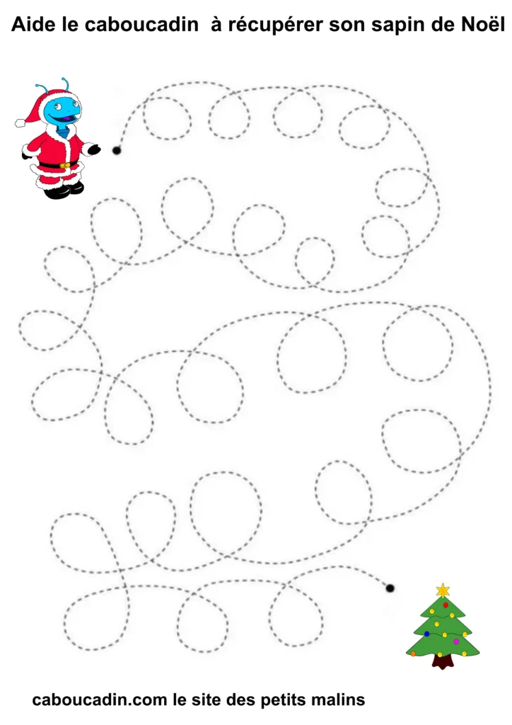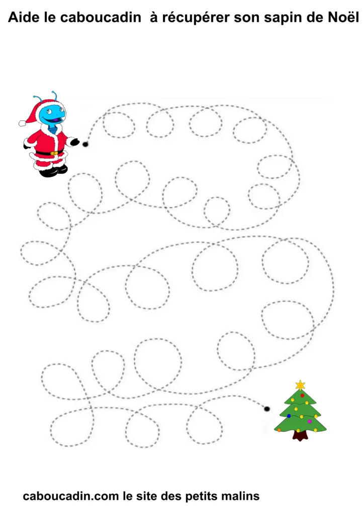 Les enfants prennent un crayon de couleur et suivent le tracé du chemin pour aider Caboucadin à atteindre son sapin de Noël. Ce petit jeu leur permet de développer leur coordination œil-main, de travailler leur motricité fine et de s’entraîner à rester concentré, tout ça en s’amusant avec un thème festif.