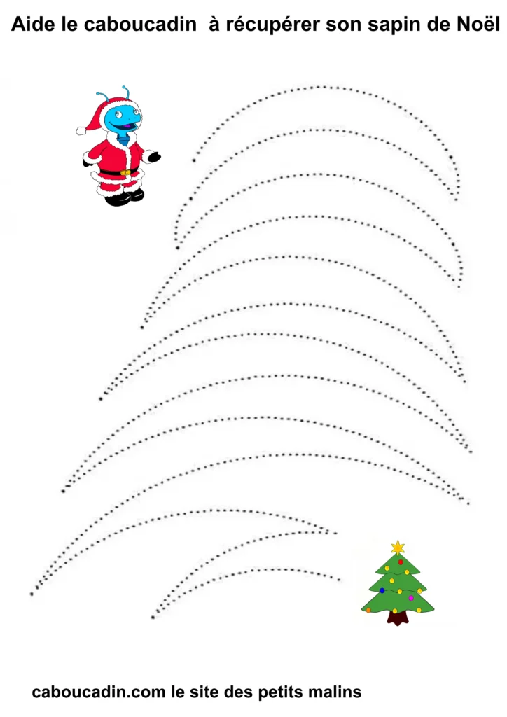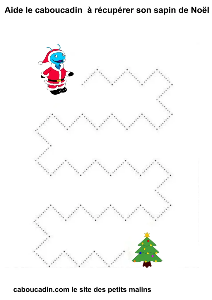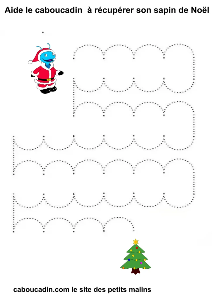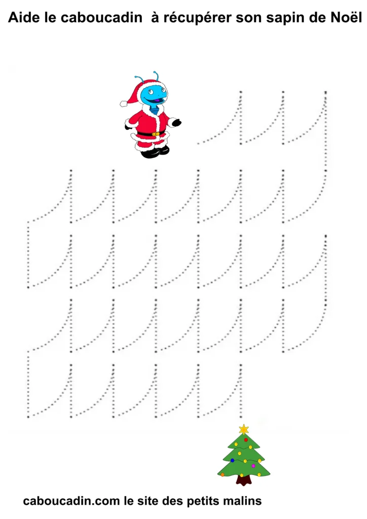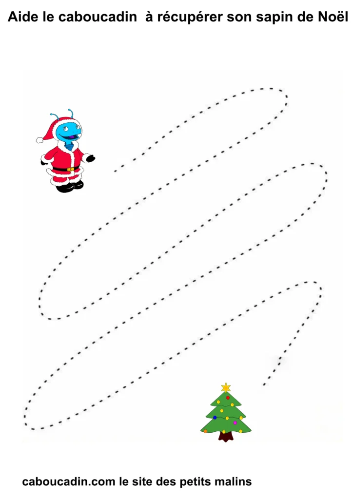 Voici une fiche de graphisme spécial Noël (20 fiches graphisme maternelles de Noël), parfaite pour les petits ! Sur la page, tu trouveras Caboucadin déguisé en Père Noël, placé à gauche, prêt pour une petite aventure. Son objectif ? Rejoignez un joli sapin de Noël tout décoré, qui se trouve en bas de la fiche.