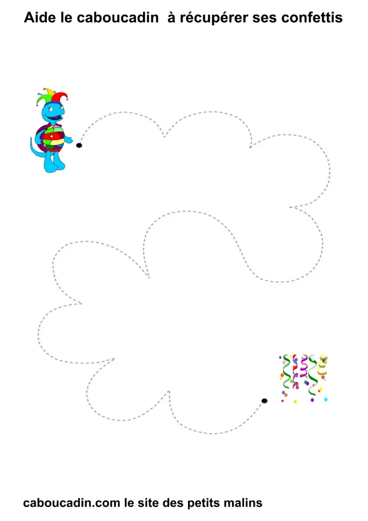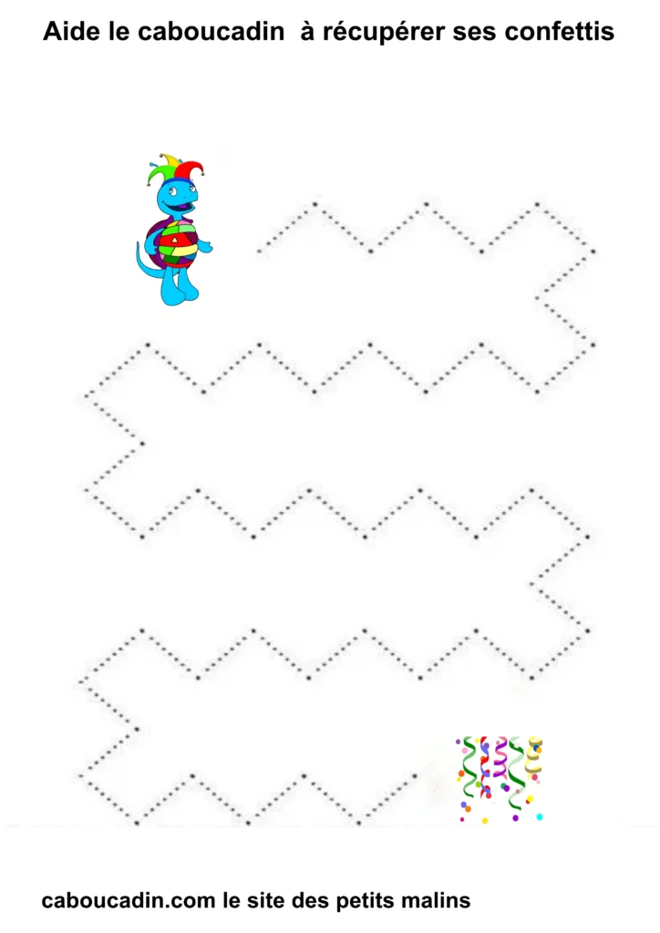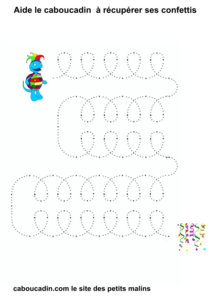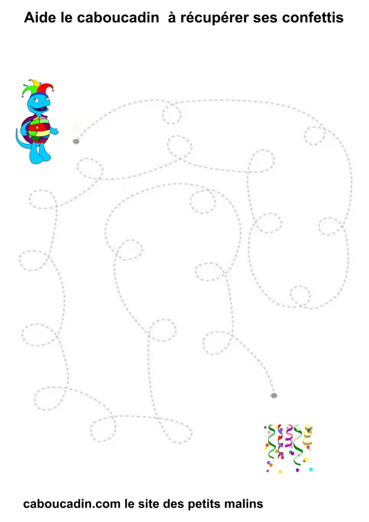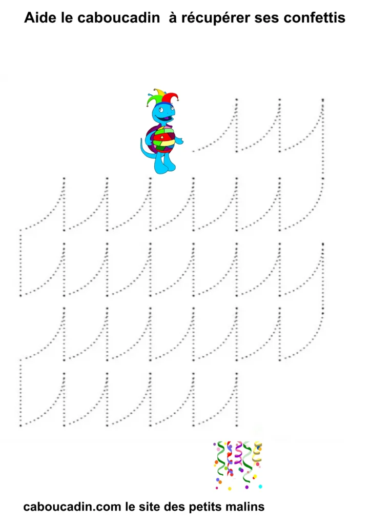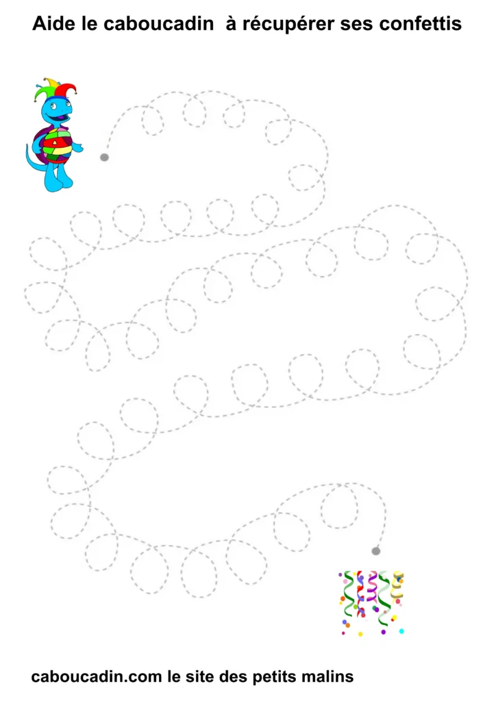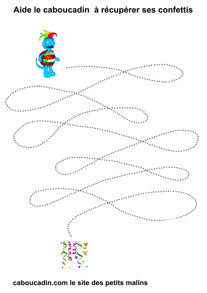 Cette fiche de graphisme sur le thème du carnaval est idéale pour les petits apprentis du crayon ! À gauche, il y a Caboucadin, un mignon personnage du site caboucadin.com, tout habillé en arlequin. Caboucadin un mais simple : atteindre le tas de confettis au bas de la page ! Mais il a besoin d’un coup de main pour y arriver.