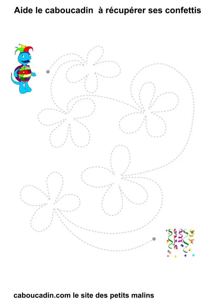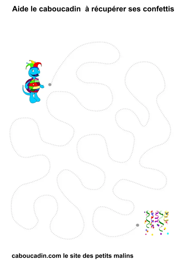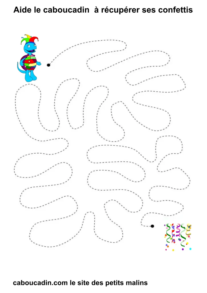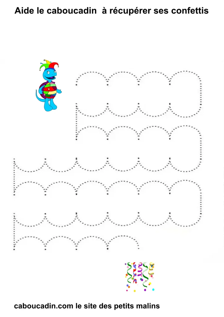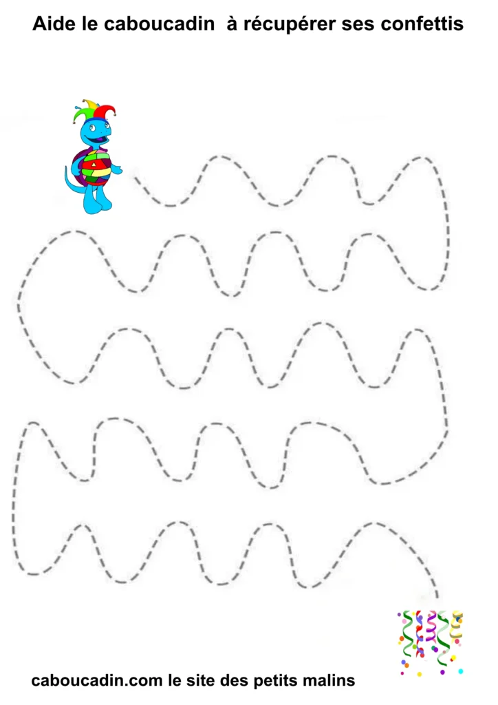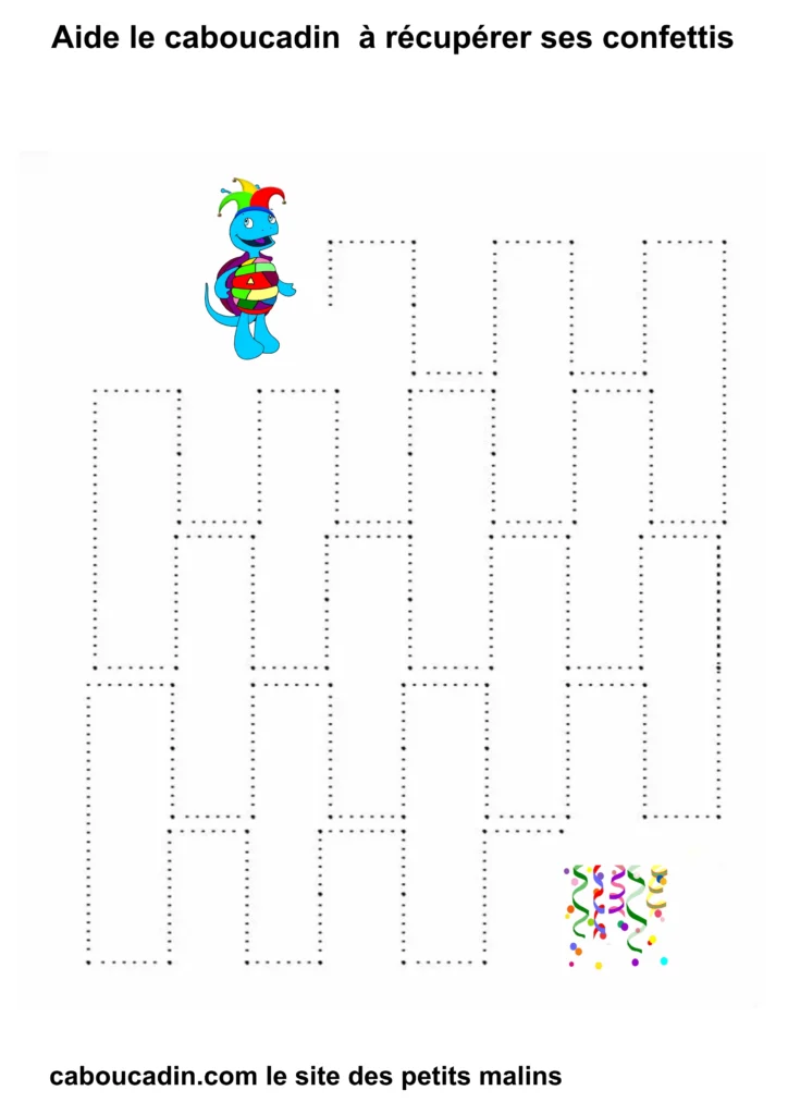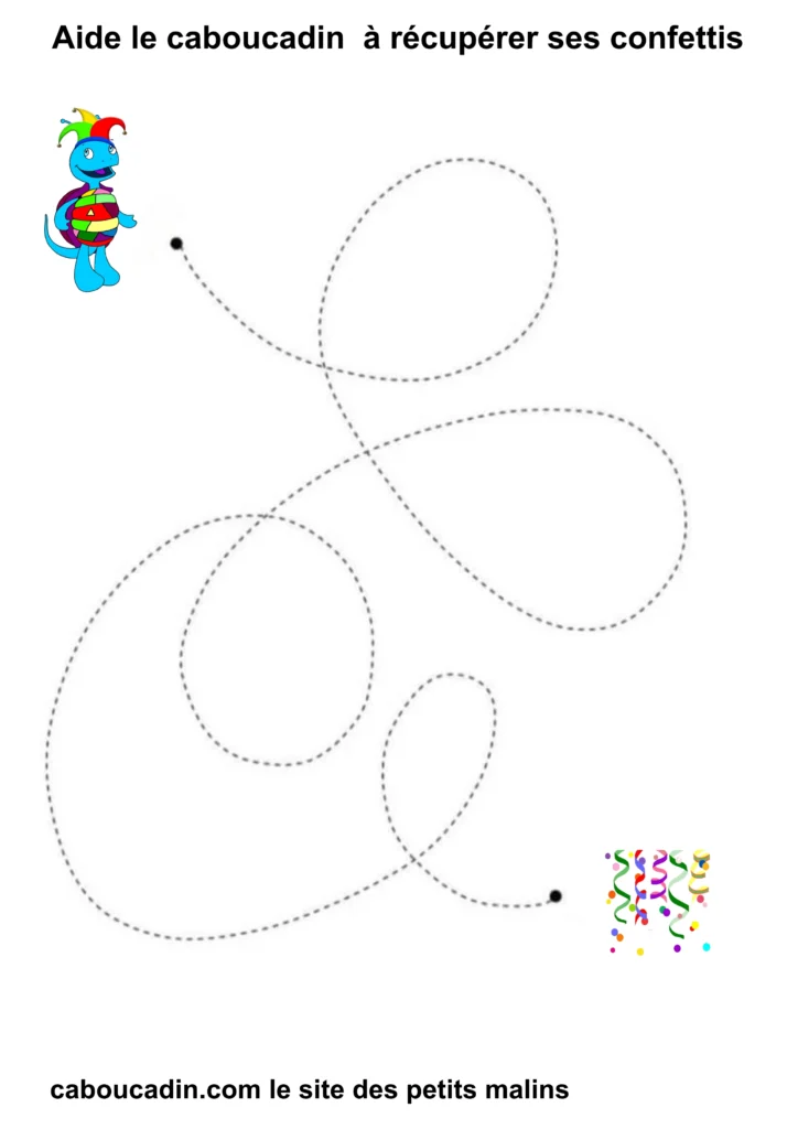 Cette fiche de graphisme sur le thème du carnaval est idéale pour les petits apprentis du crayon ! À gauche, il y a Caboucadin, un mignon personnage du site caboucadin.com, tout habillé en arlequin. Caboucadin un mais simple : atteindre le tas de confettis au bas de la page ! Mais il a besoin d’un coup de main pour y arriver.