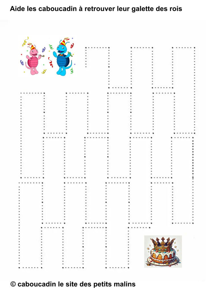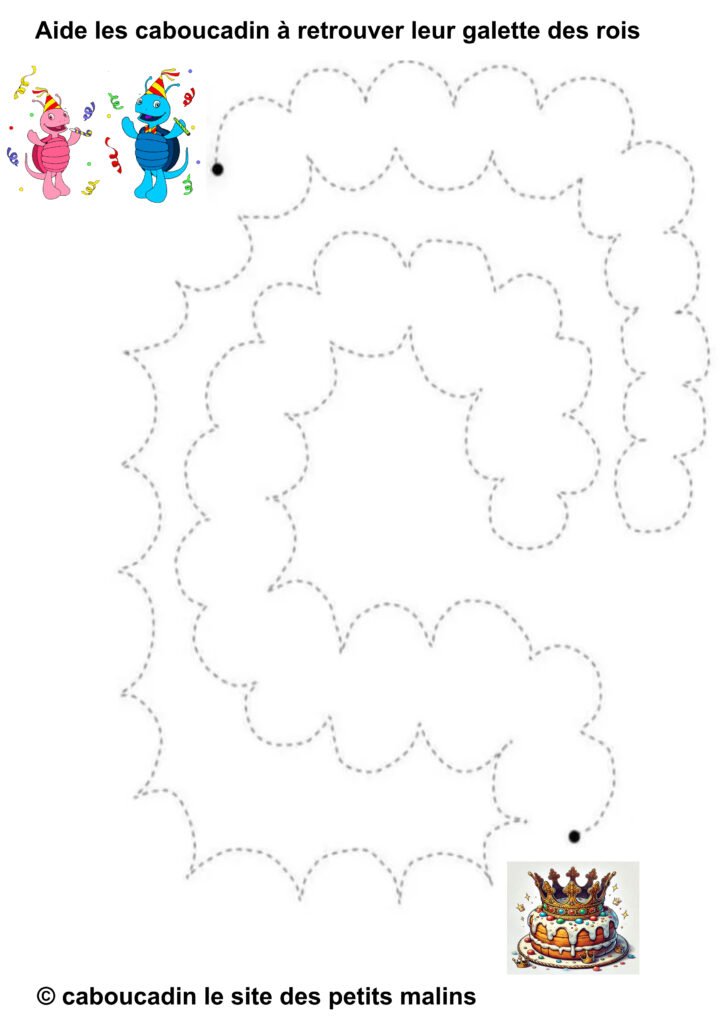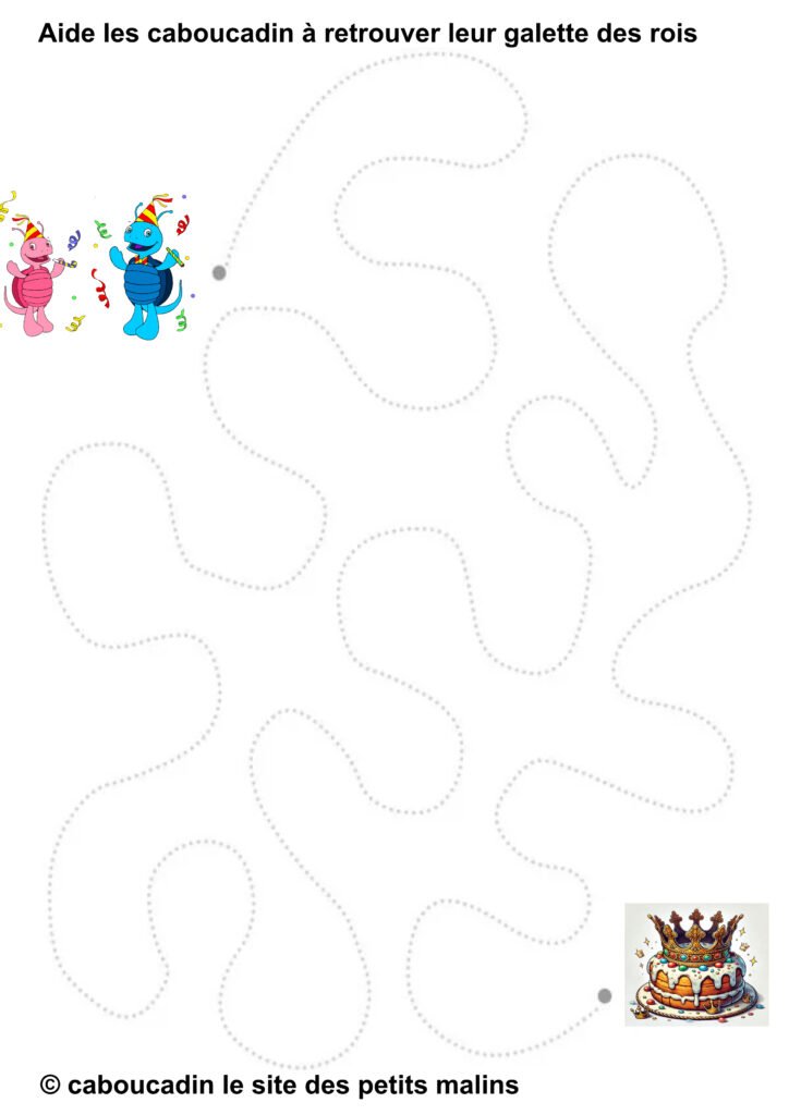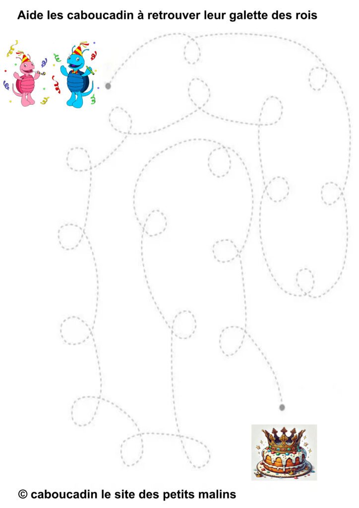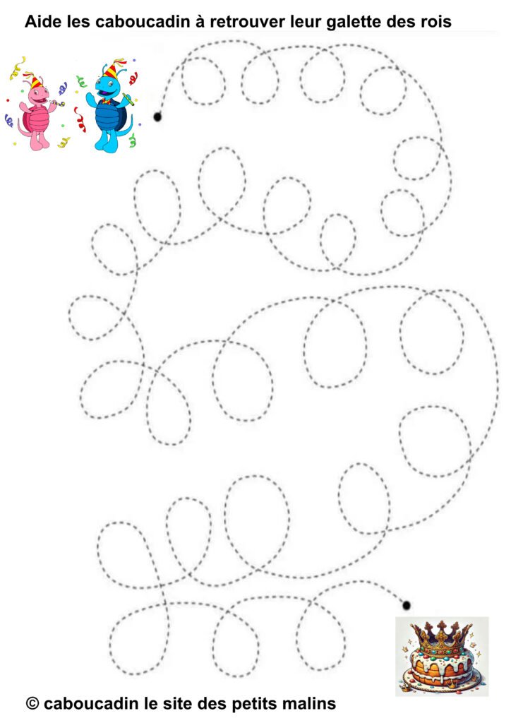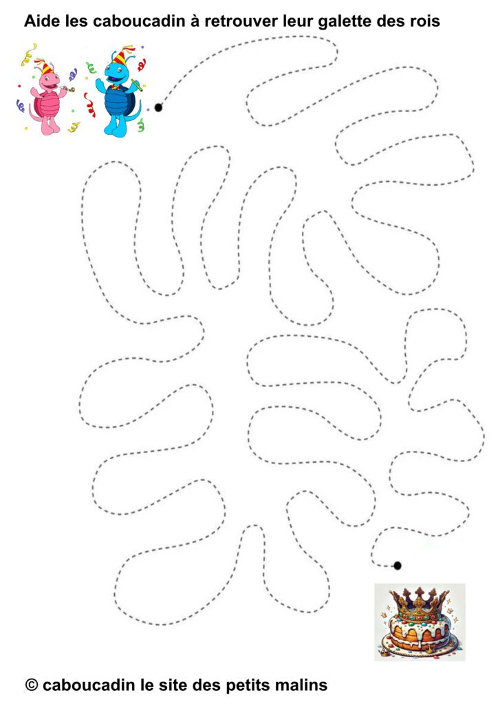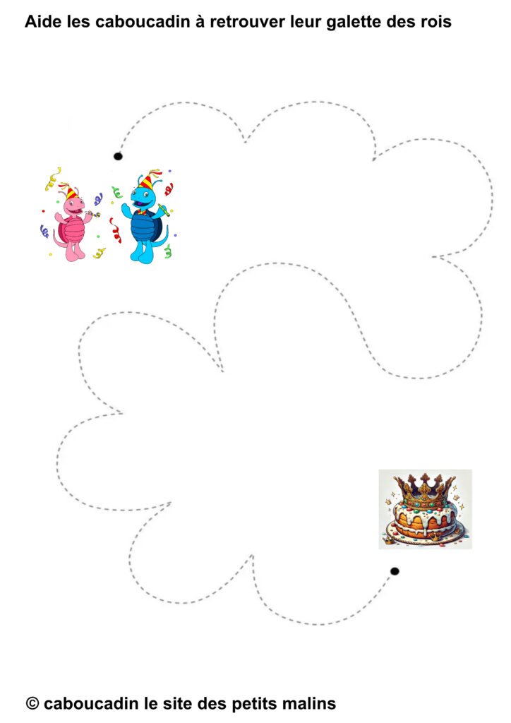 L’un rose : la fille, l’autre bleu : le garçon – semblent bien intrigués. Leur mission ? Remettre la main sur la galette des Rois qui les attend en bas à droite du dessin. Pour les aider, il suffit de suivre les pointillés avec un crayon et de tracer le bon chemin jusqu’à la galette.