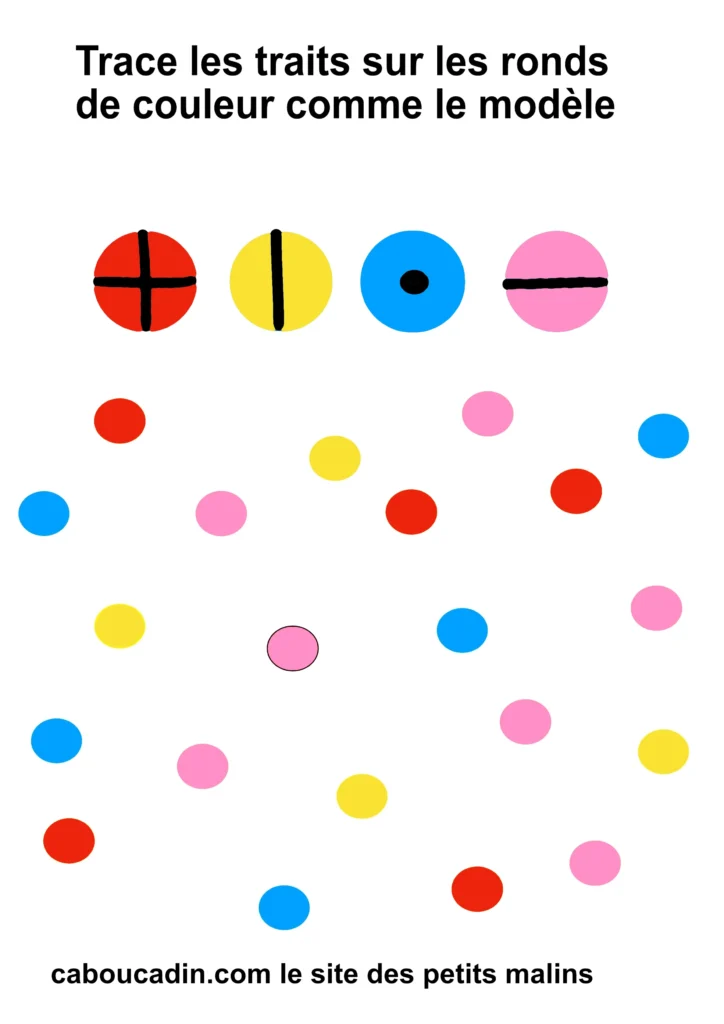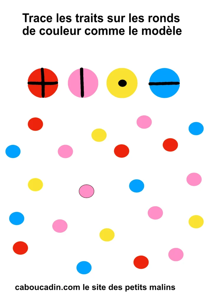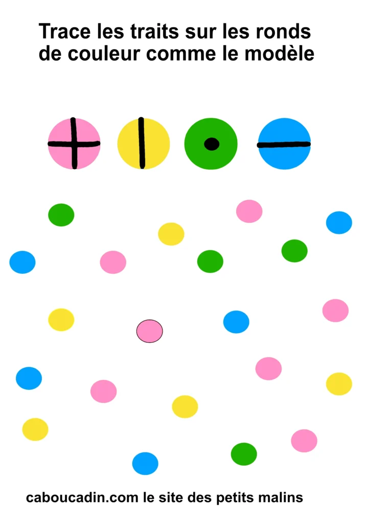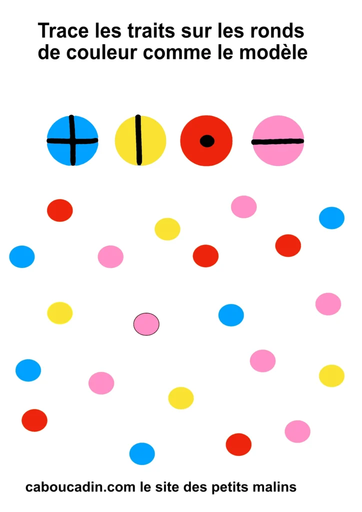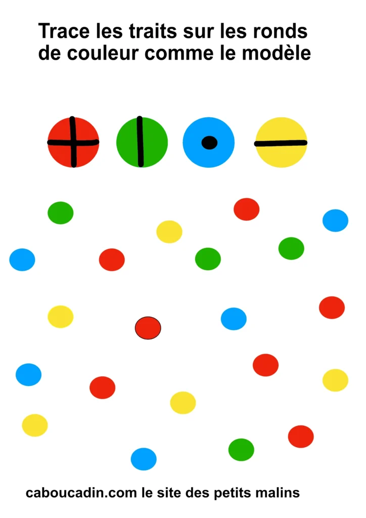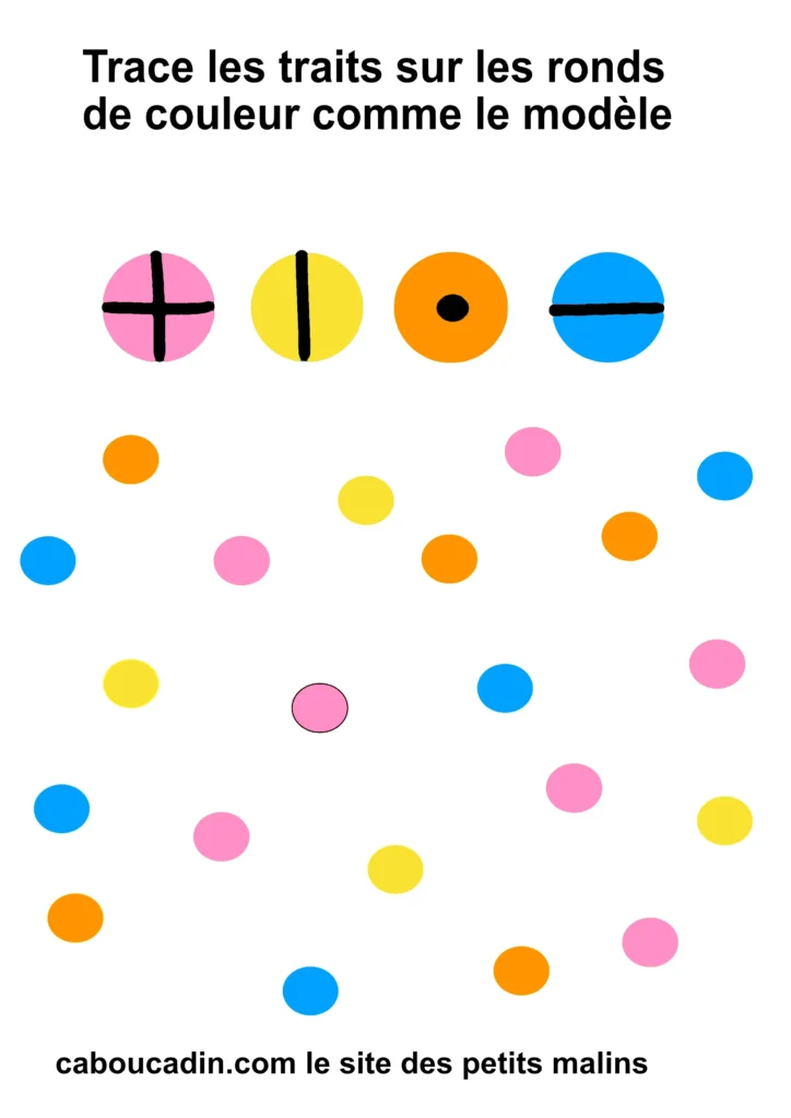 20 fiches maternelles : Apprendre les couleurs. Des fiches maternelles pour apprendre les différentes couleurs en s’amusant. En haut de la fiche, il y a 4 cercles de couleurs différentes avec dans chaque cercle soit une croix, soit un trait vertical , soit un trait horizontal ou un point à l’intérieur. Le but de la fiche est de reconnaitre les différentes couleurs de pastilles qui se trouvent en dessous des modèles et d’écrire dessus une croix, un trait ou un point comme sur le modèle de la même couleur.