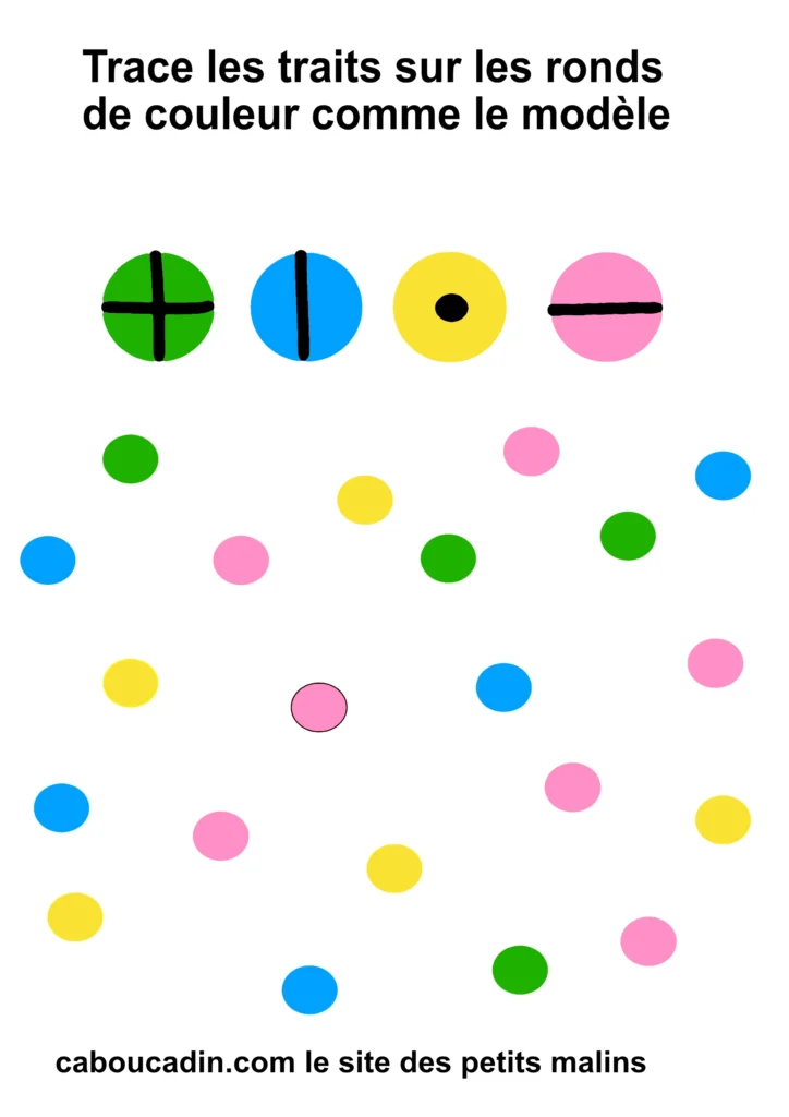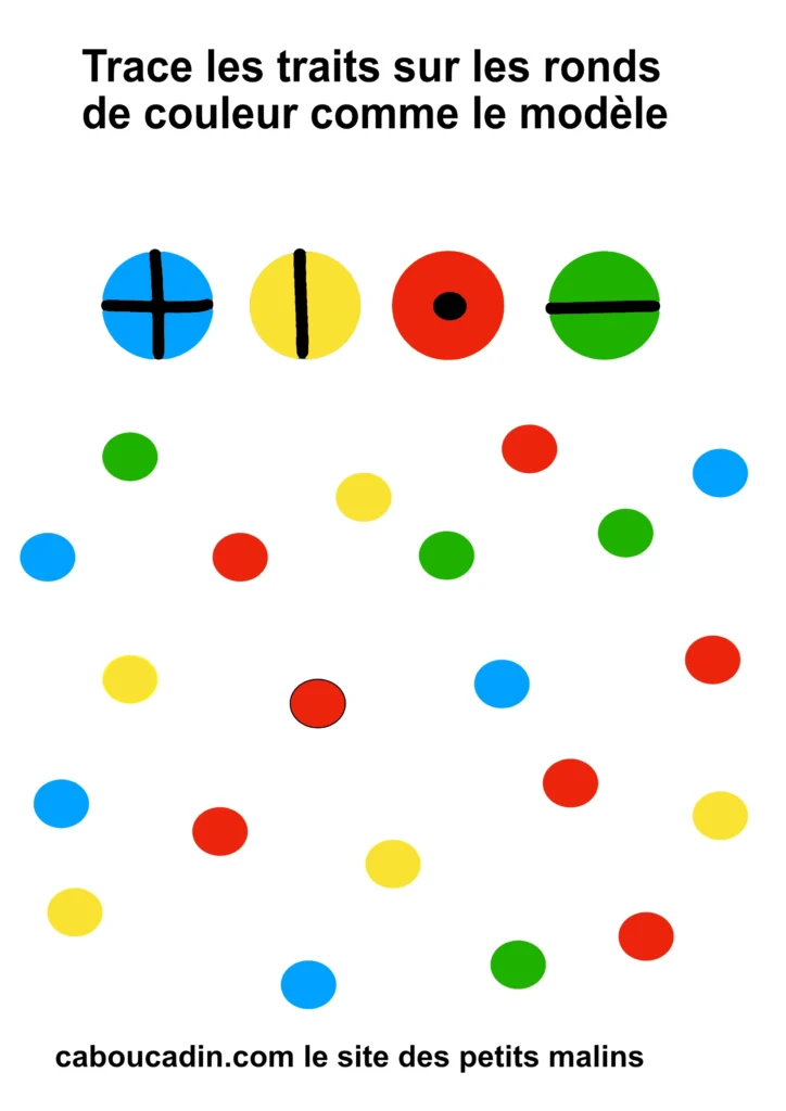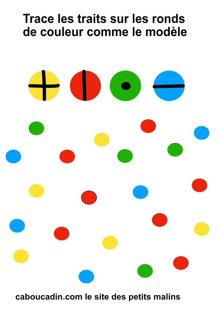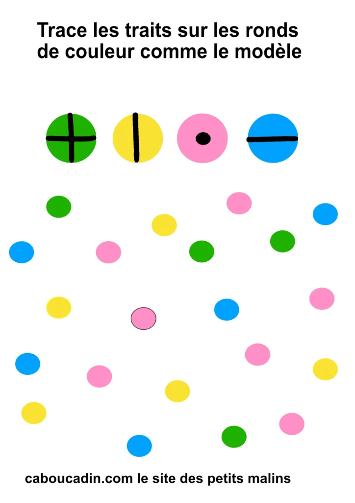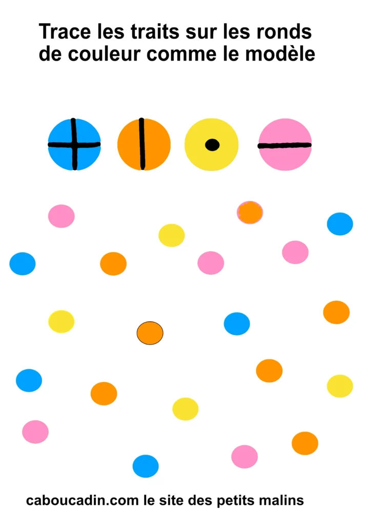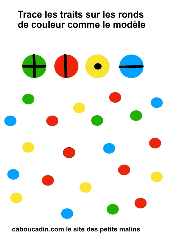 20 fiches maternelles : Apprendre les couleurs. Des fiches maternelles pour apprendre les différentes couleurs en s’amusant. En haut de la fiche, il y a 4 cercles de couleurs différentes avec dans chaque cercle soit une croix, soit un trait vertical , soit un trait horizontal ou un point à l’intérieur. Le but de la fiche est de reconnaitre les différentes couleurs de pastilles qui se trouvent en dessous des modèles et d’écrire dessus une croix, un trait ou un point comme sur le modèle de la même couleur.