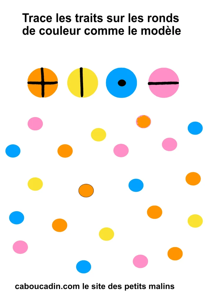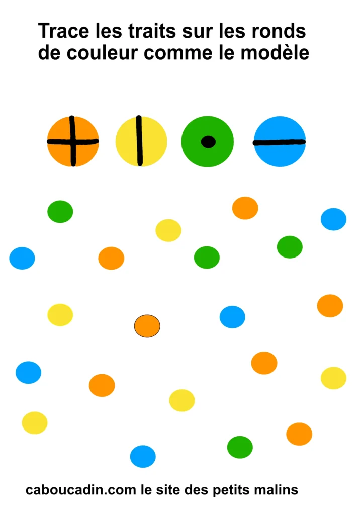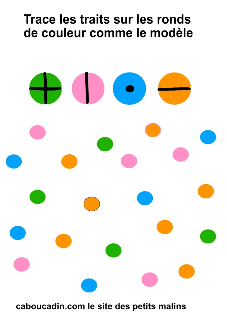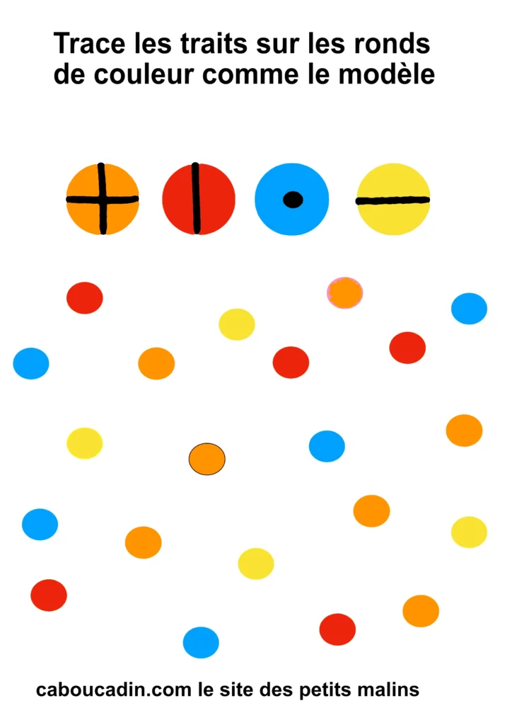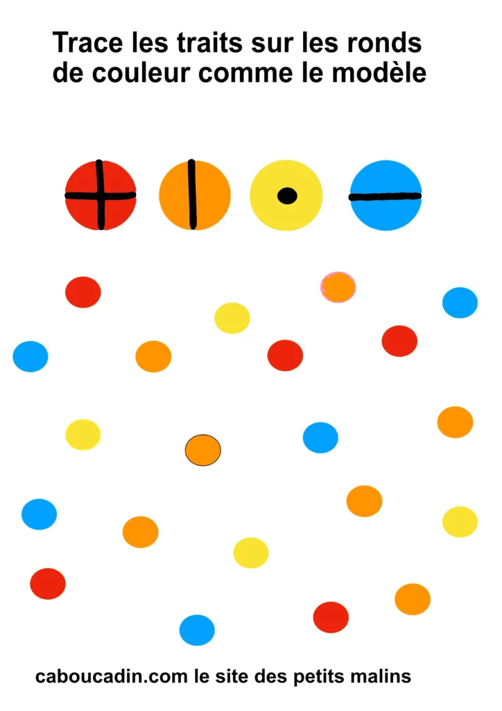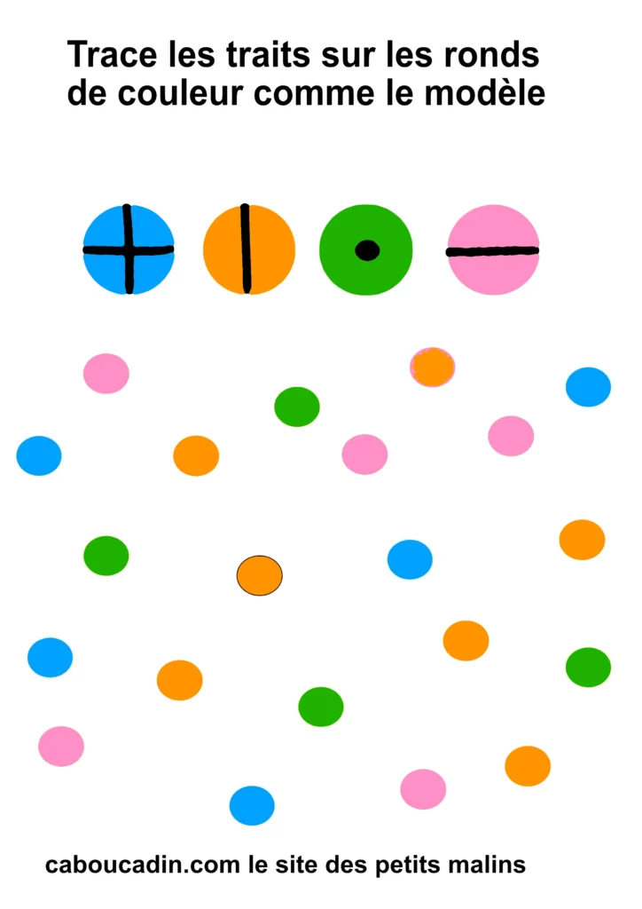 20 fiches maternelles : Apprendre les couleurs. Des fiches maternelles pour apprendre les différentes couleurs en s’amusant. En haut de la fiche, il y a 4 cercles de couleurs différentes avec dans chaque cercle soit une croix, soit un trait vertical , soit un trait horizontal ou un point à l’intérieur. Le but de la fiche est de reconnaitre les différentes couleurs de pastilles qui se trouvent en dessous des modèles et d’écrire dessus une croix, un trait ou un point comme sur le modèle de la même couleur.