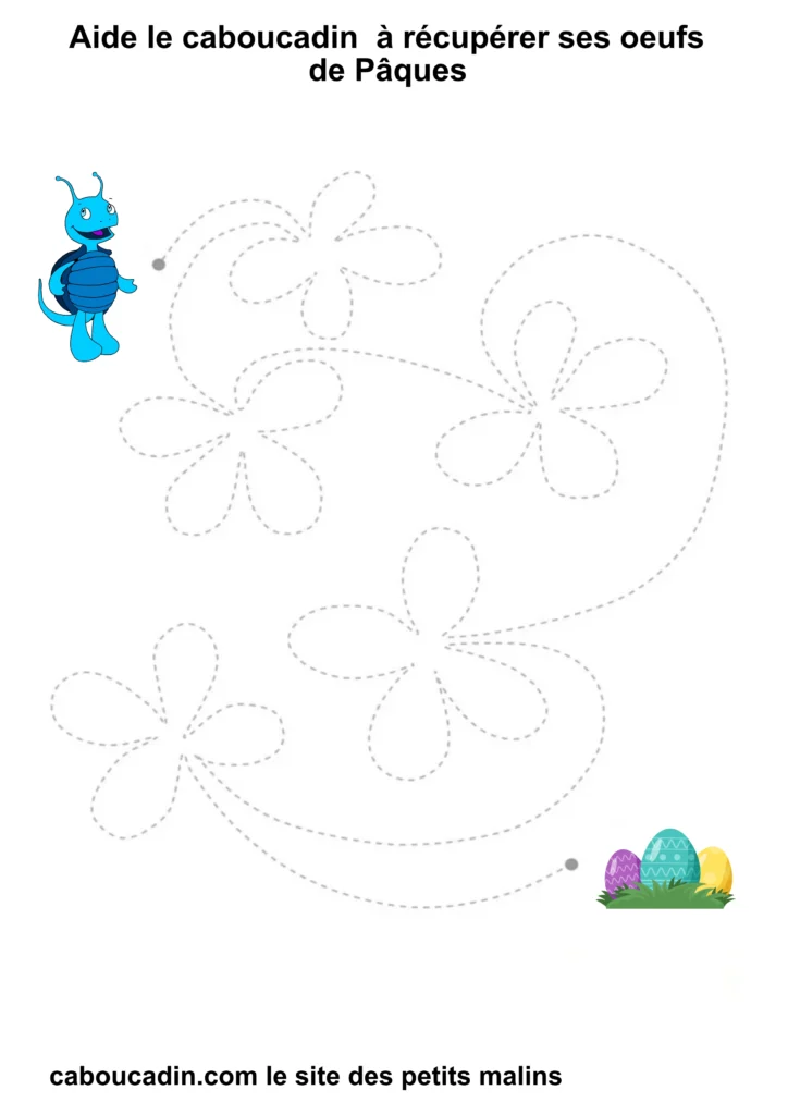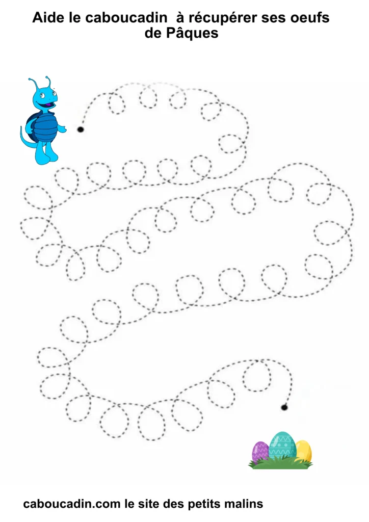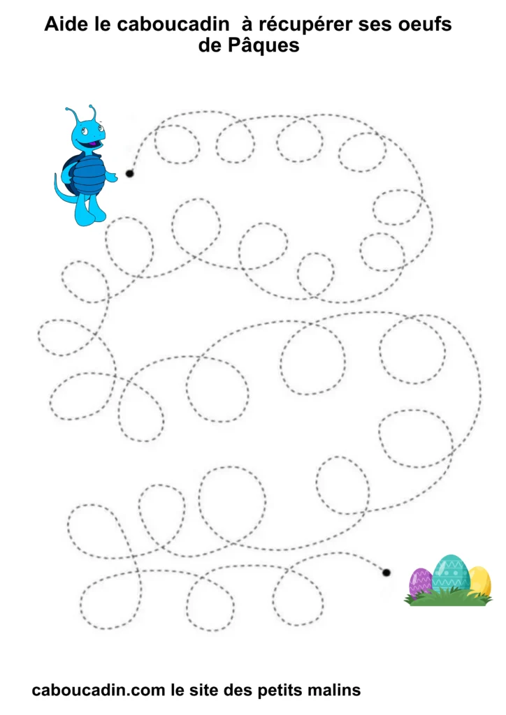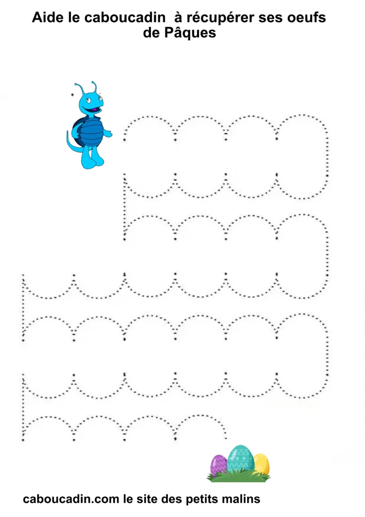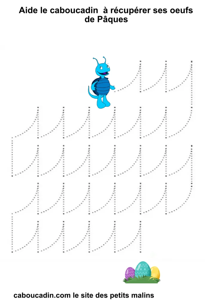 En suivant les lignes avec ton crayon, tu vas aider Caboucadin à retrouver ses œufs. C’est comme si tu étais un super-héros qui donne des pouvoirs à tes doigts pour écrire de belles lettres !