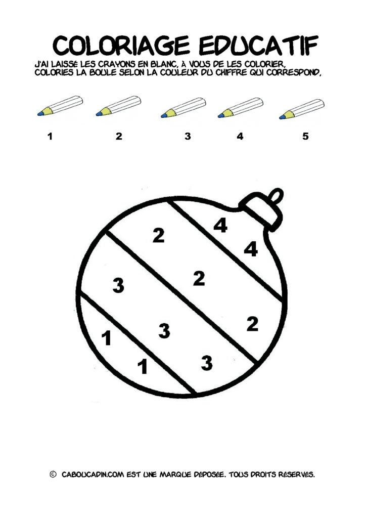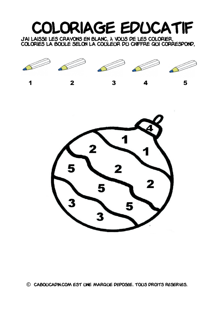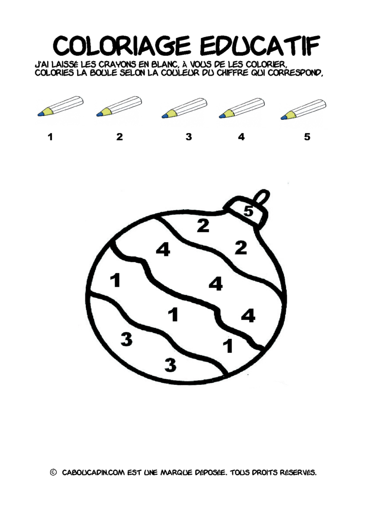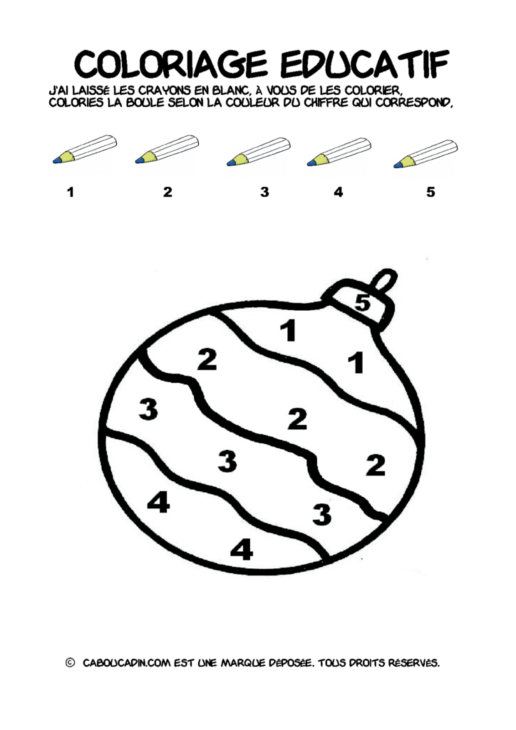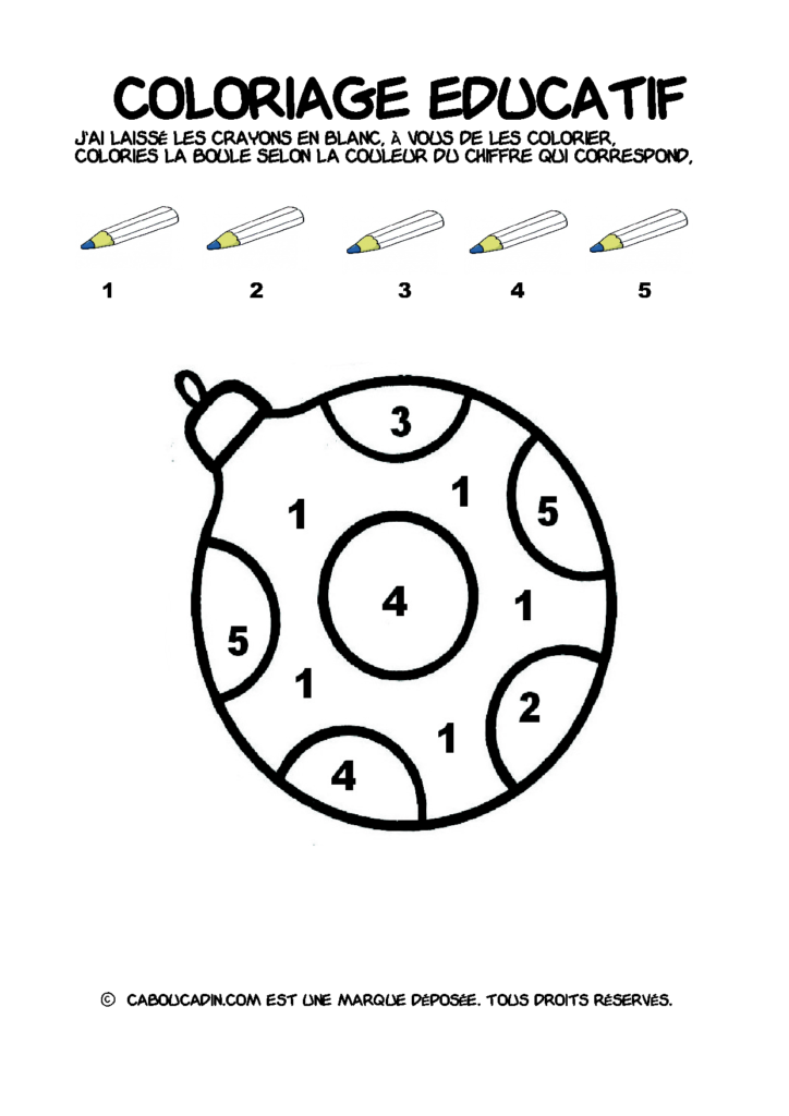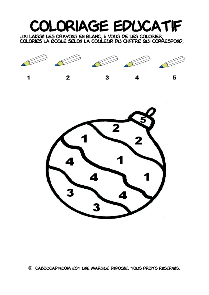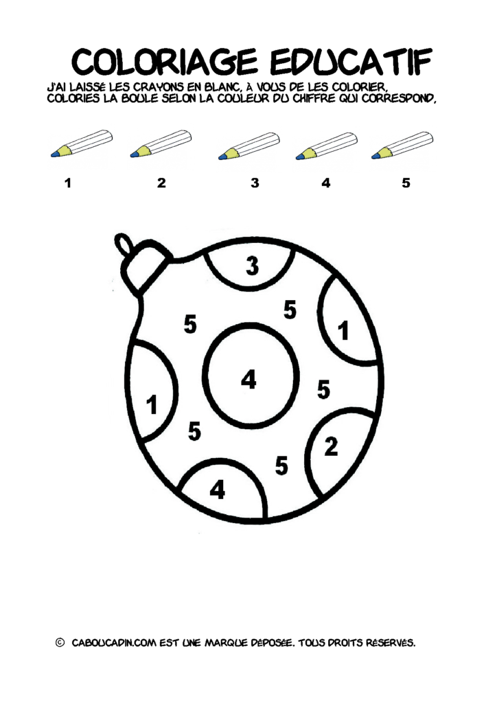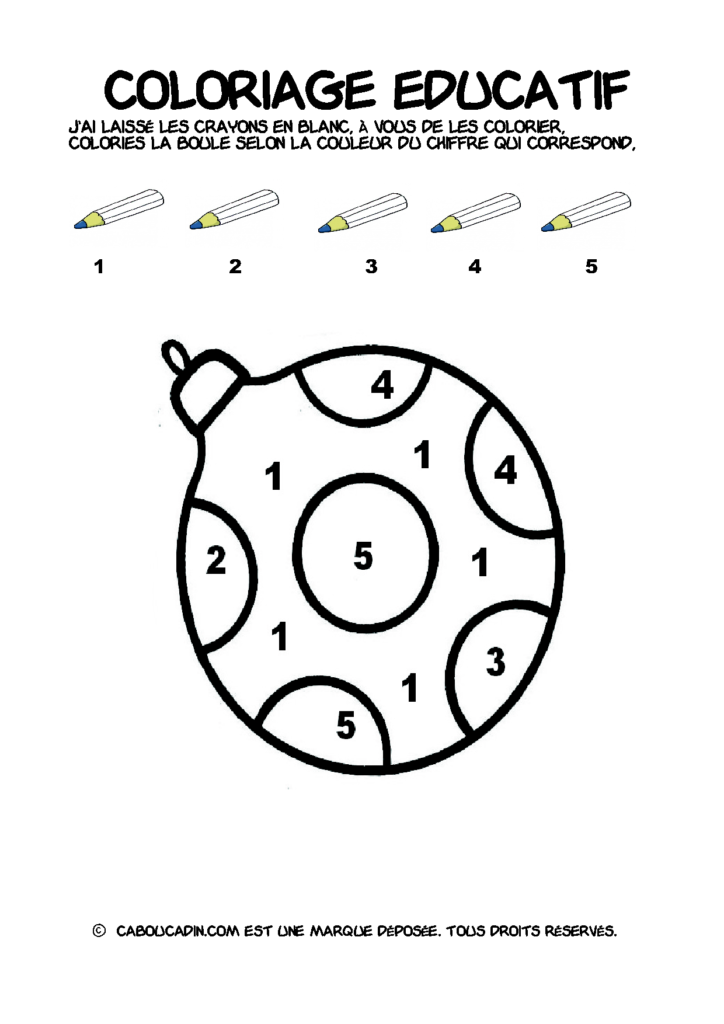30 fiches maternelles Noël : Coloriages éducatif. Des coloriages éducatifs mathématiques à télécharger et à imprimer gratuitement. Le principe de la fiche est très simple, en haut de la fiche, il y a 5 crayons de couleurs avec en dessous un chiffre. Dans les boules de Noël, il y a des chiffres De 1 à 5. Chaque chiffre correspond à une couleur, à toi de les trouver et de colorier la boule de Noël de la bonne couleur.