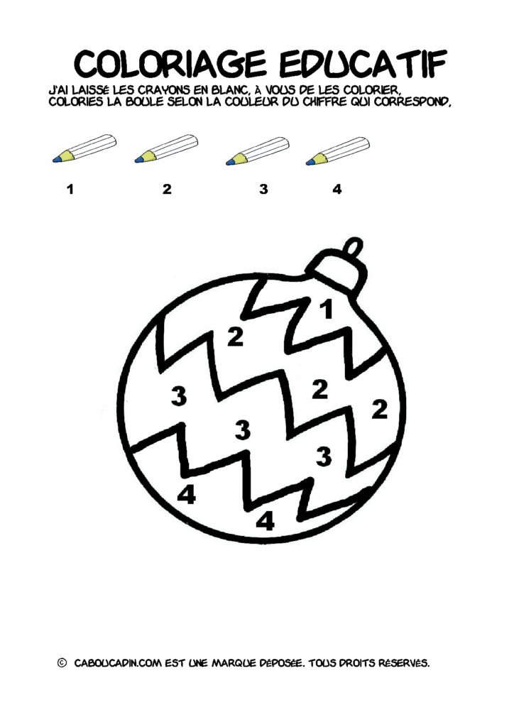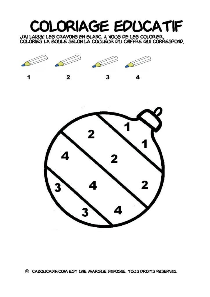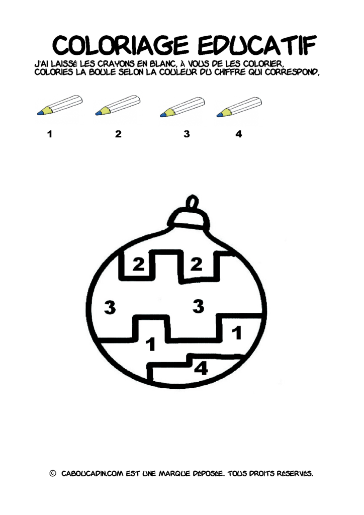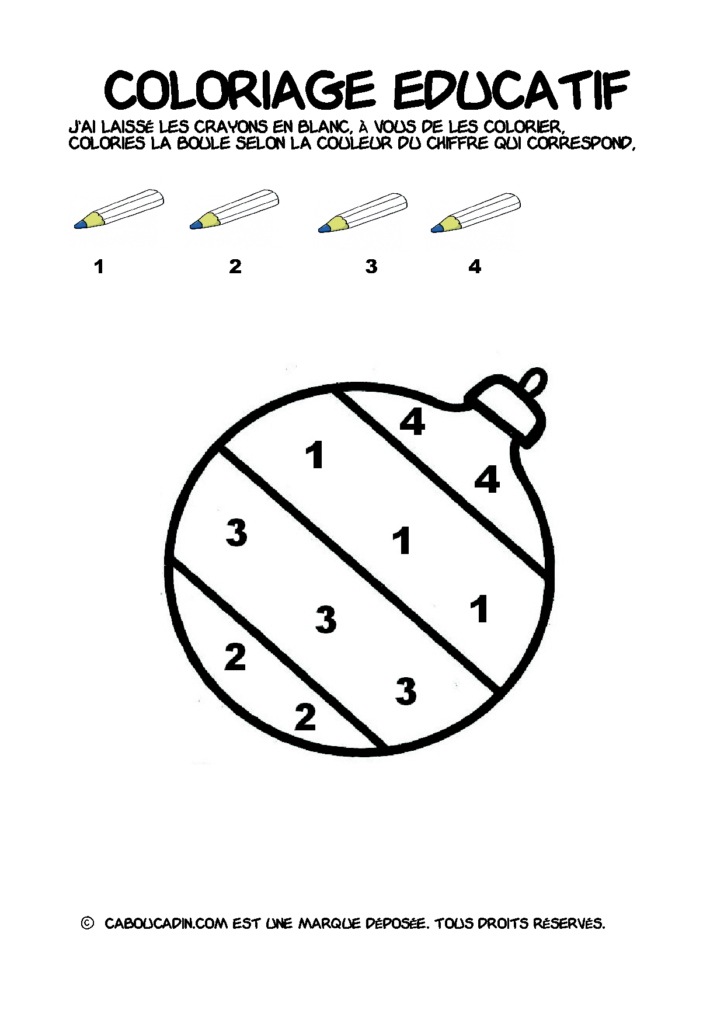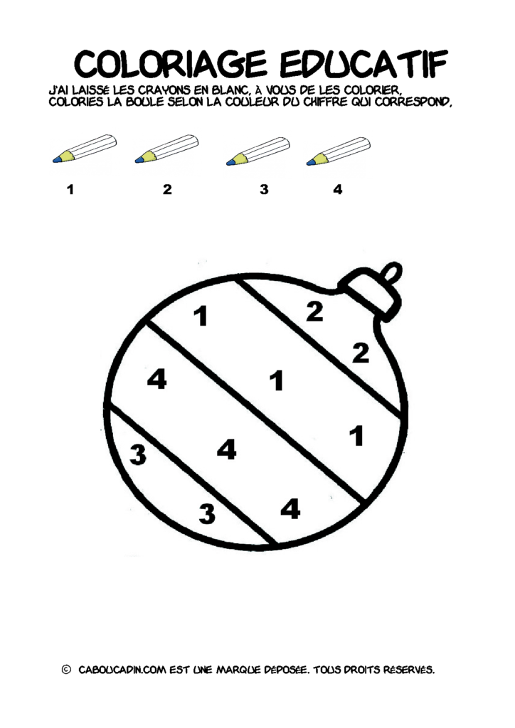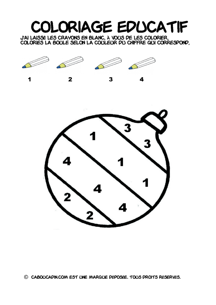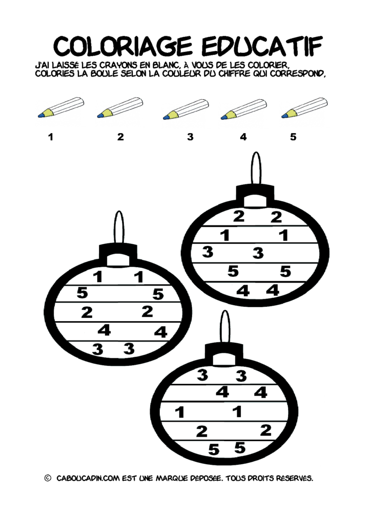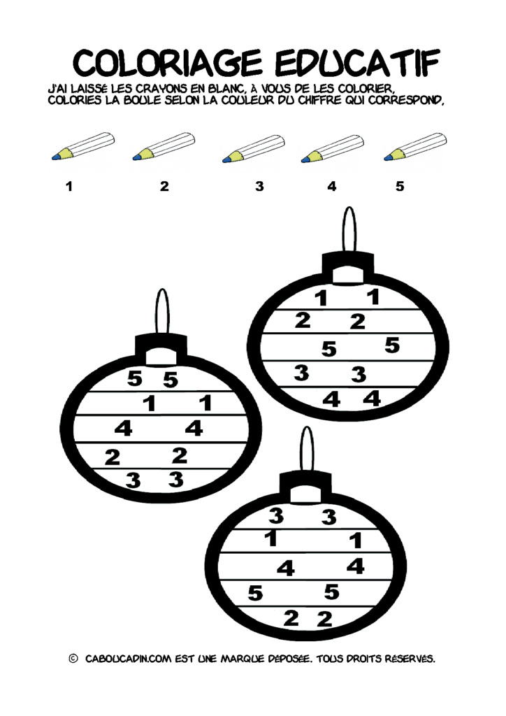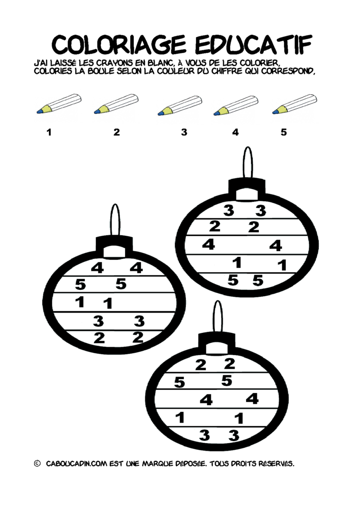 30 fiches maternelles Noël : Coloriages éducatif. Des coloriages éducatifs mathématiques à télécharger et à imprimer gratuitement. Le principe de la fiche est très simple, en haut de la fiche, il y a 5 crayons de couleurs avec en dessous un chiffre. Dans les boules de Noël, il y a des chiffres De 1 à 5. Chaque chiffre correspond à une couleur, à toi de les trouver et de colorier la boule de Noël de la bonne couleur.