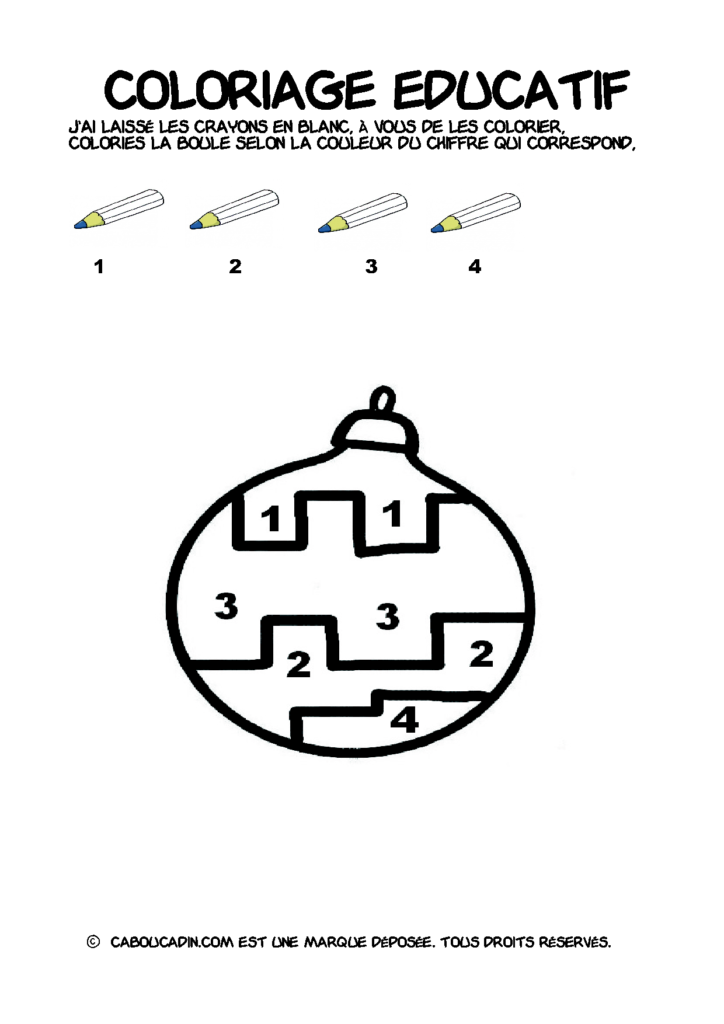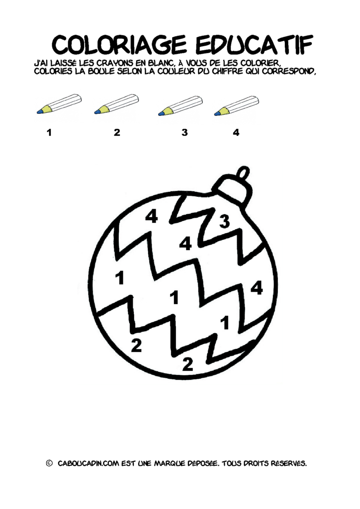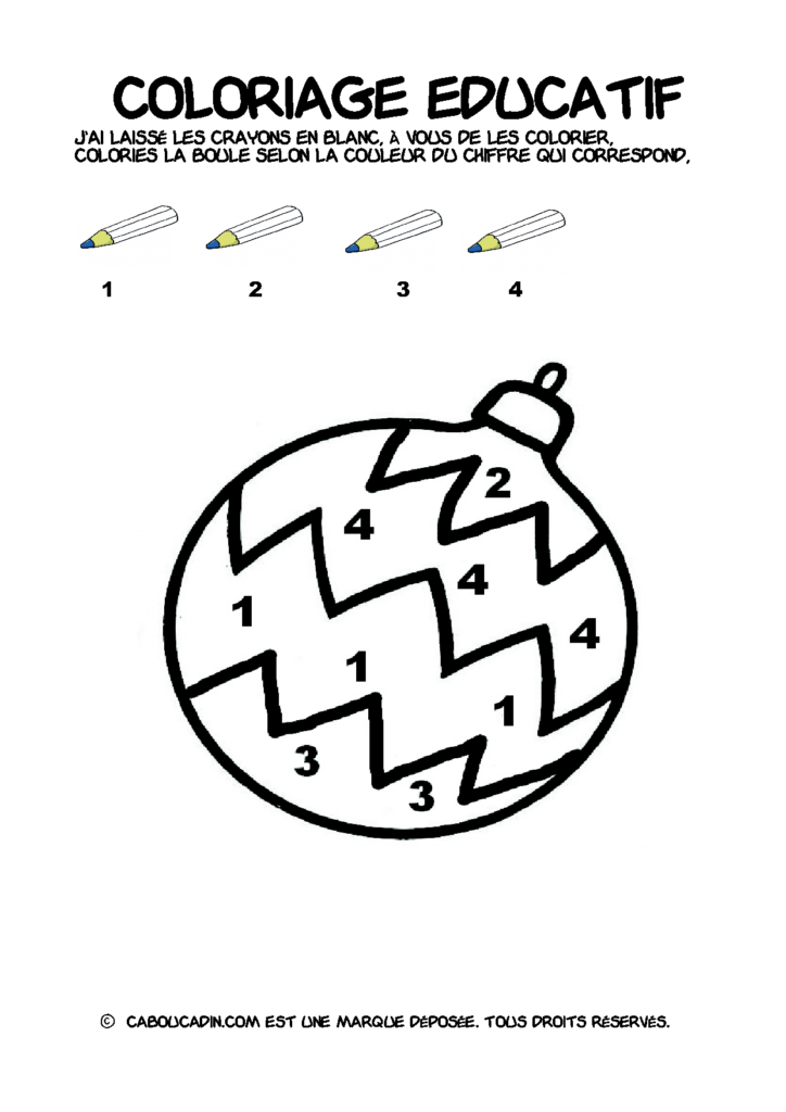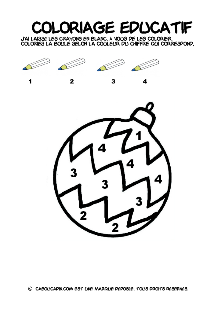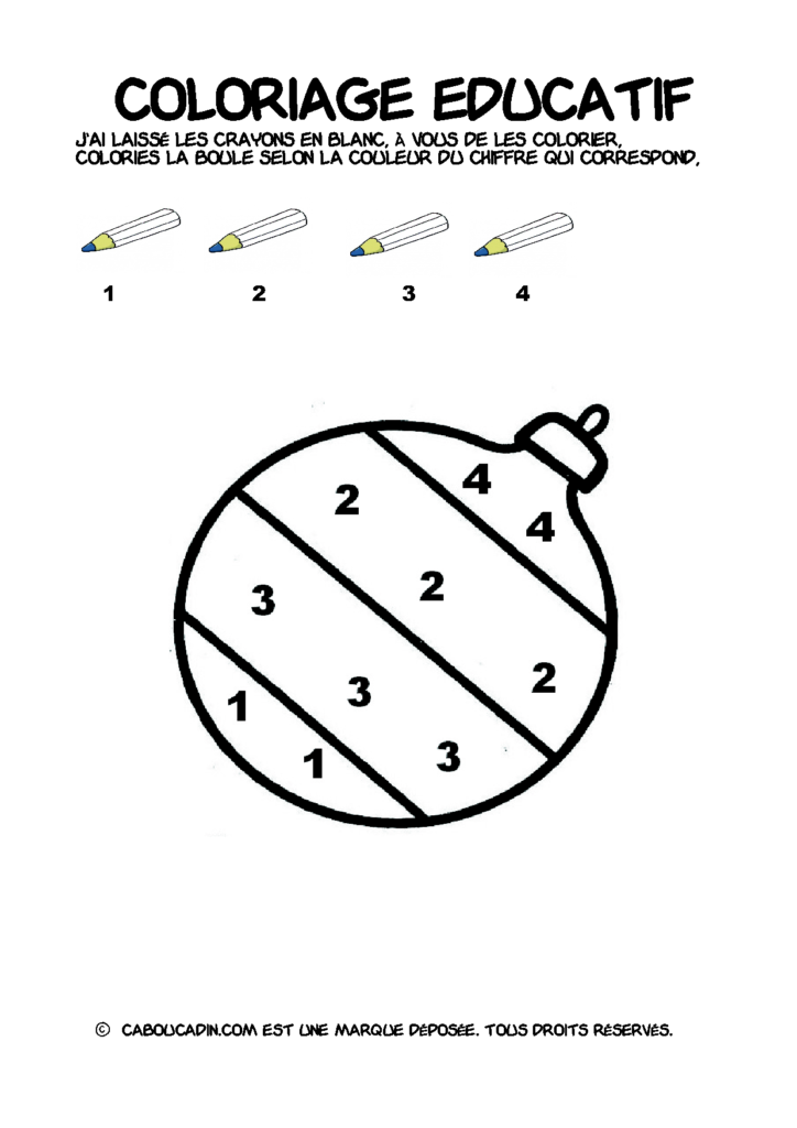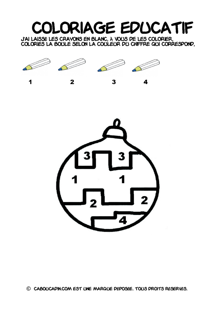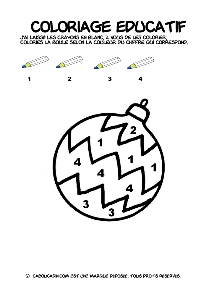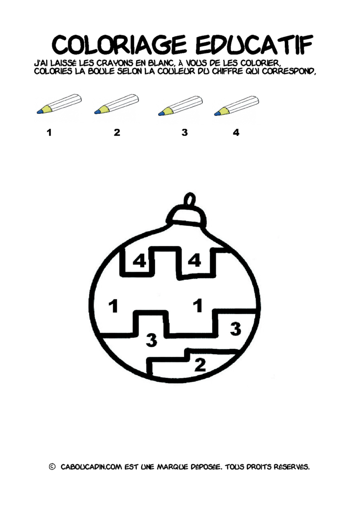 30 fiches maternelles Noël : Coloriages éducatif. Des coloriages éducatifs mathématiques à télécharger et à imprimer gratuitement. Le principe de la fiche est très simple, en haut de la fiche, il y a 5 crayons de couleurs avec en dessous un chiffre. Dans les boules de Noël, il y a des chiffres De 1 à 5. Chaque chiffre correspond à une couleur, à toi de les trouver et de colorier la boule de Noël de la bonne couleur.