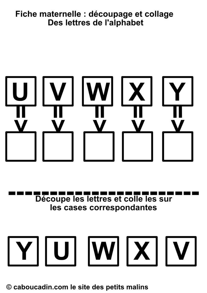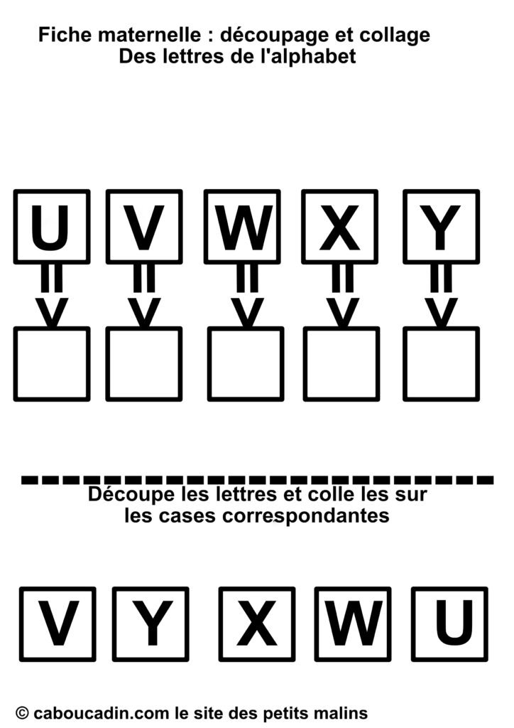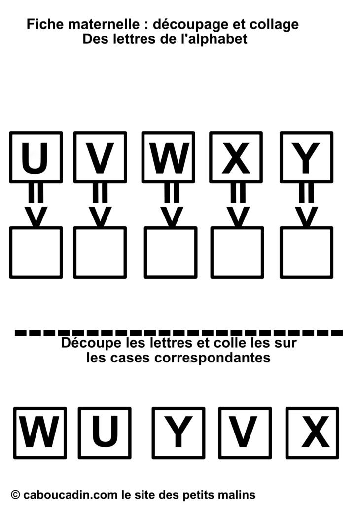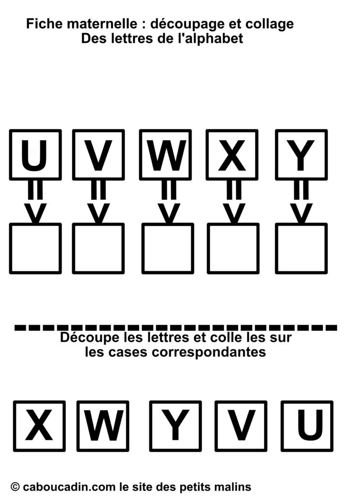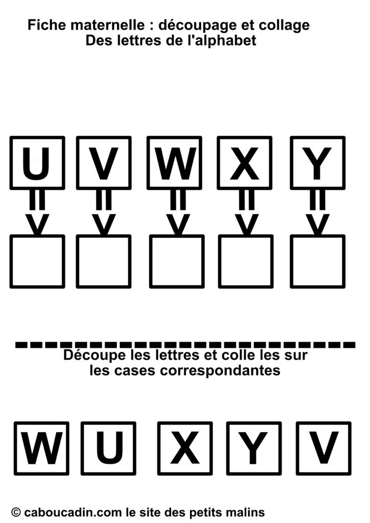 En résumé, cette fiche de découpage et collage est une activité à la fois simple et complète, qui mêle apprentissage des lettres et développement des compétences manuelles. Que ce soit pour compléter les apprentissages à l’école ou pour occuper les enfants à la maison de façon intelligente, elle offre une expérience enrichissante et ludique. Les enfants adorent jouer avec les ciseaux et la colle, et avec cette fiche, ils apprennent en même temps. Un vrai succès pour les petits de maternelle !