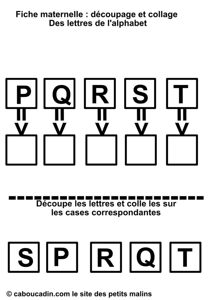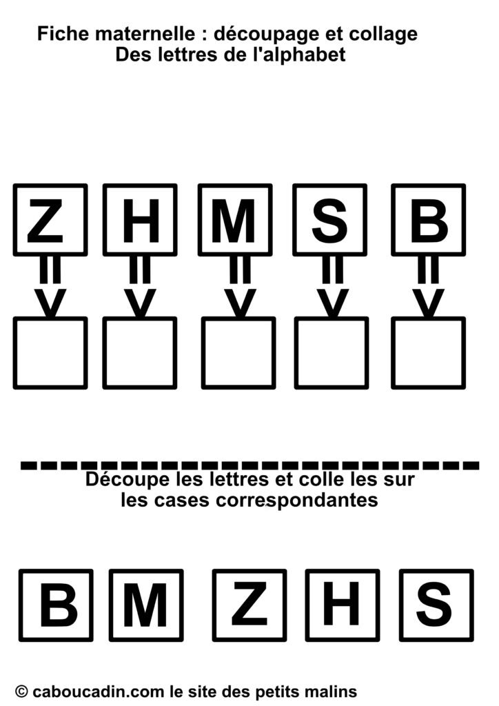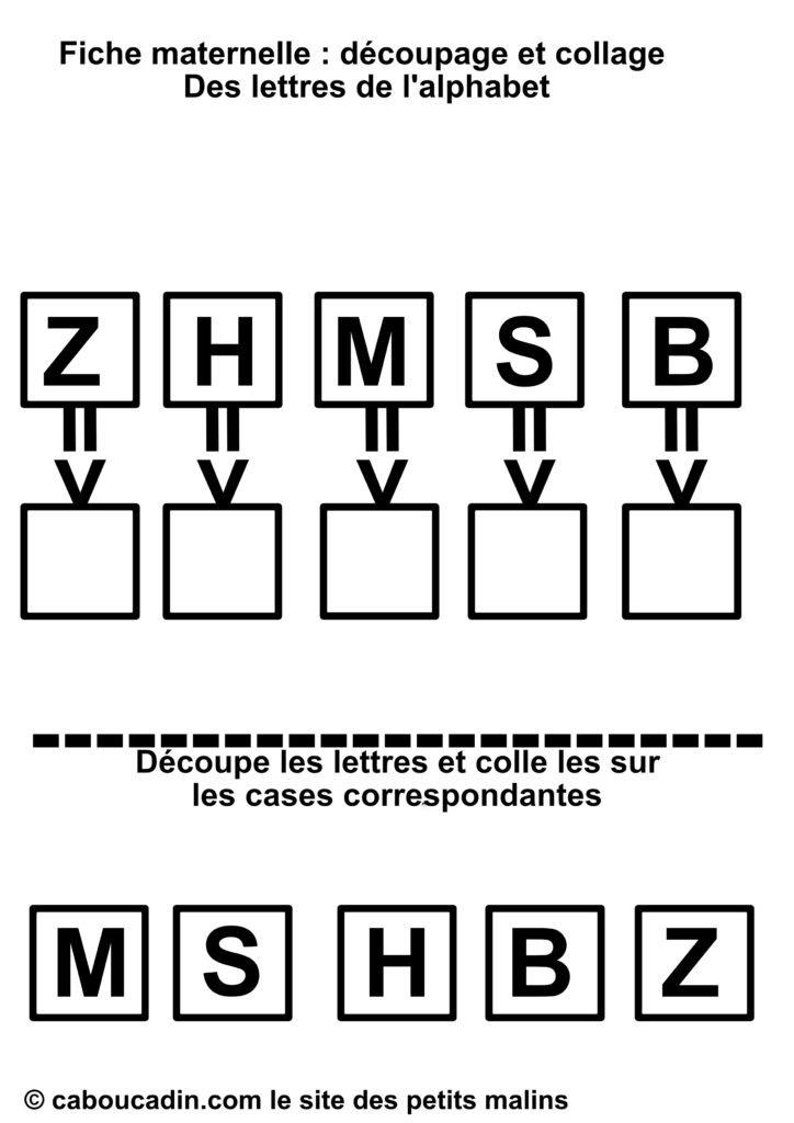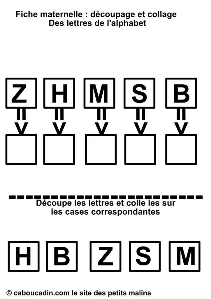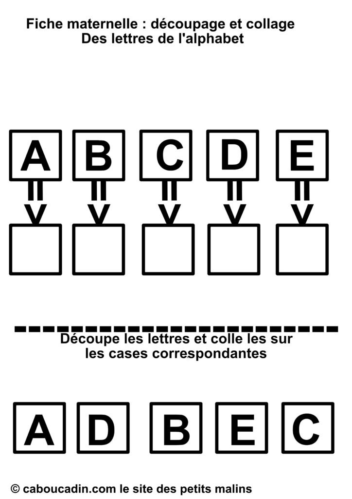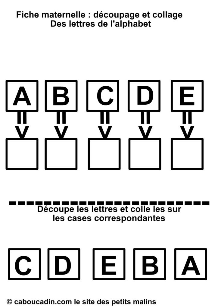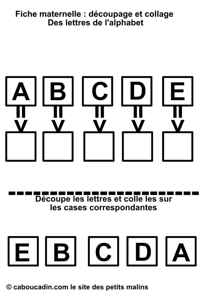 Un titre qui dit tout : « Fiche maternelle : découpage et collage – Des lettres de l’alphabet. » Dès qu’on pose les yeux dessus, le thème et le type d’activité sont évidents : apprendre les lettres en s’amusant avec des ciseaux et de la colle.