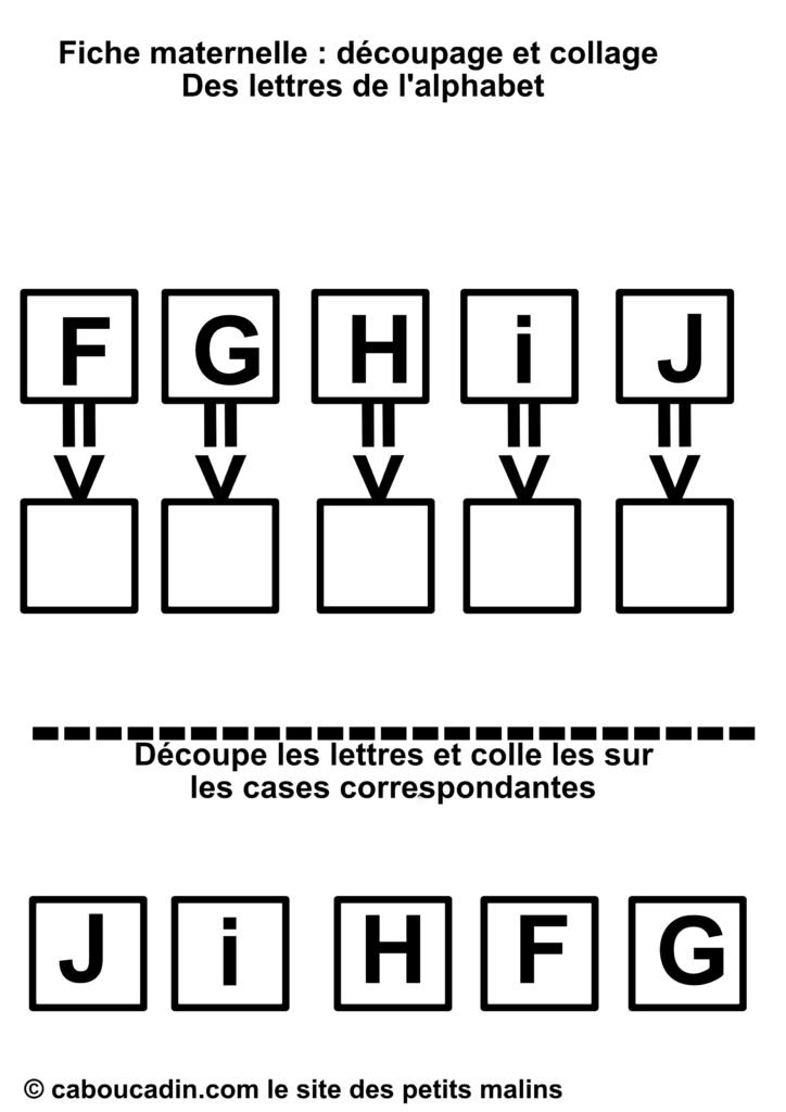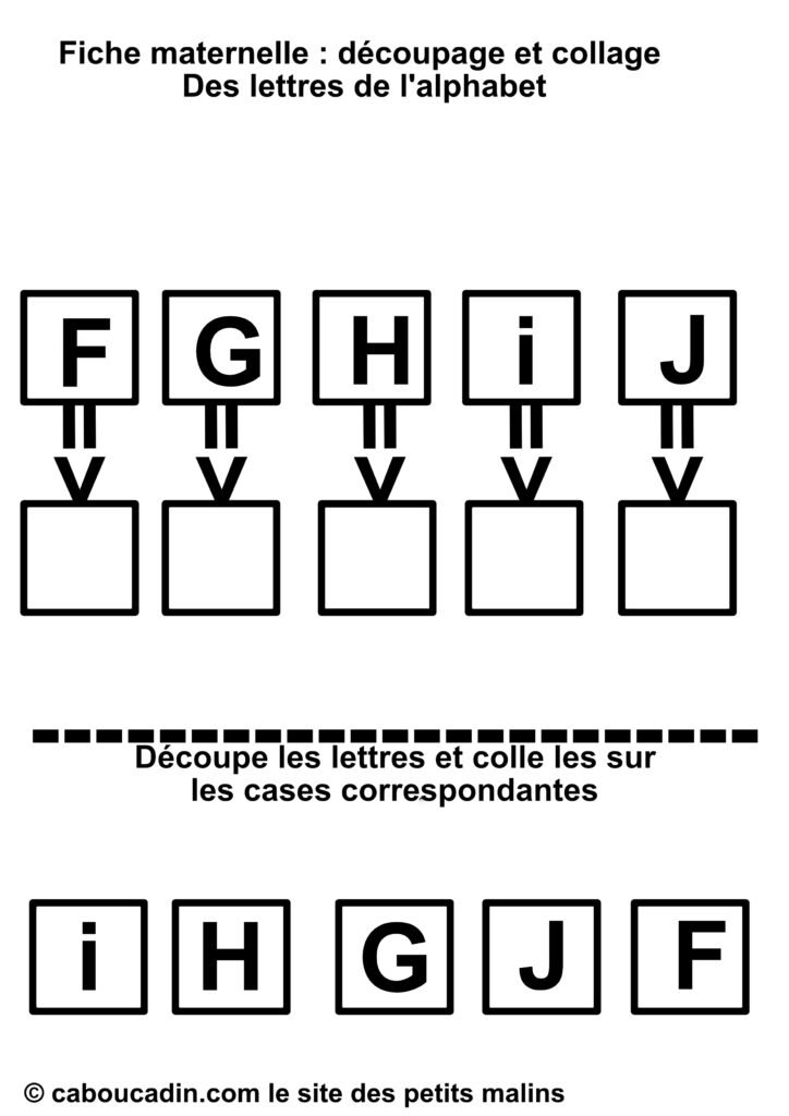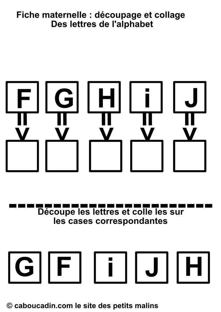 Des lettres bien présentées : Sur la première rangée, cinq lettres majuscules (F, G, H, I et J) sont alignées dans des cadres. Chaque cadre a un carré vide en dessous, relié par une petite flèche, montrant clairement où chaque lettre découpée devra être collée.
